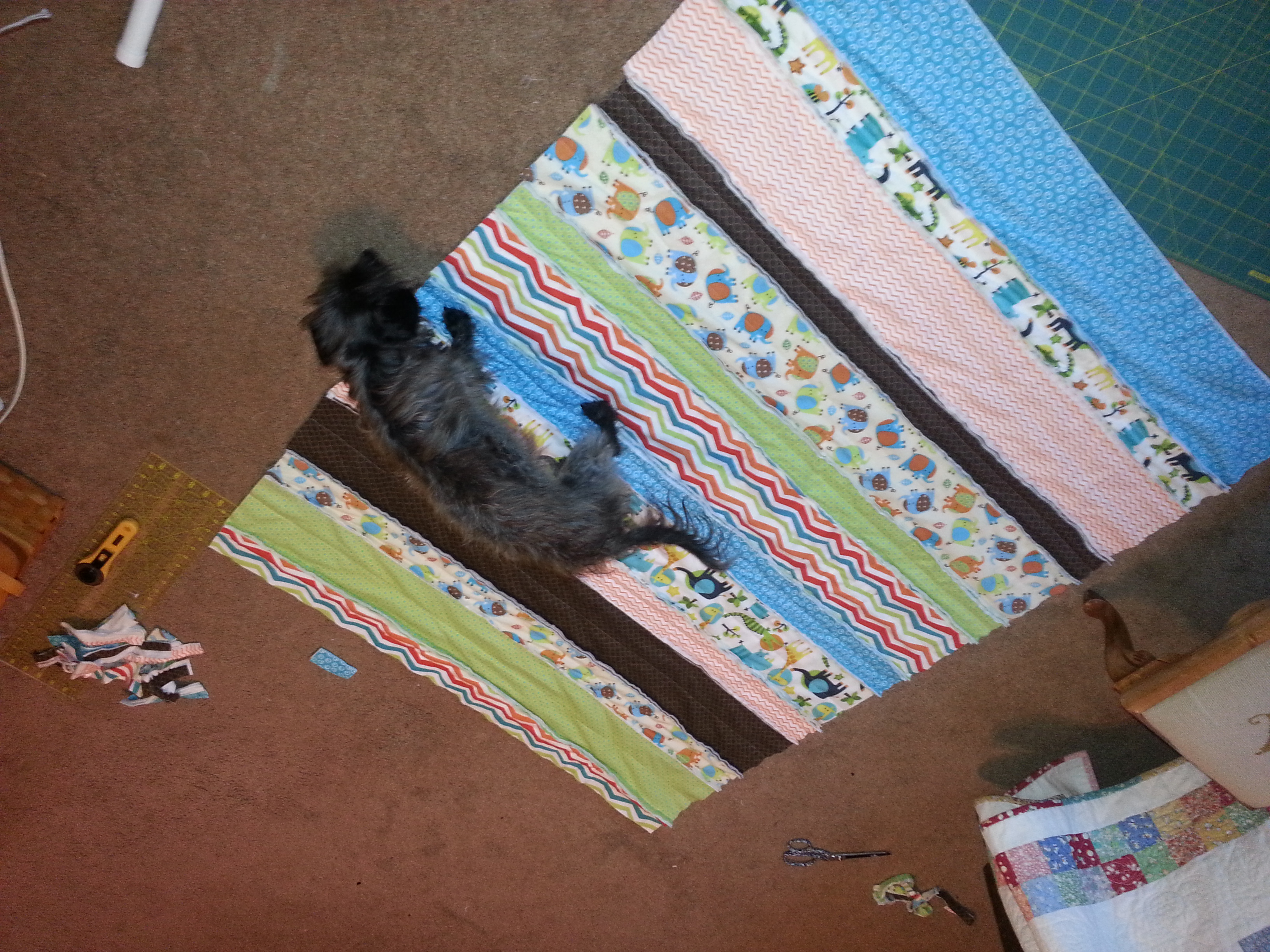 Pic 1- rag quilt about 90% compete, with my lovely assistant-Hector (doxie-poo) Pic 2- yarn wrapped letter for Eli or Ellie Pic 3-cosleeper sheet Pic 4- my "moby" wrap