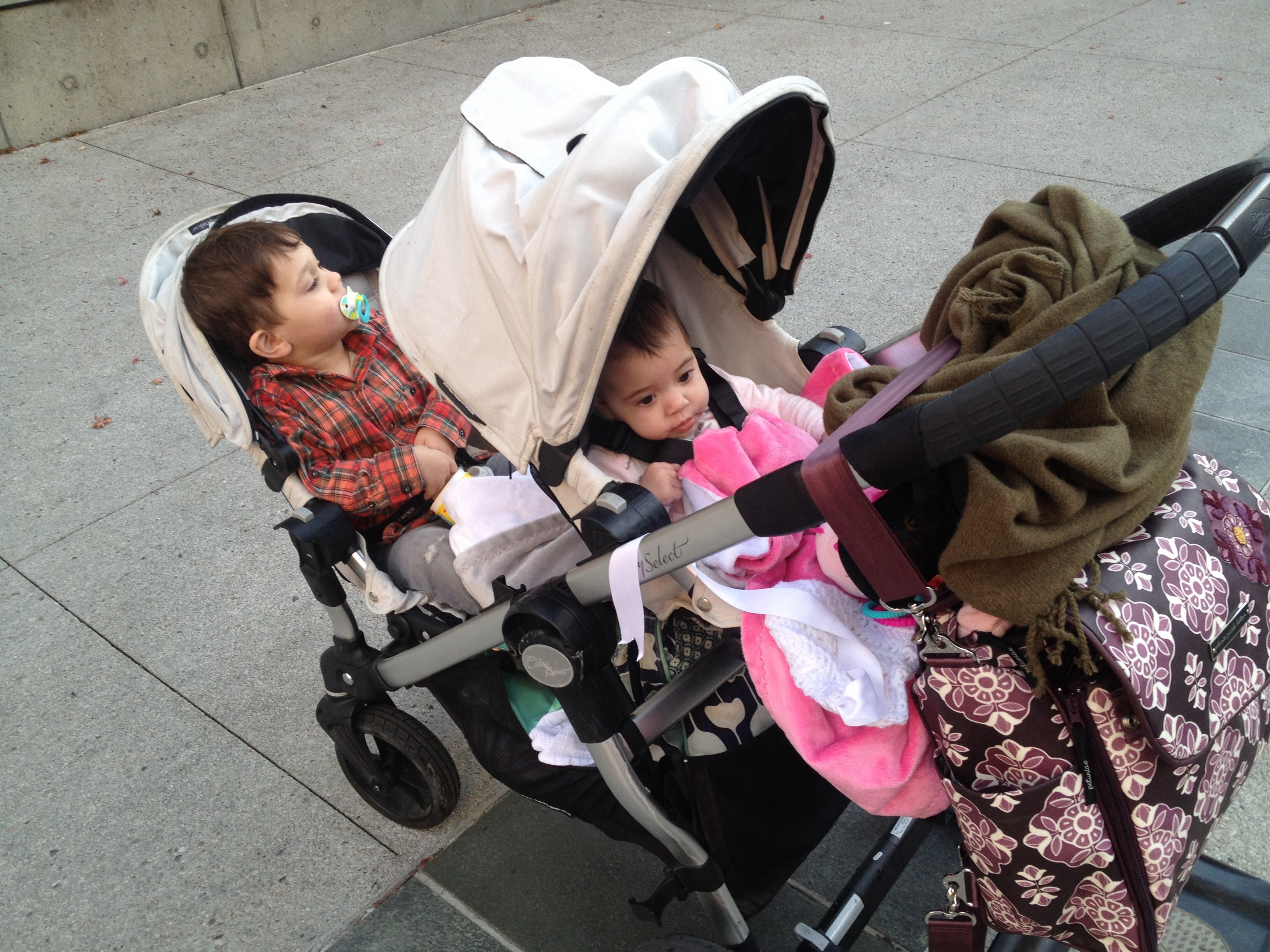 I have 4 under 4. If I go out alone, I use my baby jogger city select with the buggy board attachment. My son was 2 when he started riding on it. My four year old doesn't need to be in the stroller, so I put both infants in it. And my son on the board.