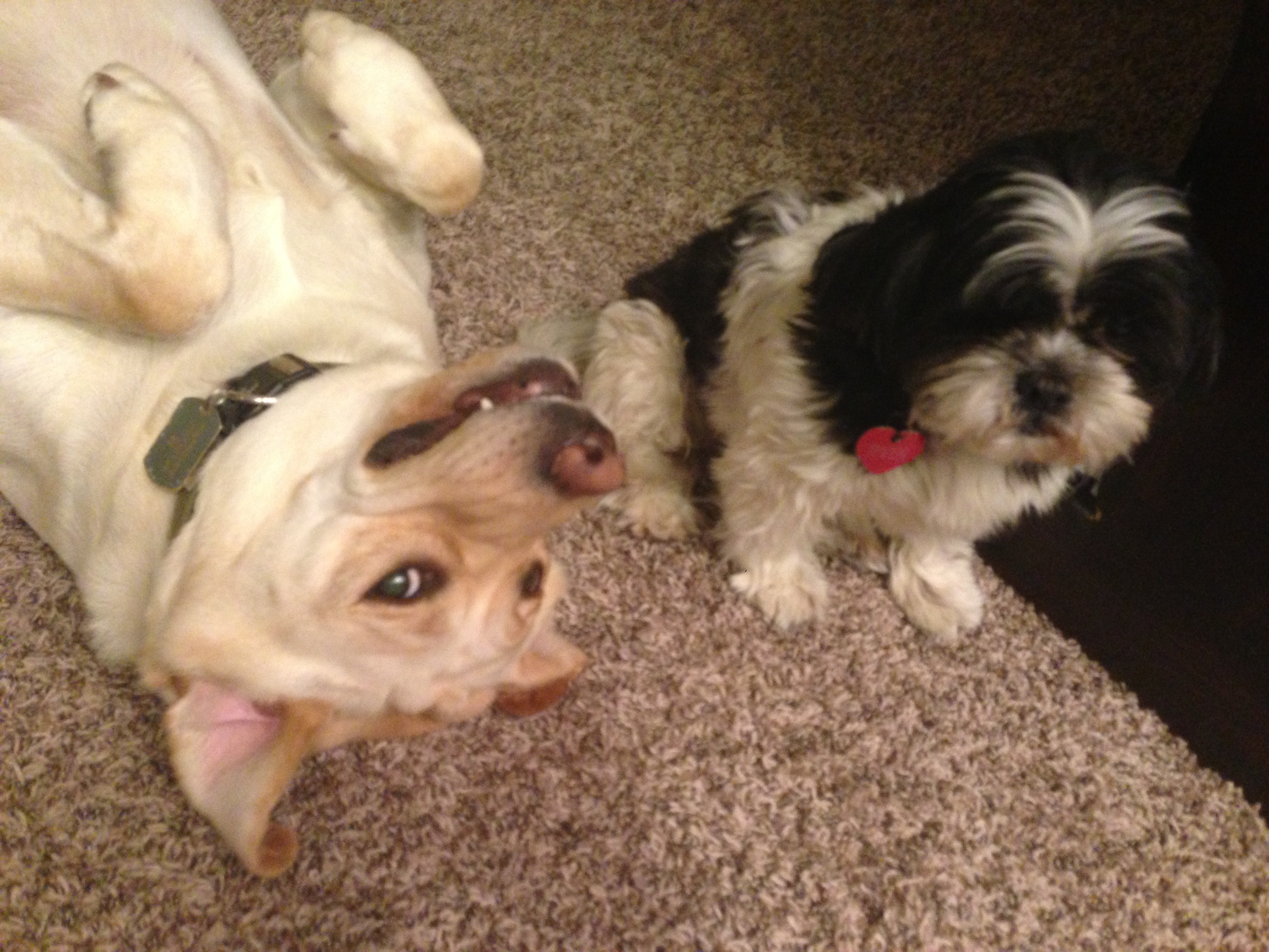 This photo cracks me up. It shows their personalities so well. Ink is our 100lb white lab. And River is our 10lb shih tzu. Loves of my life/pains in my butt.