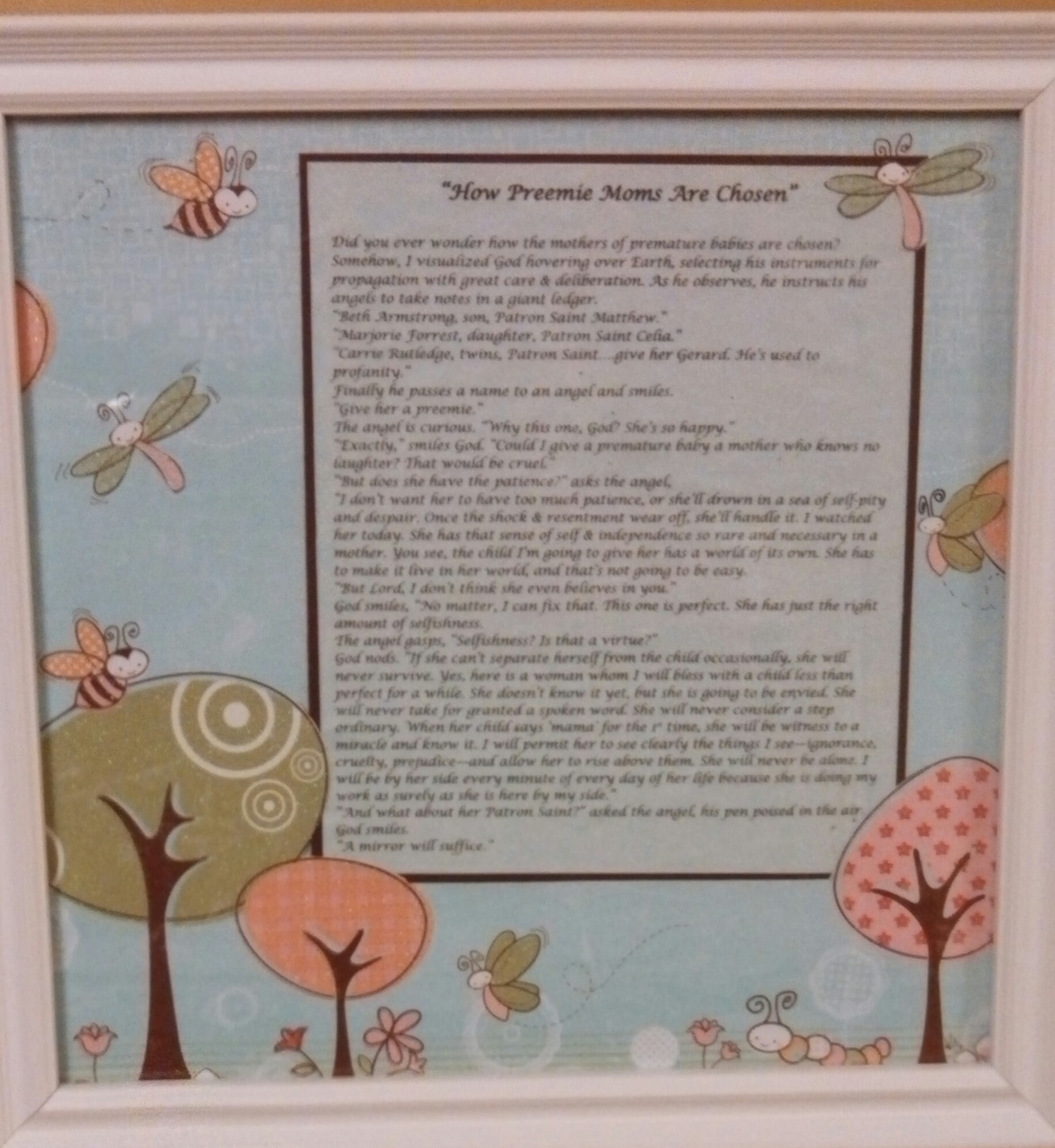 My mom gave me this poem done up very nice and framed today when she came to visit us in the NICU. It was a very touching and meaningful gift. This is the poem:
