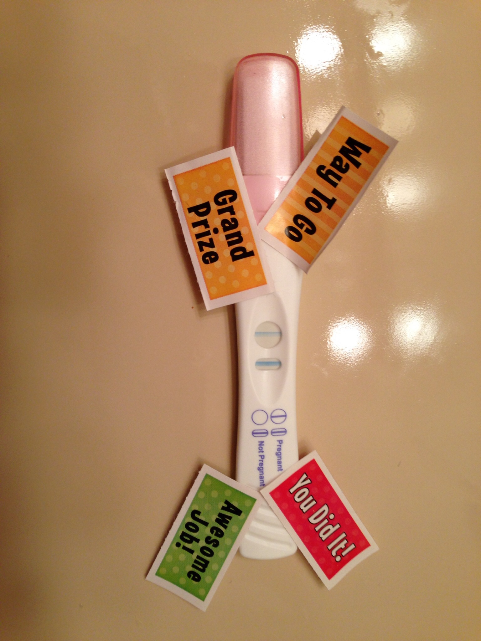 • With my son, I wrapped up a tiny pair of newborn shoes with mushrooms on them with the pregnancy test. This time I was going to get another pair in a different design, but we got pregnant so quickly that I had nothing. Instead I put an Eviction Notice on my sons crib. It was cute.