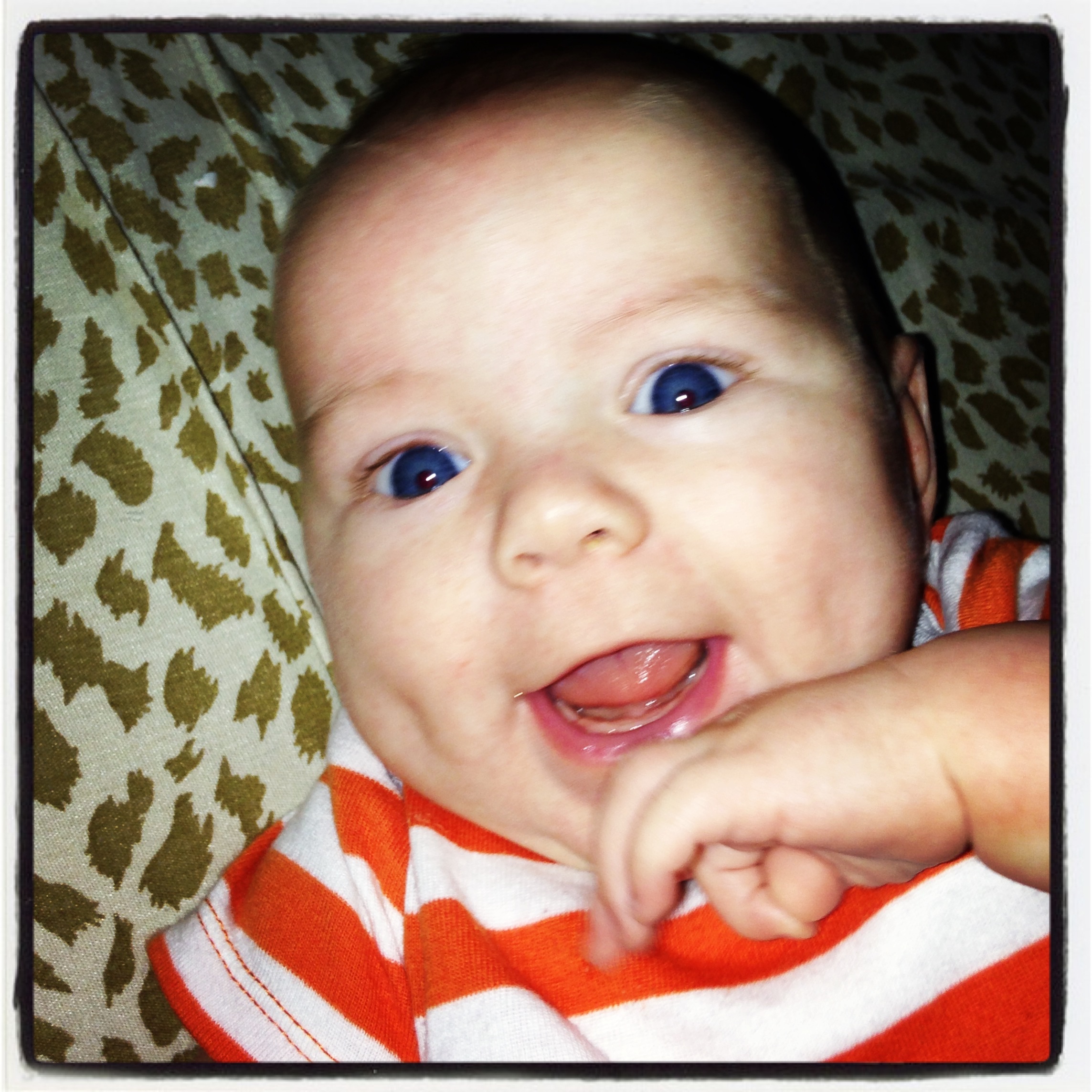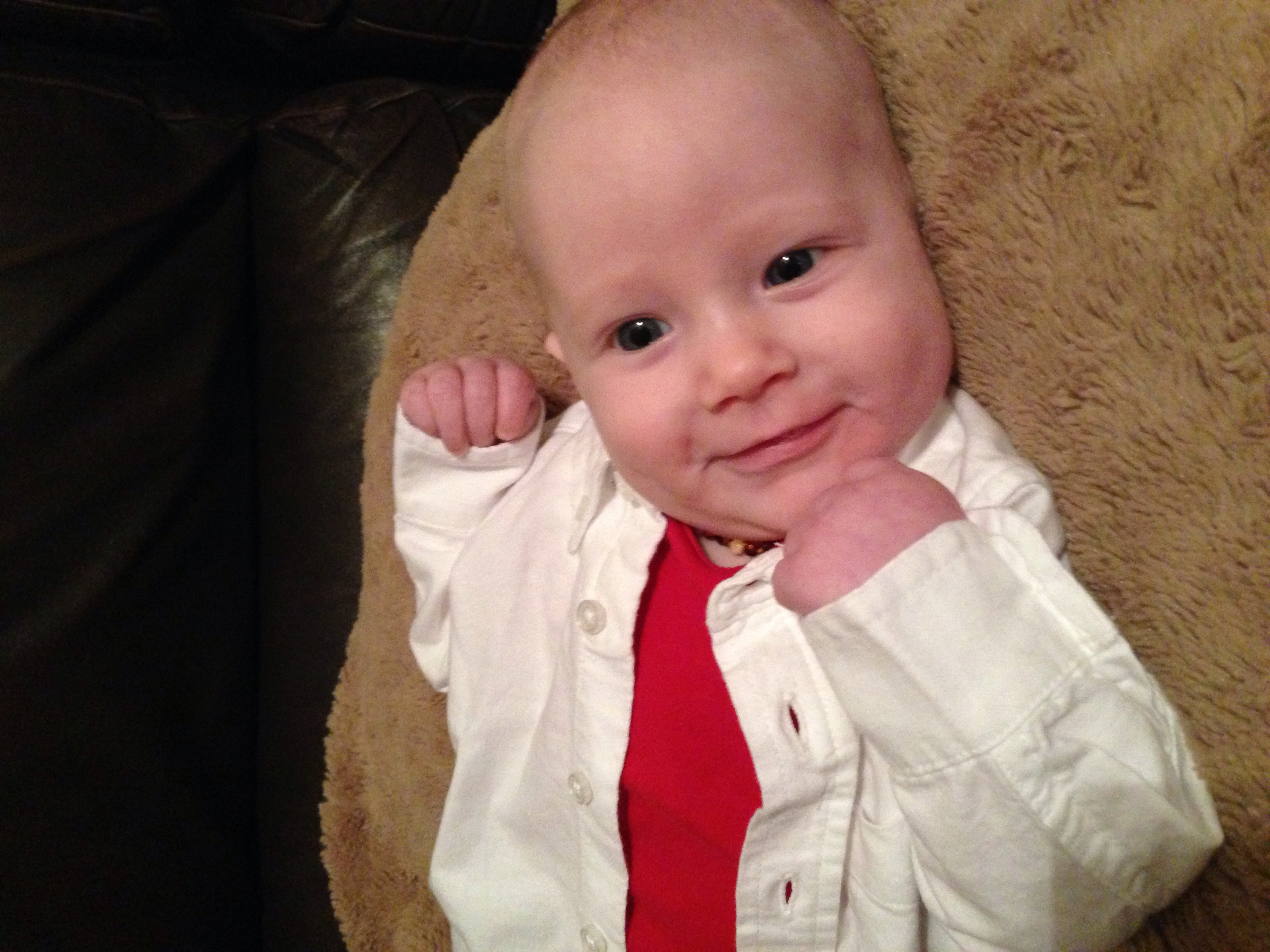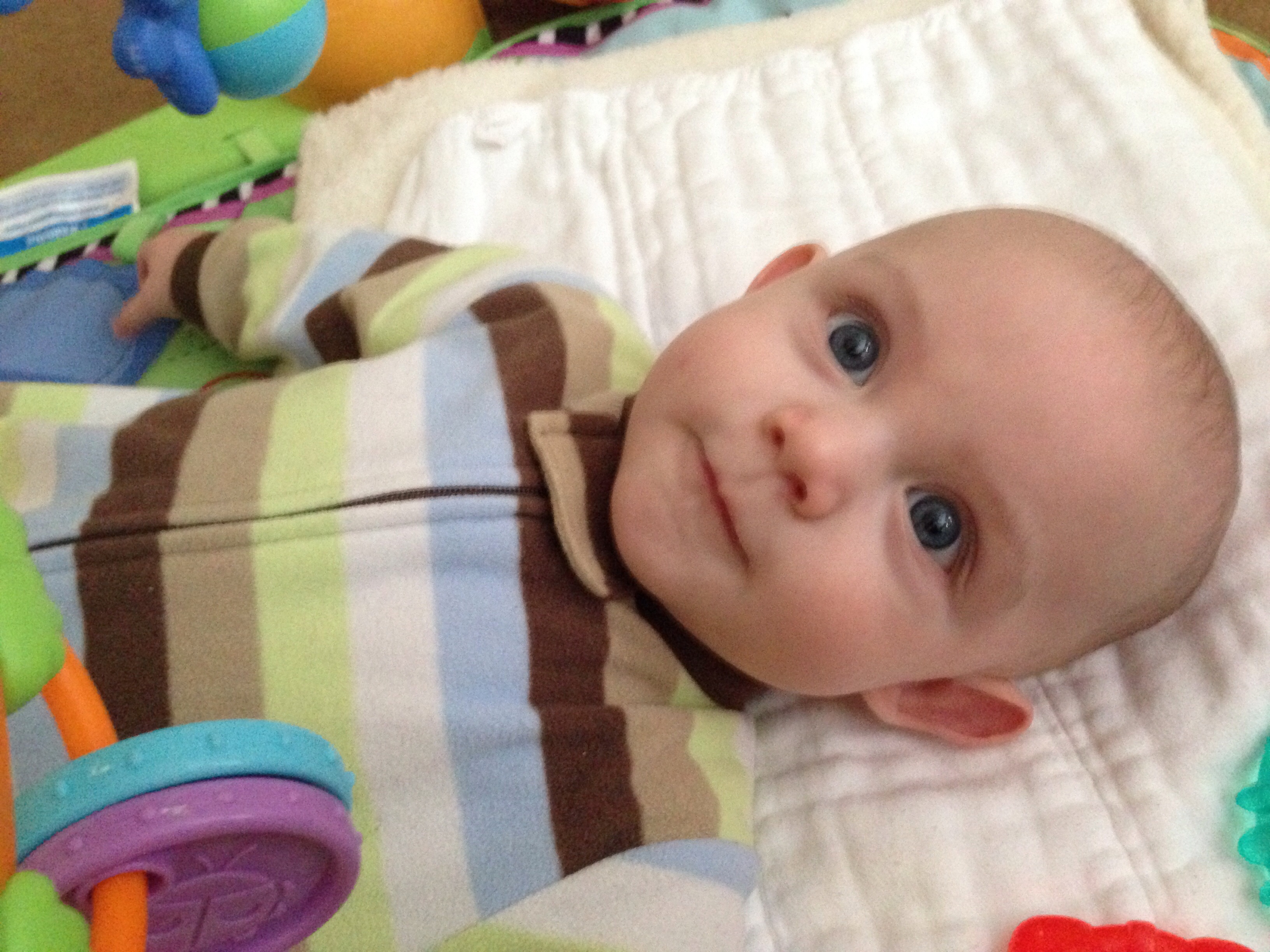 Cooper will be 4 months on the 11th. He has just started to really recognize brothers and sister and smiles when he sees them. He has a new super tooter - super power. His farts will make you disappear .