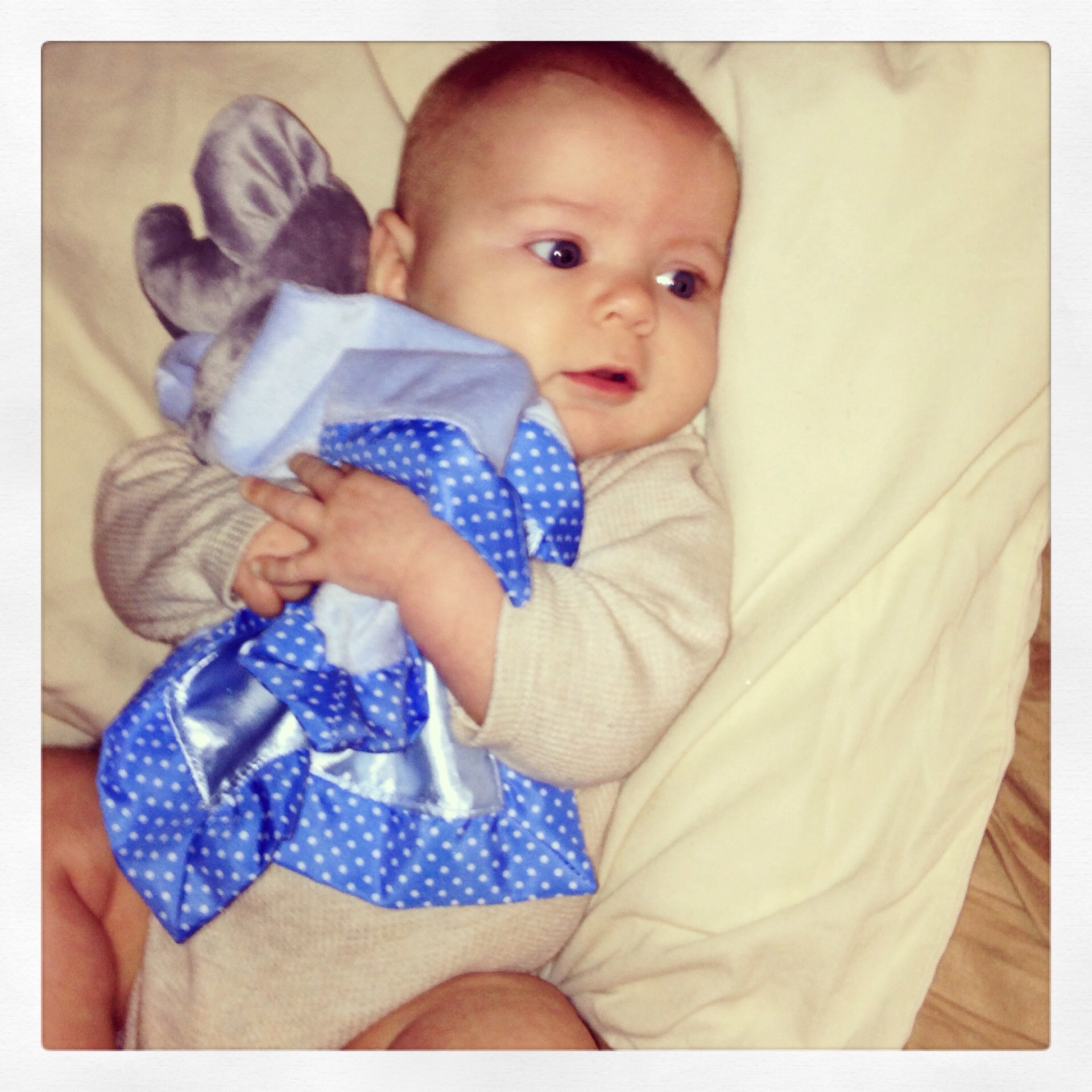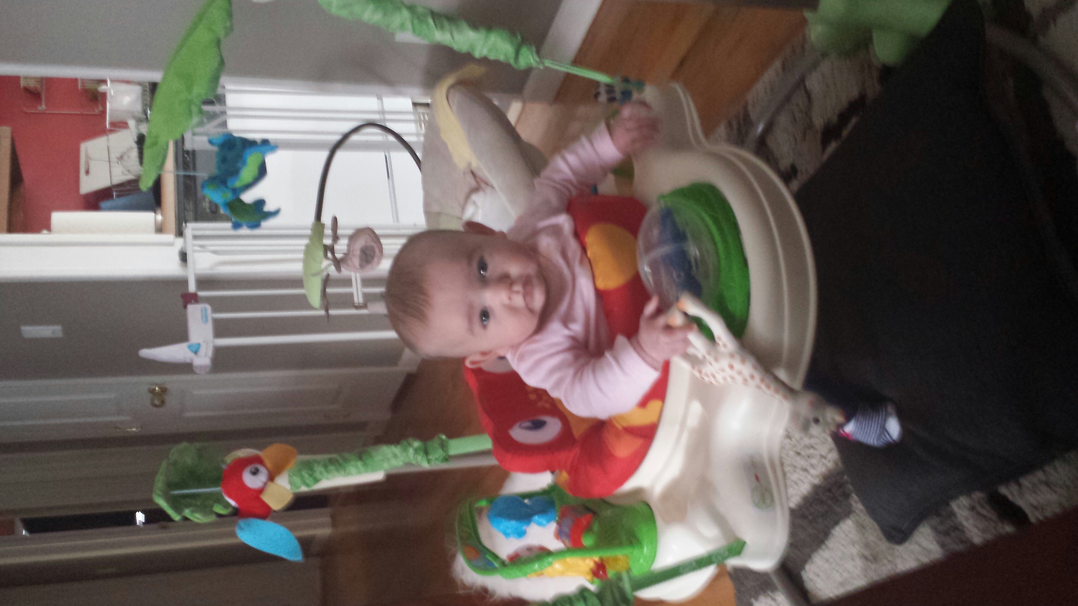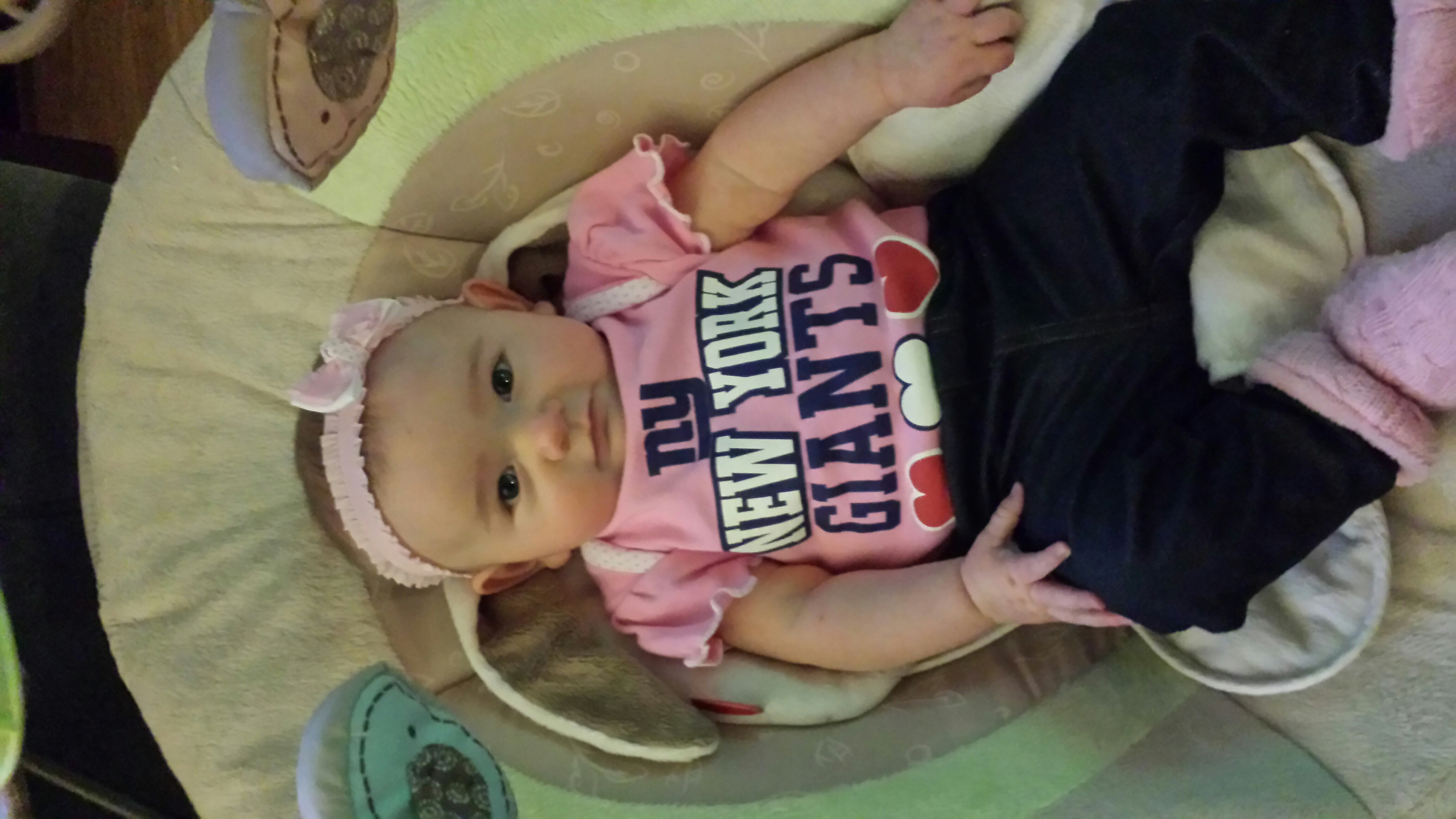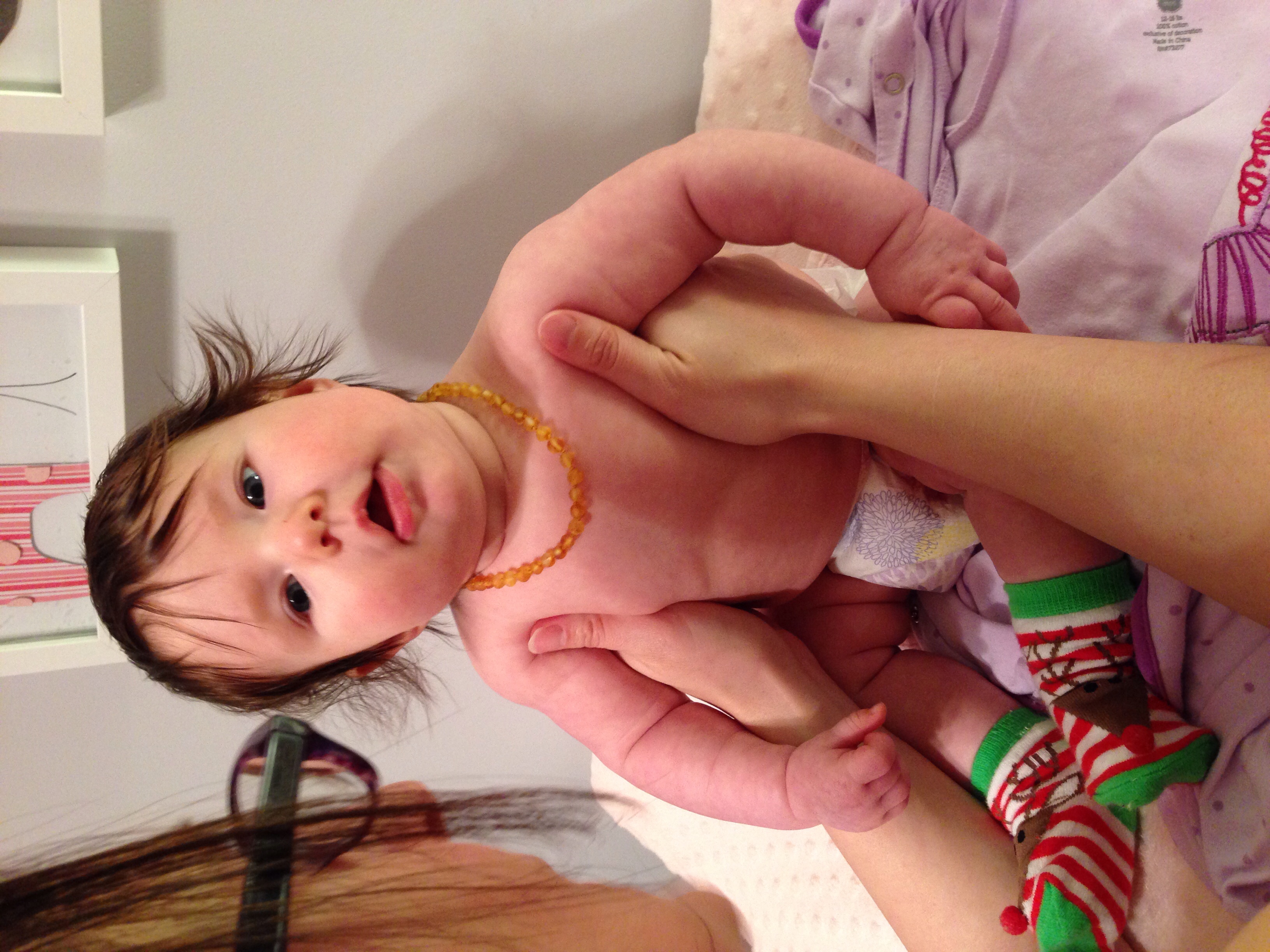 Eleanor just turned 15 weeks. She has started teething so we are hoping the amber necklace is truly magical. Her only super power is waking up the minute I set her down.