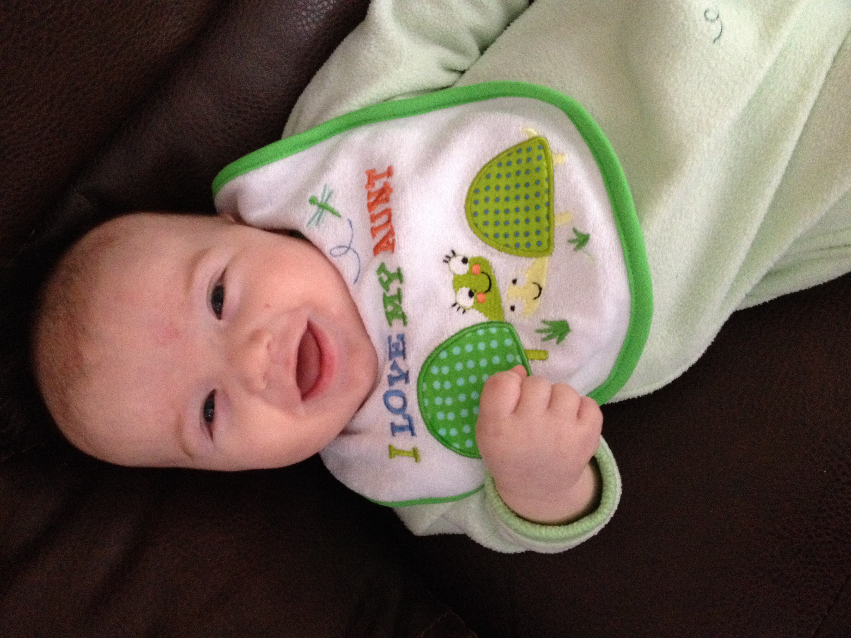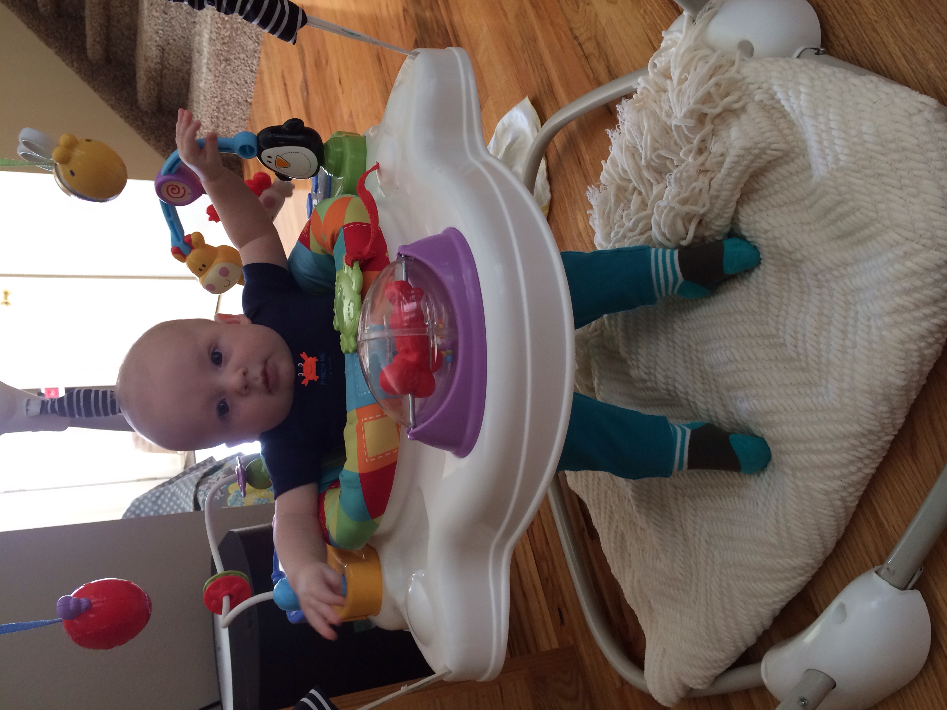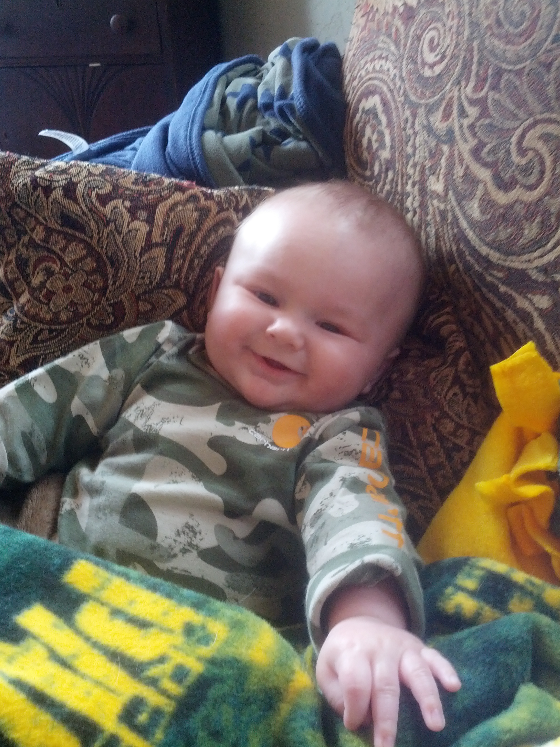 Brody is 16w today and isn't doing anything new really. He laughs constantly, is always smiling, has a hand in his mouth and blowing spit bubbles. He rolls over, but doesn't do it when you're looking. He's spotted his feet, but hasn't figured out how to get ahold of those bad boys.