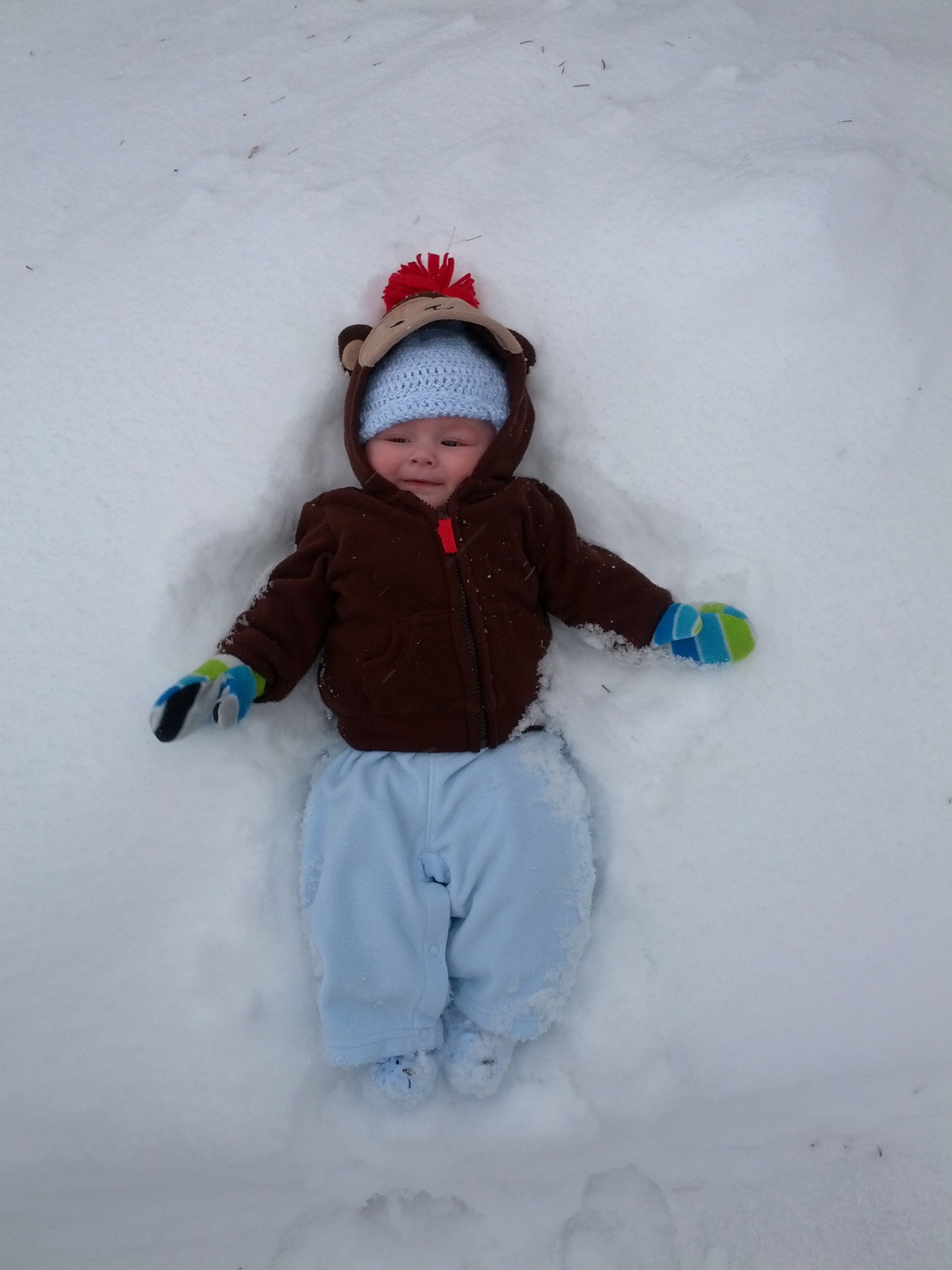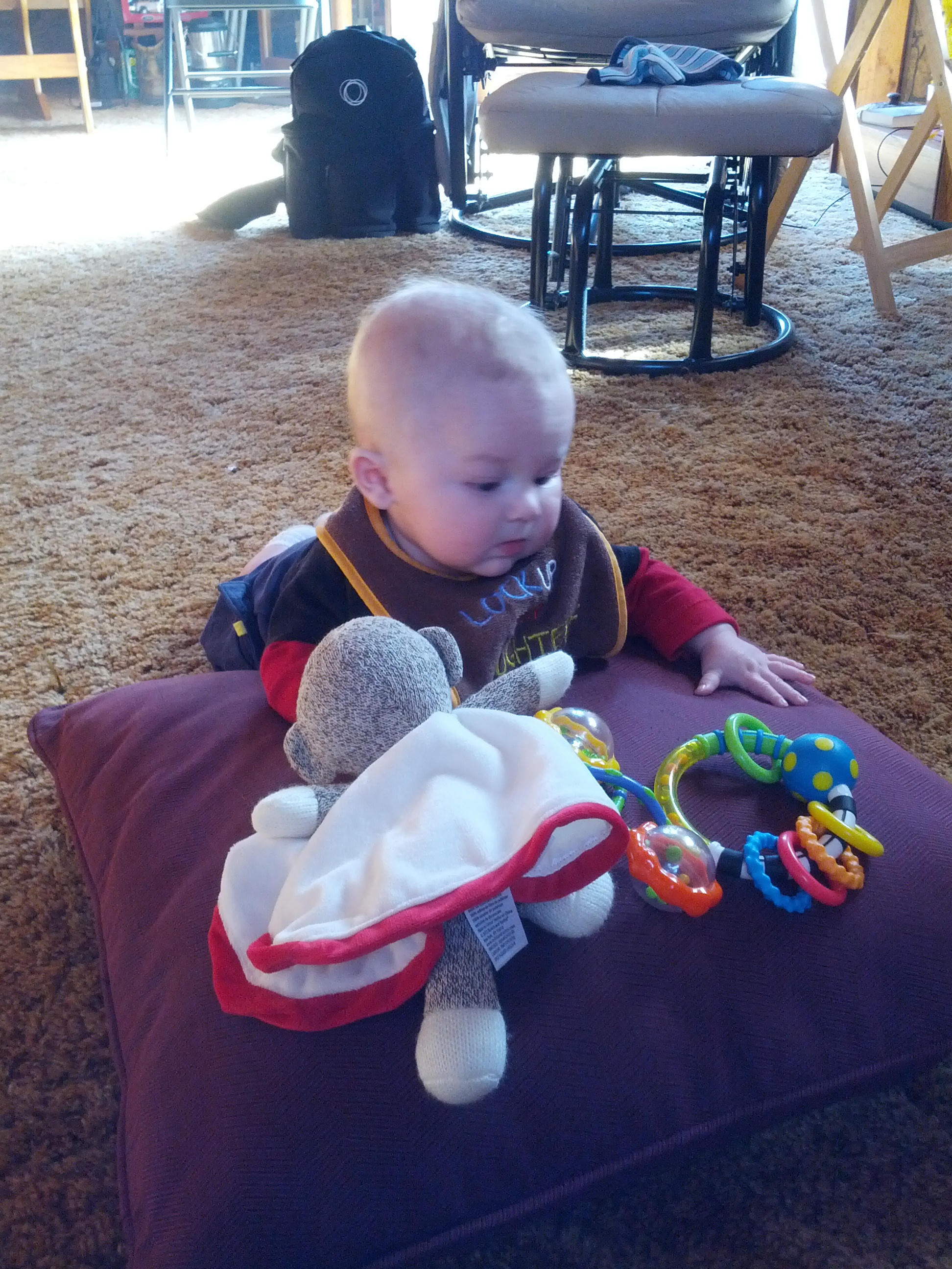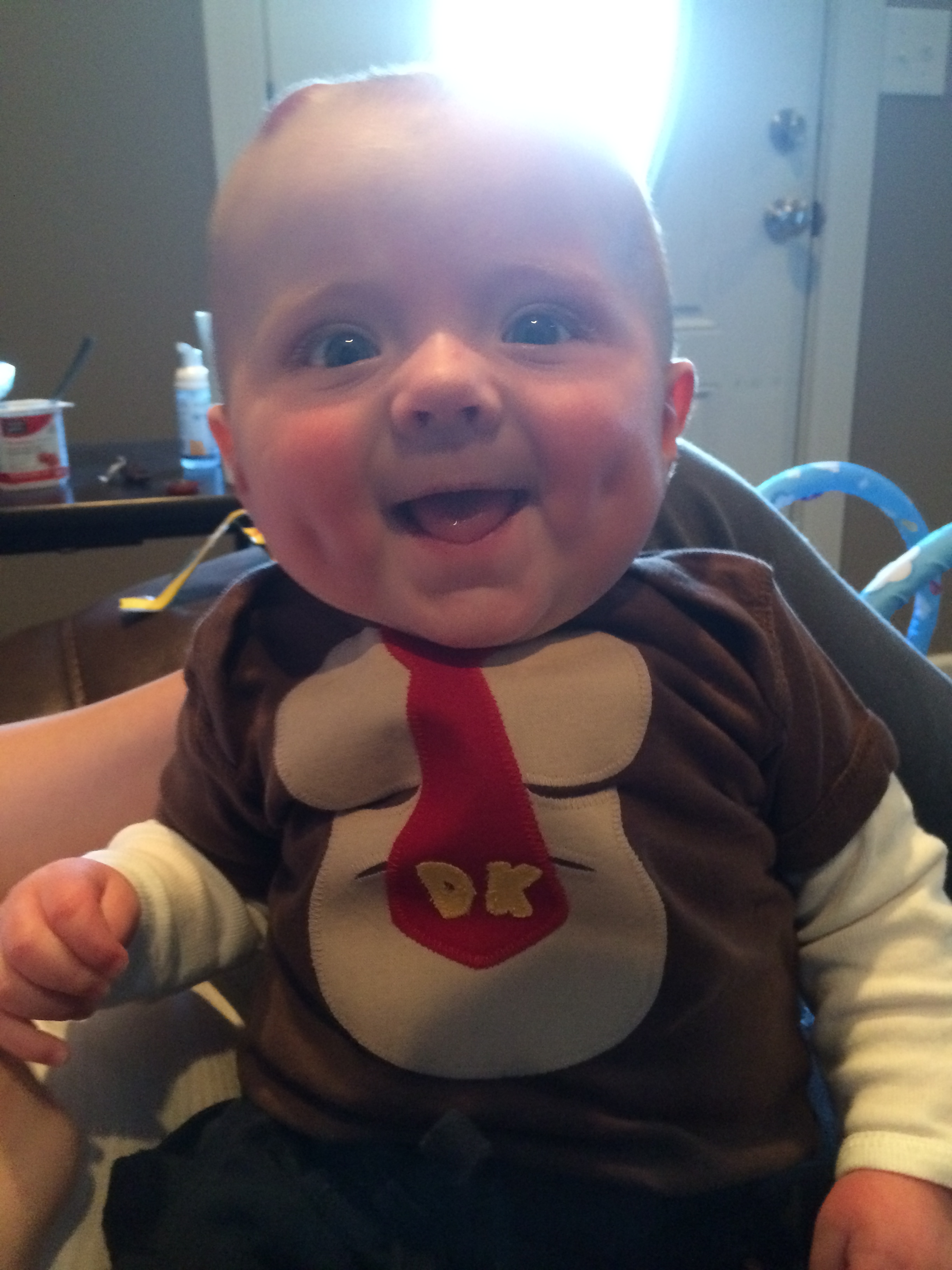 Brody is 16w today and isn't doing anything new really. He laughs constantly, is always smiling, has a hand in his mouth and blowing spit bubbles. He rolls over, but doesn't do it when you're looking. He's spotted his feet, but hasn't figured out how to get ahold of those bad boys.