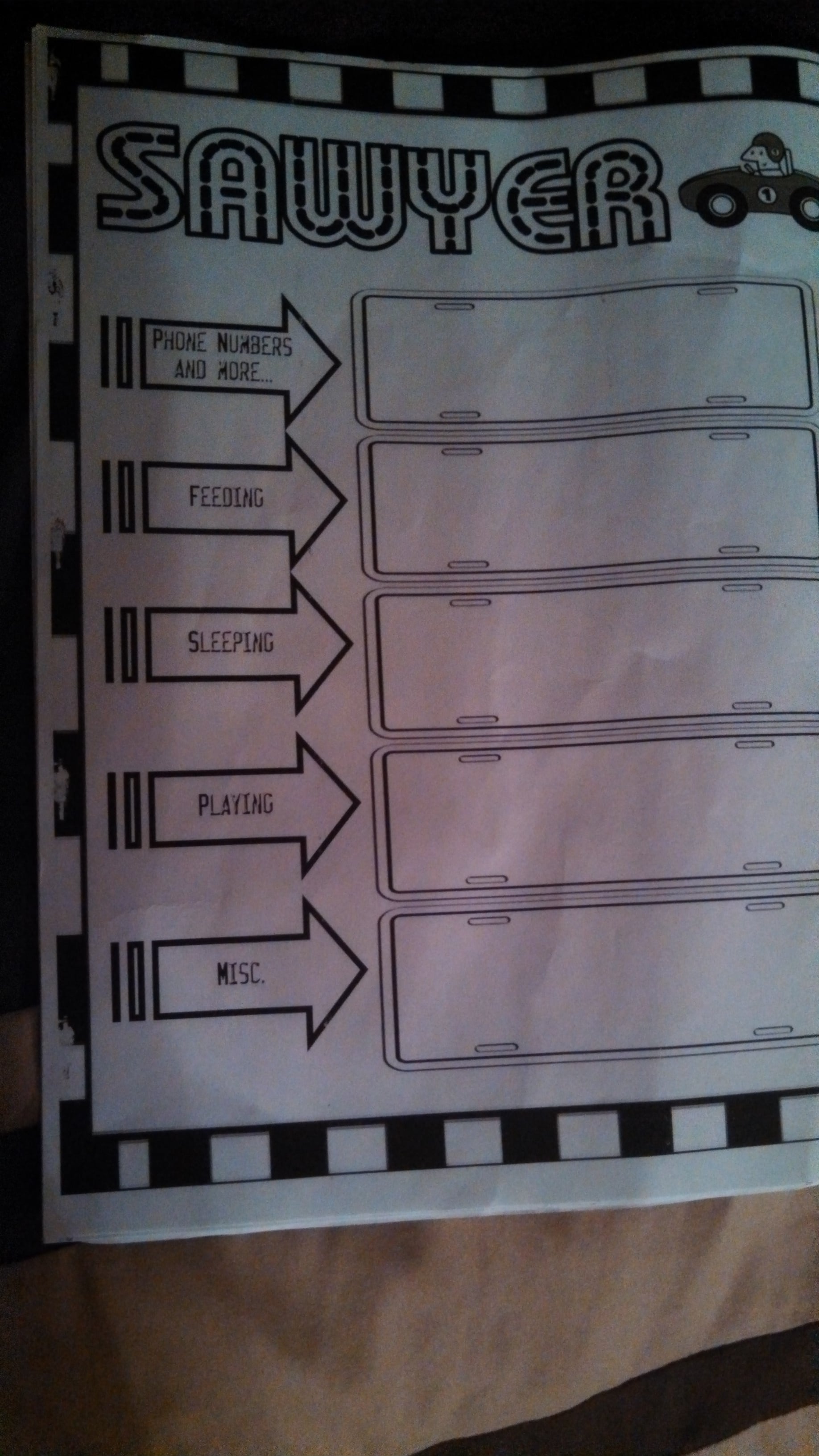 I write all emergency numbers + pedi. Number, I write down when and what they eat (now for DS1 it just says can eat whatever.. but there was a food allergy or something it could go there) for playing it would have things like tummy time or songs that you sing to lo, sleeping could tell them how lo likes to sleep (swaddled, rocked, etc.) Misc information could be any medications or special notes. I leave pumped breast milk so I also have several copies of bm thawing, serving directions. You can print so men off of the medela website and several other places too, I'm sure.