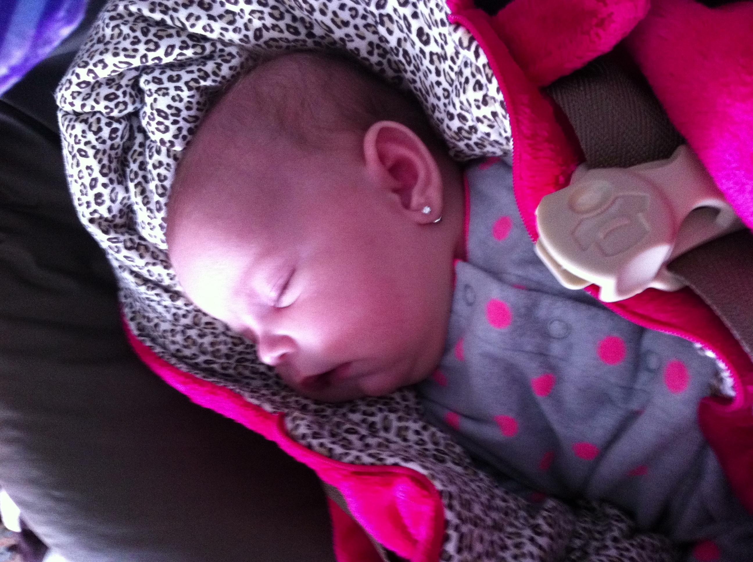 Please don't flame me for getting her ears pierced at such a young age it's a family tradition. My 4 sisters and I all got ours done when we were 8 weeks and and so did my 5 nieces! We went as a family to get them done. :-)