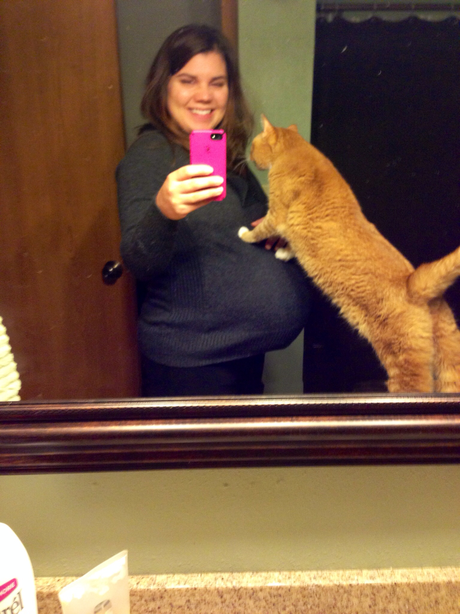 40 weeks 4 days- baby didn't want to use his January DD so we moved on to his February one. He didn't want to use that one either . Apparently my cat Leo is just as anxious for LO to come out too, hence the photo bomb!