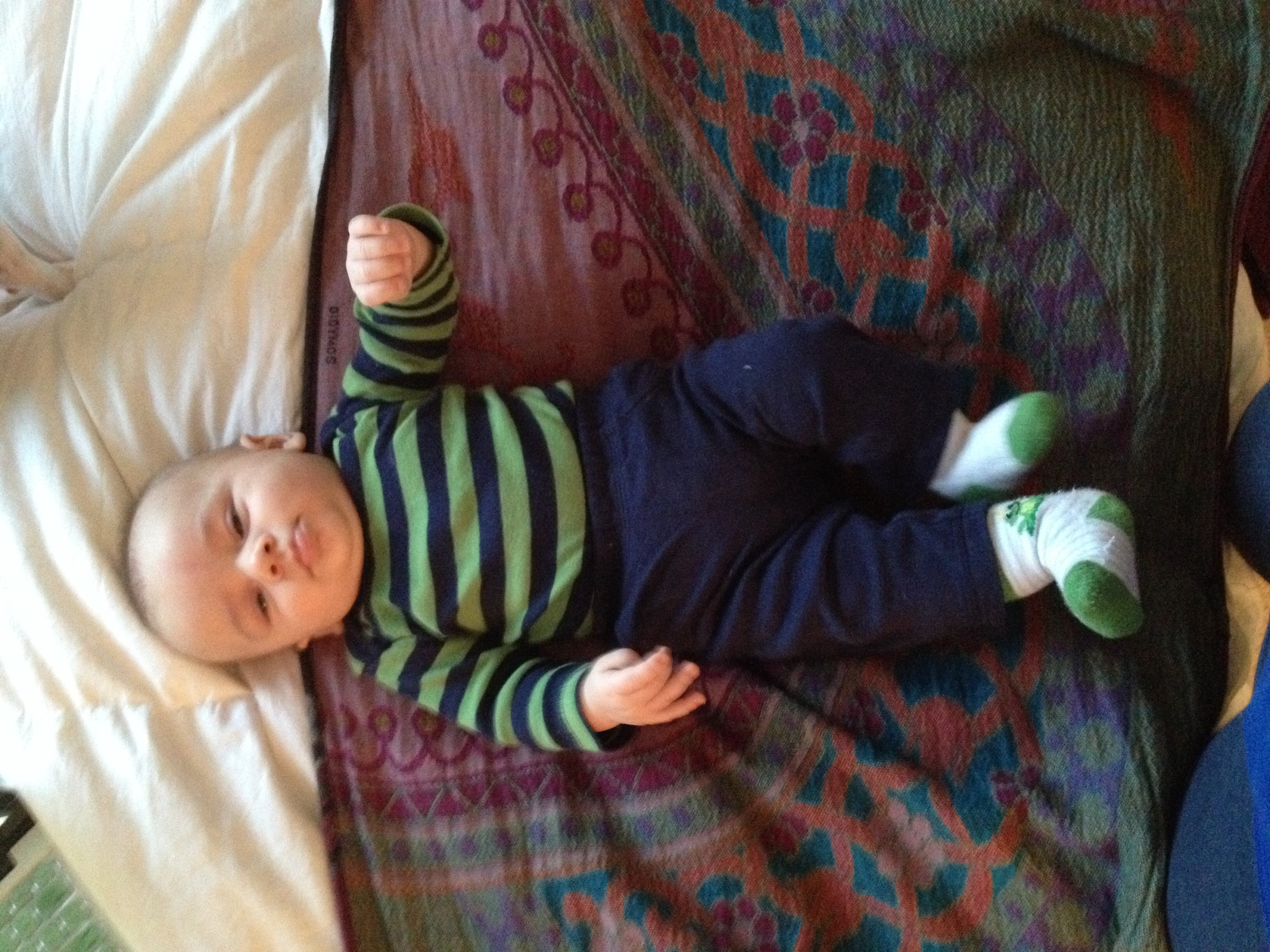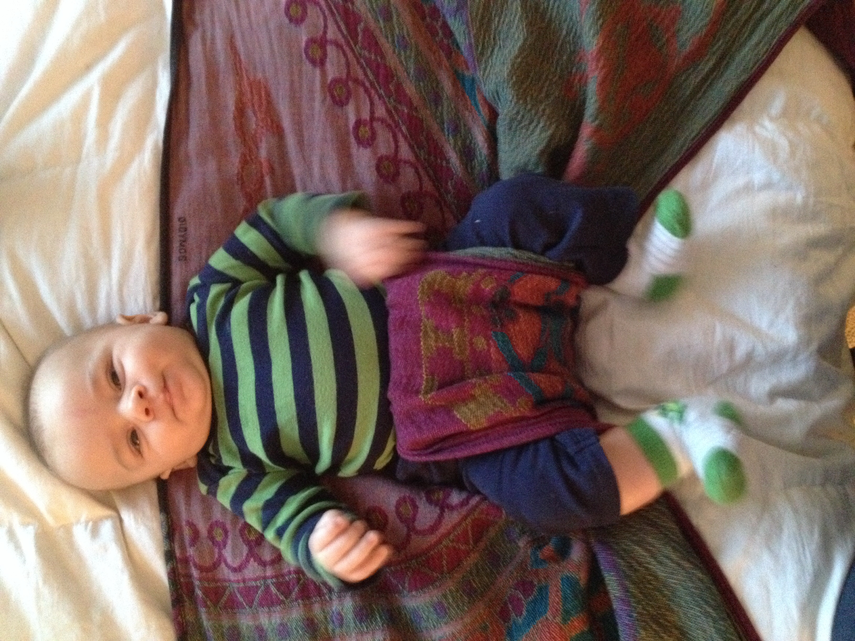 Few tips- See how her legs hang down, ideally, you want to create a deep seat for her so her knees are above her bootie. Heres the trick- lay the wrap on your bed, place LO in the middle marker spot, tuck the wrap between her legs and into the waistline on her pants. This will give you a sturdy seat for you to work with. Let me take a quick picture with my LO to show you…