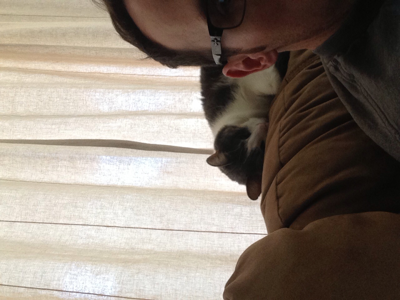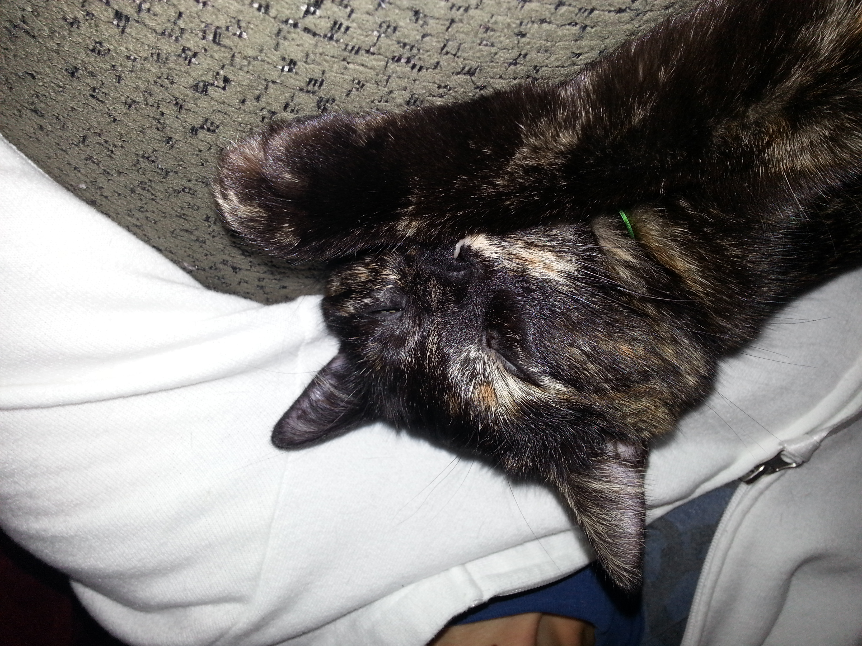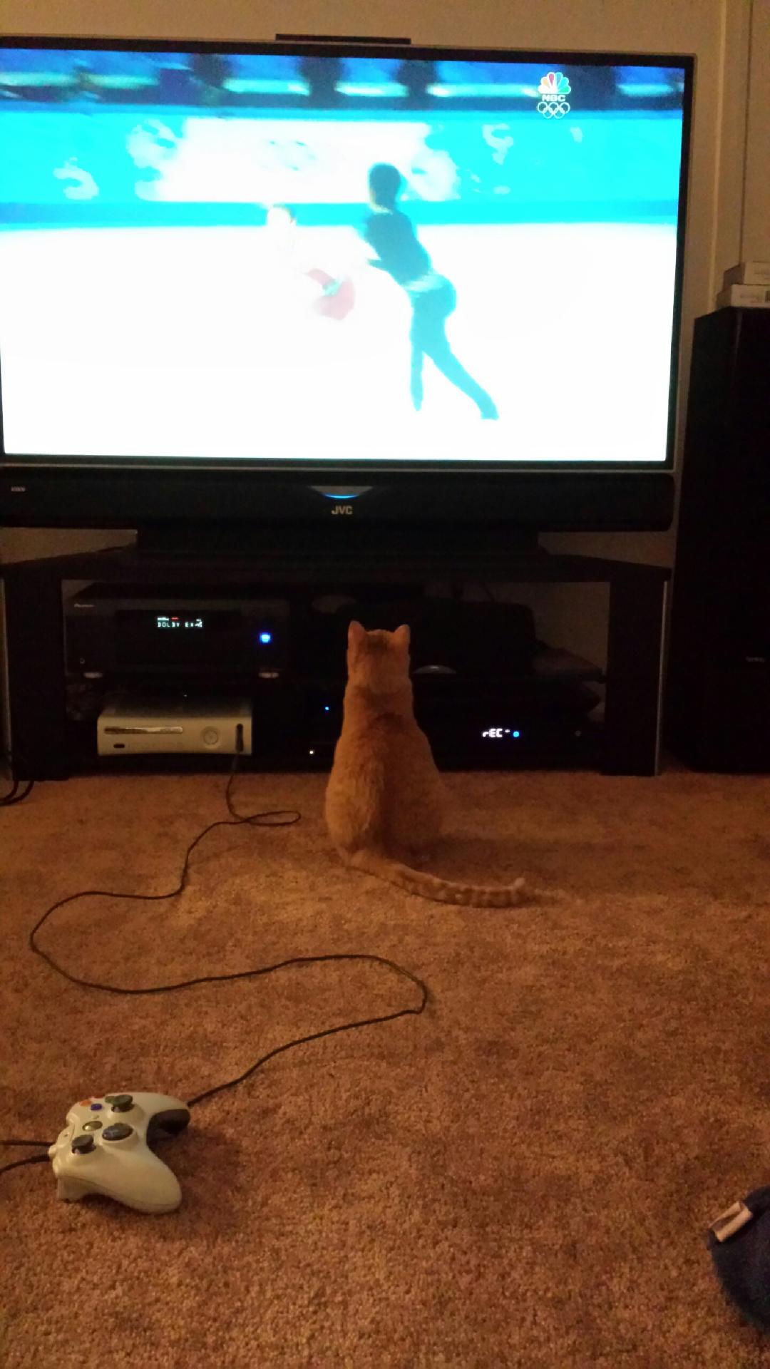 • Snuggly Minko (not sure why its upside down) & the kitty In front of the Tv is my brothers, Leeloo, she was watching olympic prelims. Thought it was too cute not to share.
