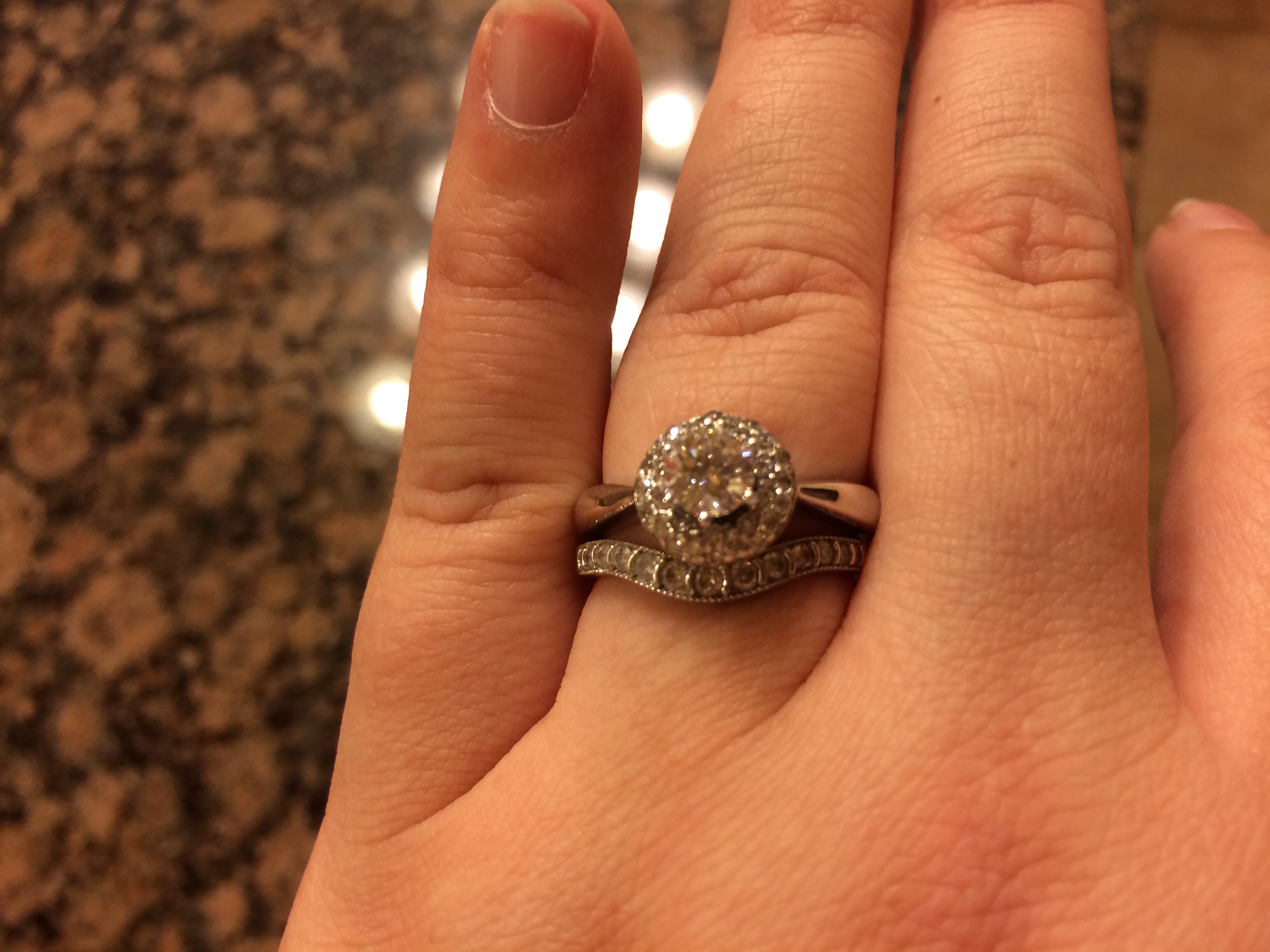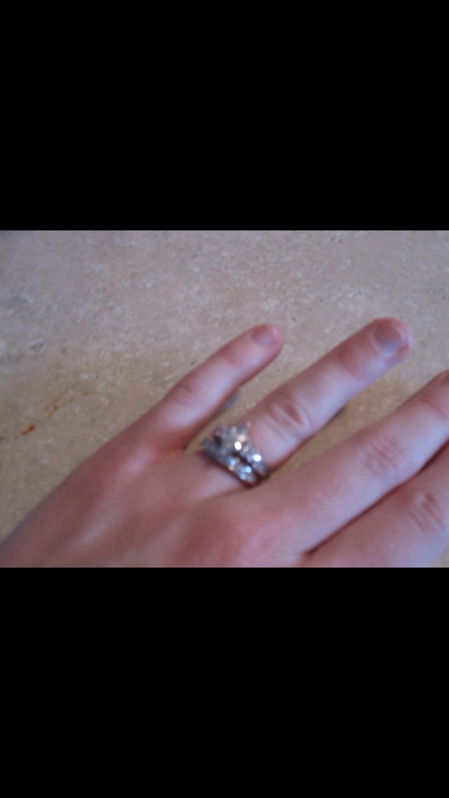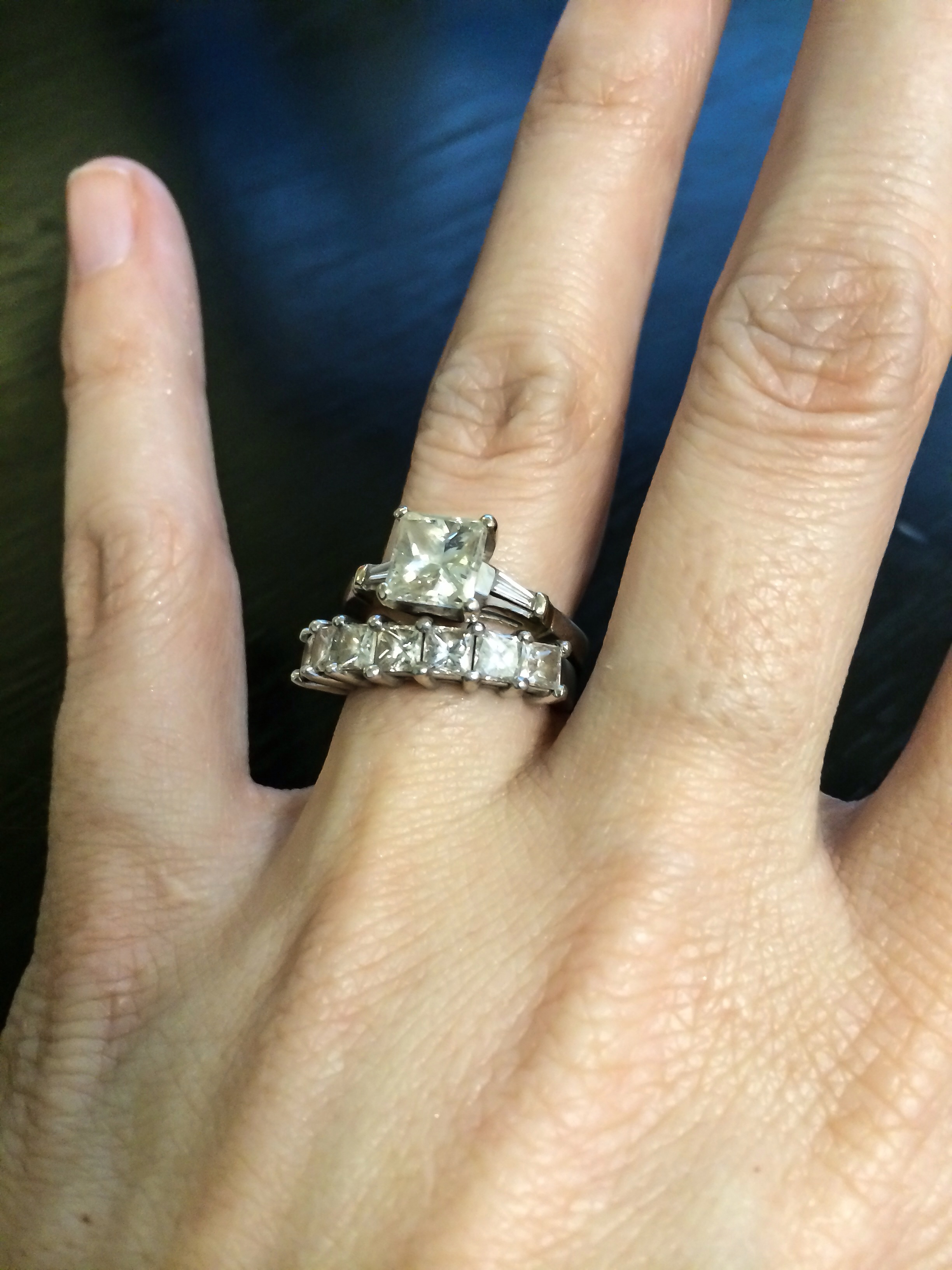 Here's a picture of just the engagement ring and then my husband's on top of mine. :) I usually wear the engagement and wedding band together. Since my hands are so swollen right now, I just ordered a slightly larger wood ring from Etsy from a different seller. It doesn't quite match, but it was ready to ship and I figure I can wear it on another finger later.