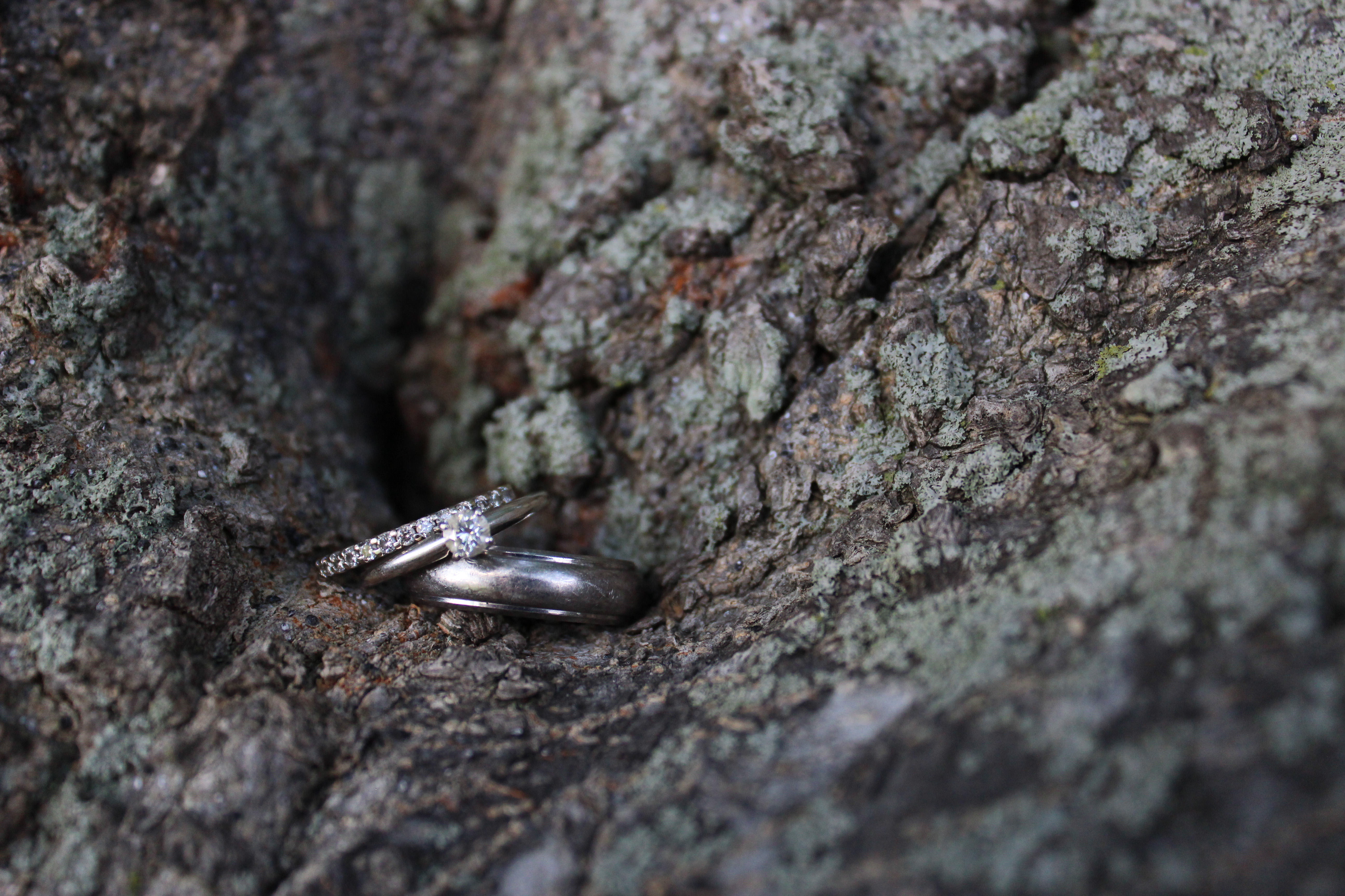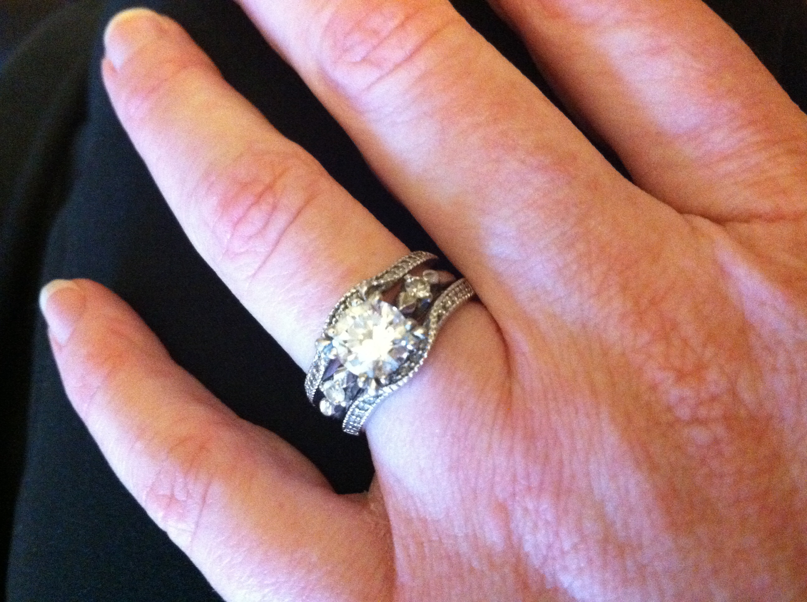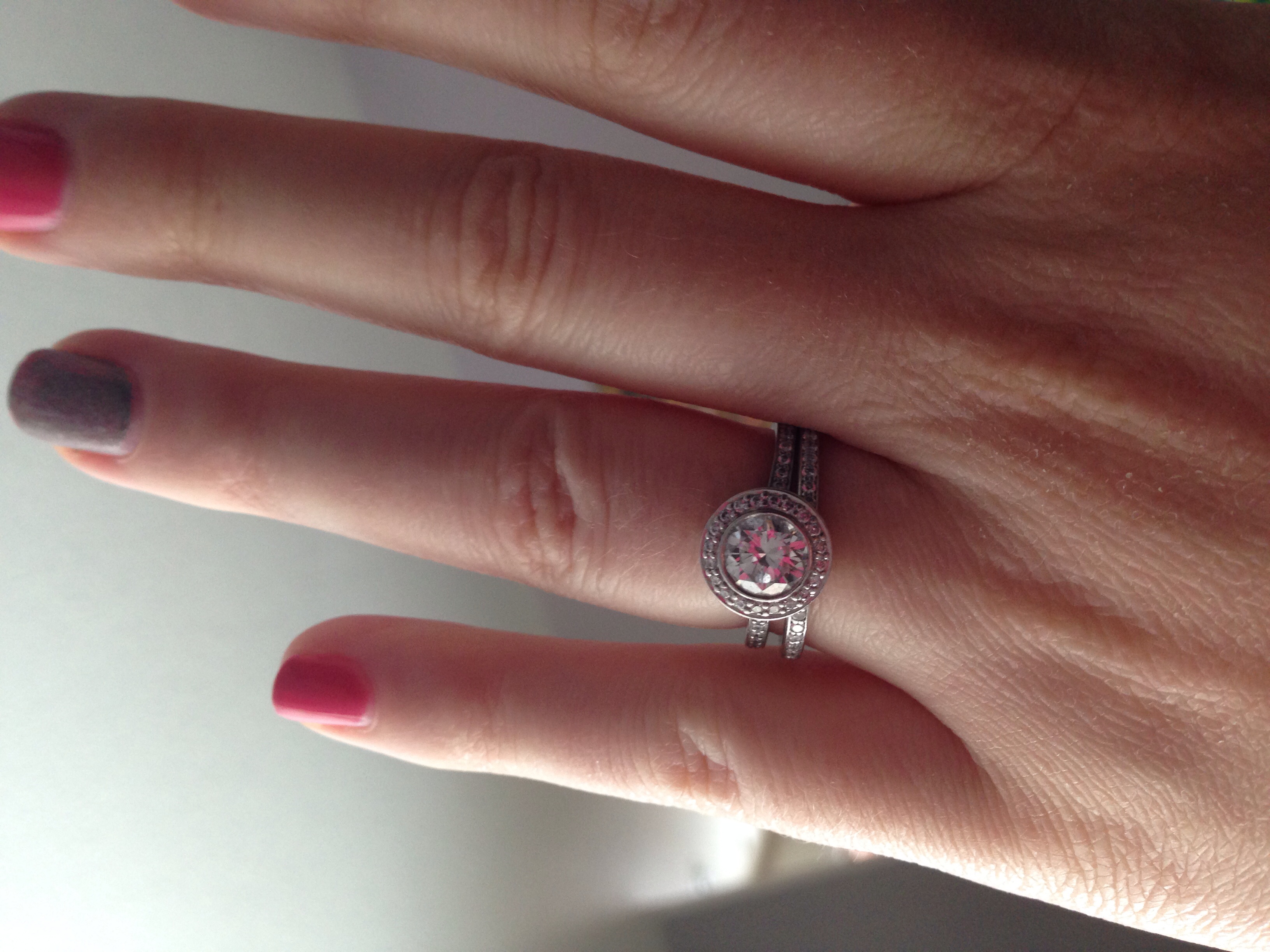 Here's a picture of just the engagement ring and then my husband's on top of mine. :) I usually wear the engagement and wedding band together. Since my hands are so swollen right now, I just ordered a slightly larger wood ring from Etsy from a different seller. It doesn't quite match, but it was ready to ship and I figure I can wear it on another finger later.