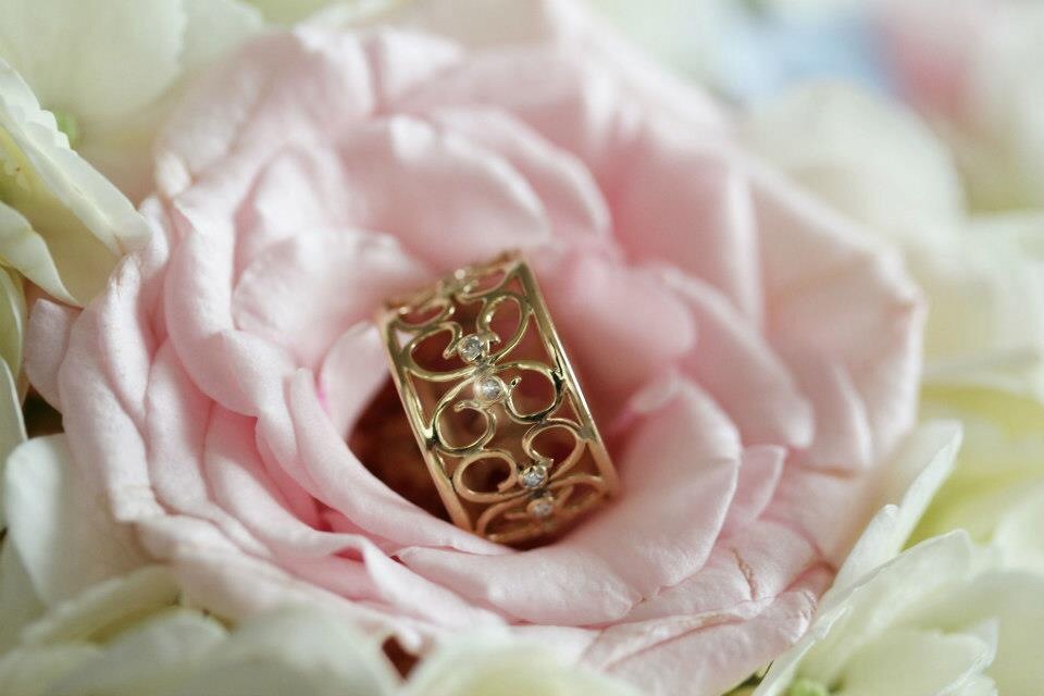• The engagement ring is rose gold where the diamonds are and white gold on the sides. The wedding band is all rose gold. I love it. I wanted vintage looking and it's exactly what my husband chose!