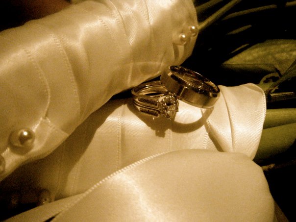 • It's so fun to see everyone's rings! Ours are kind of different. I'm allergic to all metal, so I did some looking around and found a maker of wooden rings on Etsy. His portfolio is beautiful. He used to lay hardwood floors and had an accident that damaged his hand pretty badly. So he makes them all one handed, which is amazing. I showed my H his site and he picked out and surprised me with the style. The bands are made of ebony, maple, and an azurite stone inlay. We got married in our backyard, so I plan to send the maker some wood from our land and have him make us rings on our 5 year anniversary, when the traditional gift is wood.