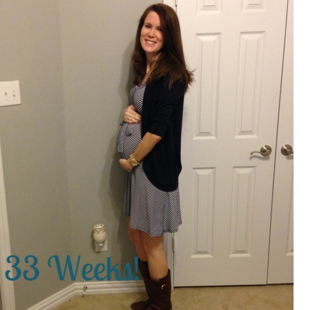 A little over 30 weeks! This the dress im planning to wear at my shower this weekend! Disregard the background mess, we are mid construction...you ladies are looking lovely!