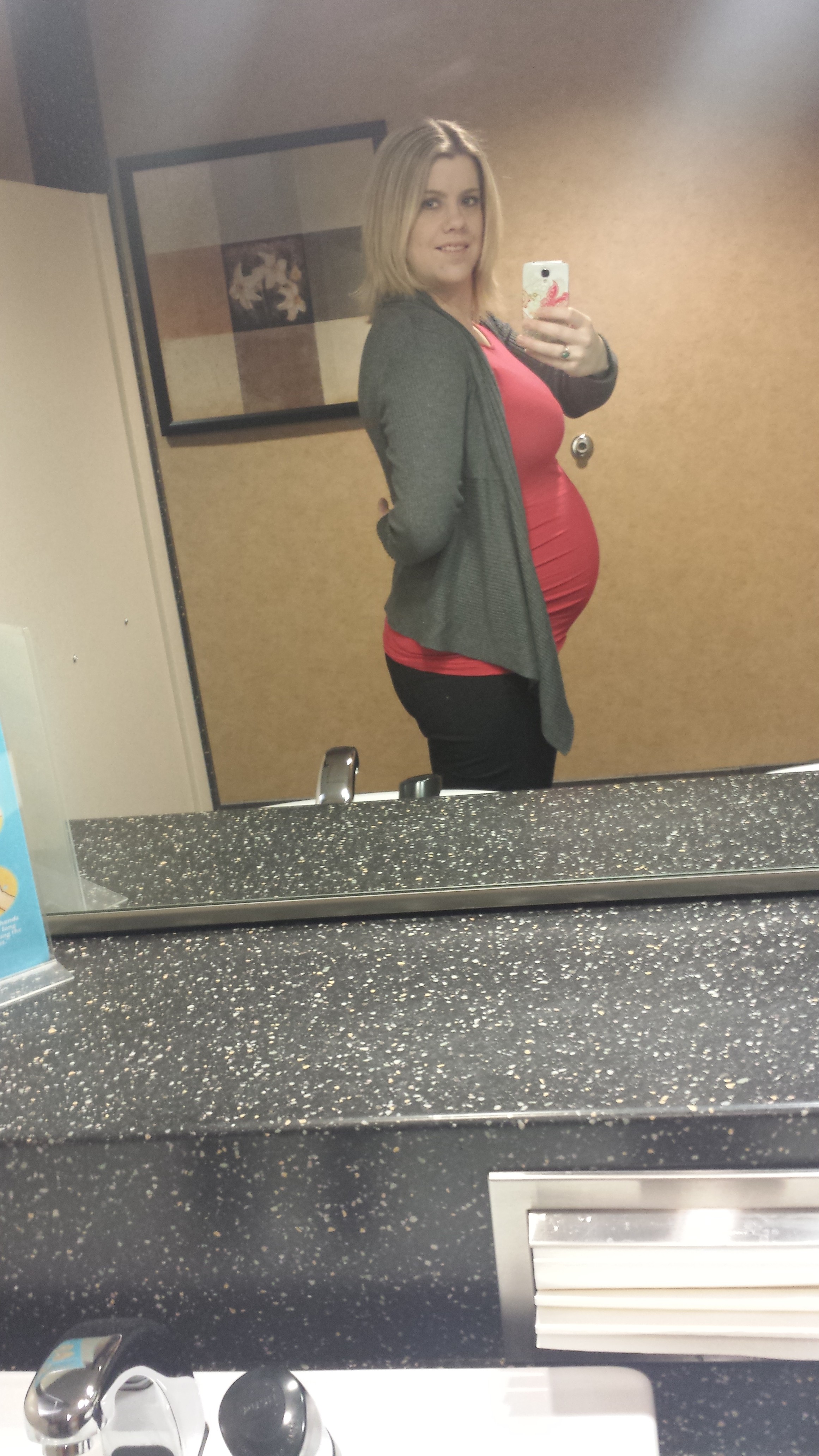 Ahh the first time I've missed taking a picture at home before leaving for work! Oops - but I'm randomly wearing red so I get a gold star! 30w4d with baby girl! Had an elective ultrasound on Sunday and she's weighing 3 pounds 9 ounces already!
