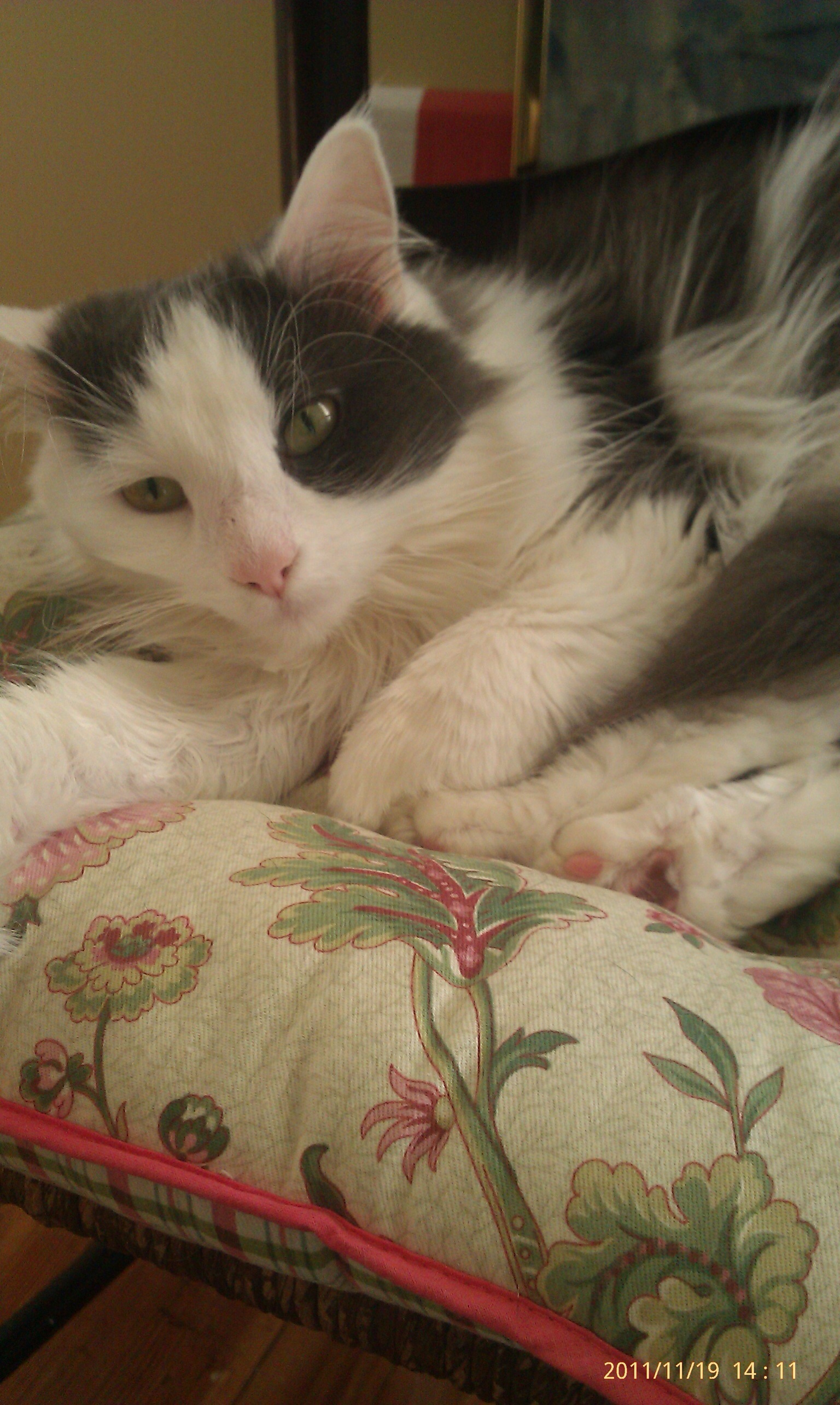 • I had to put down one of my cats Tuesday. Her death brought back feelings of my mother passing. I've been a mess. My other two cats know she's gone. One hides all day only emerging to eat or poop. The other walks room to room crying out for her. It's not making it any easier. DH is taking care of his mother today who is in in-home hospice. She is only expected to live a month or so. I can't wait till I have my LO. DH and I are so thankfull we have that to look forward too. Feeling LO kicks make it easier to get though all of this. Here is a picture of Winter.