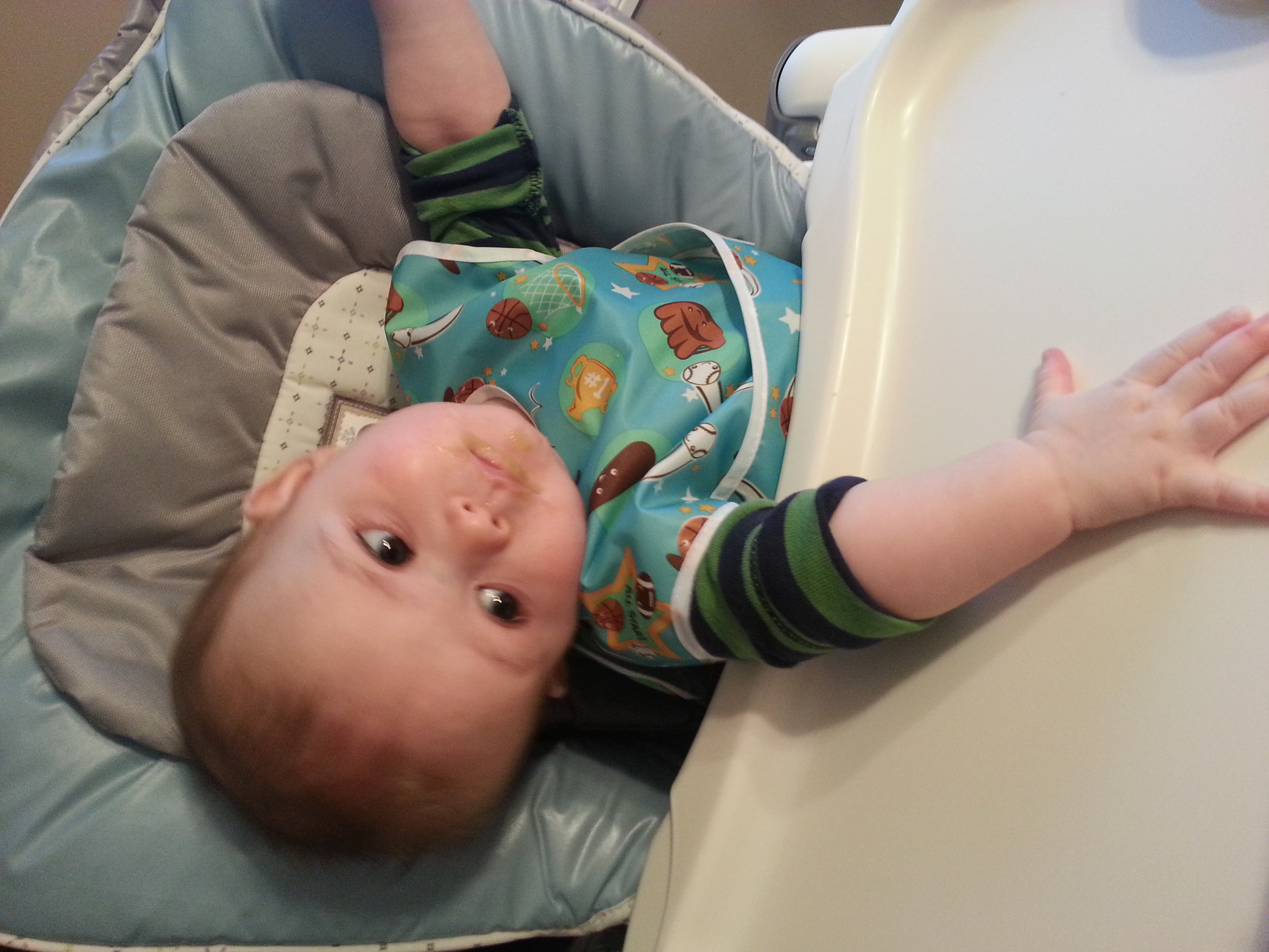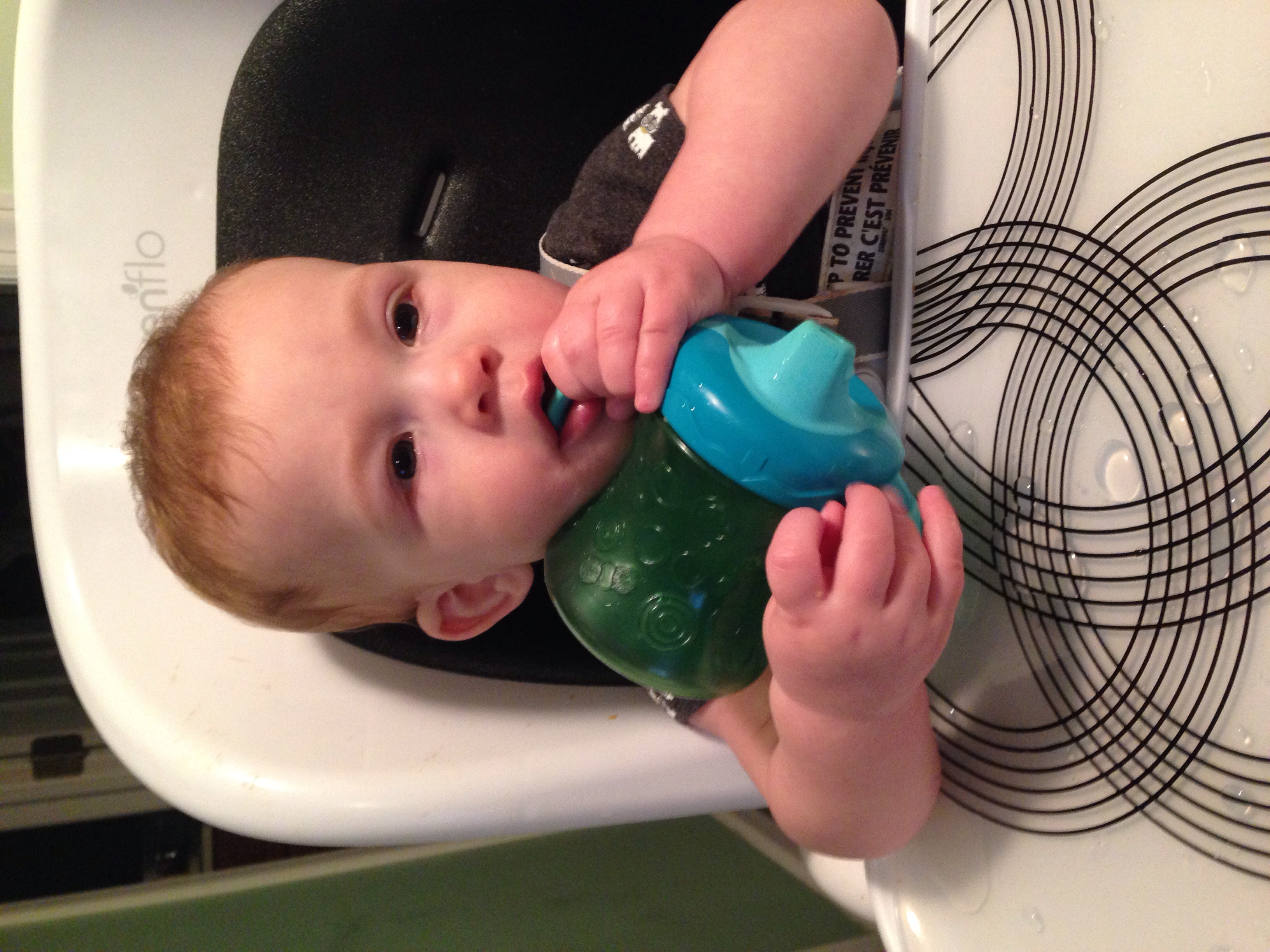 Teething cracker in high chair. Also: goose egg on head