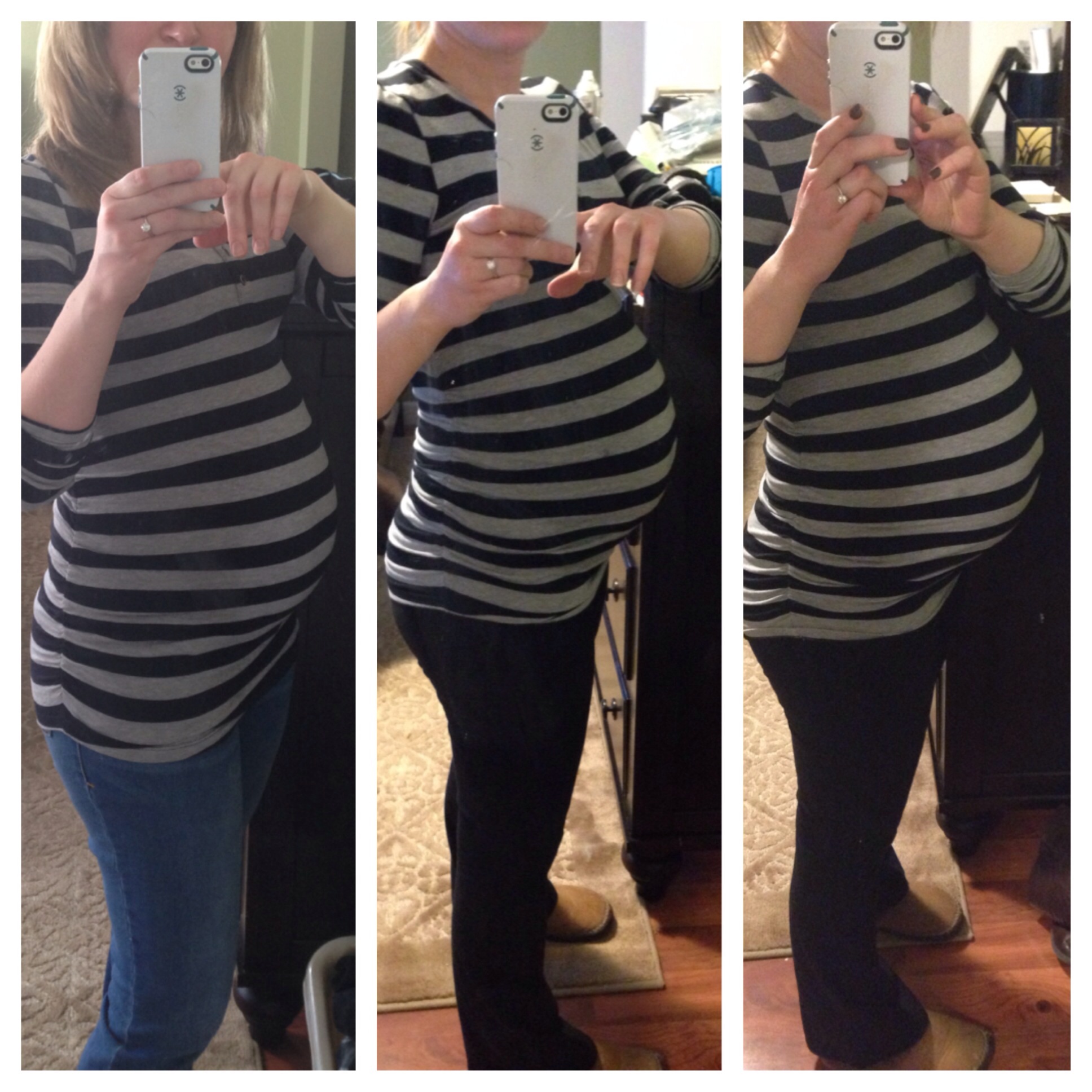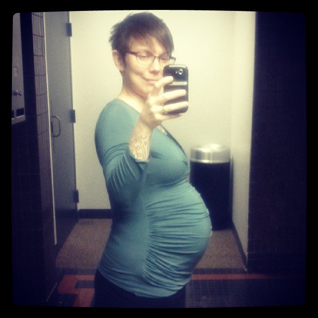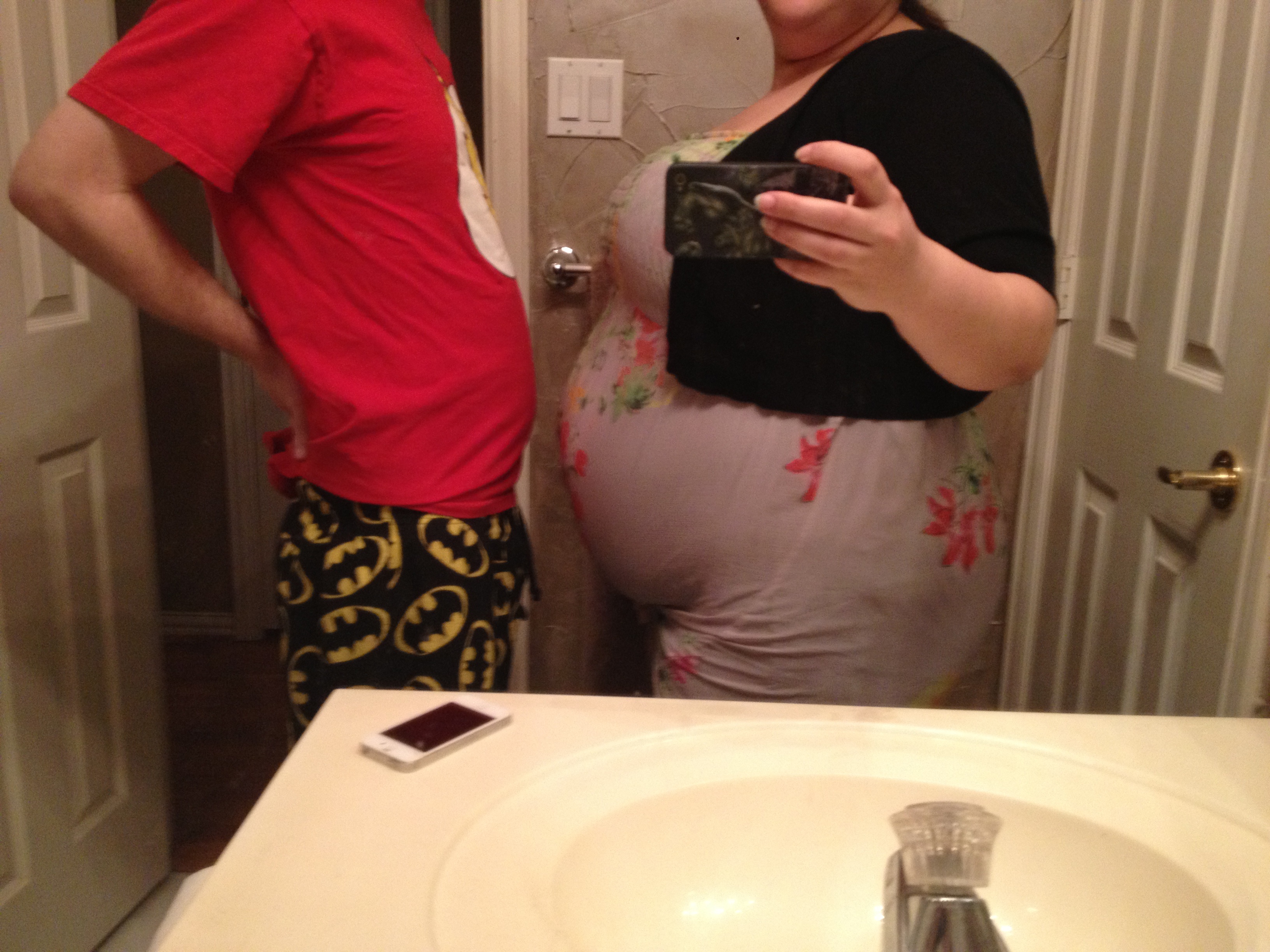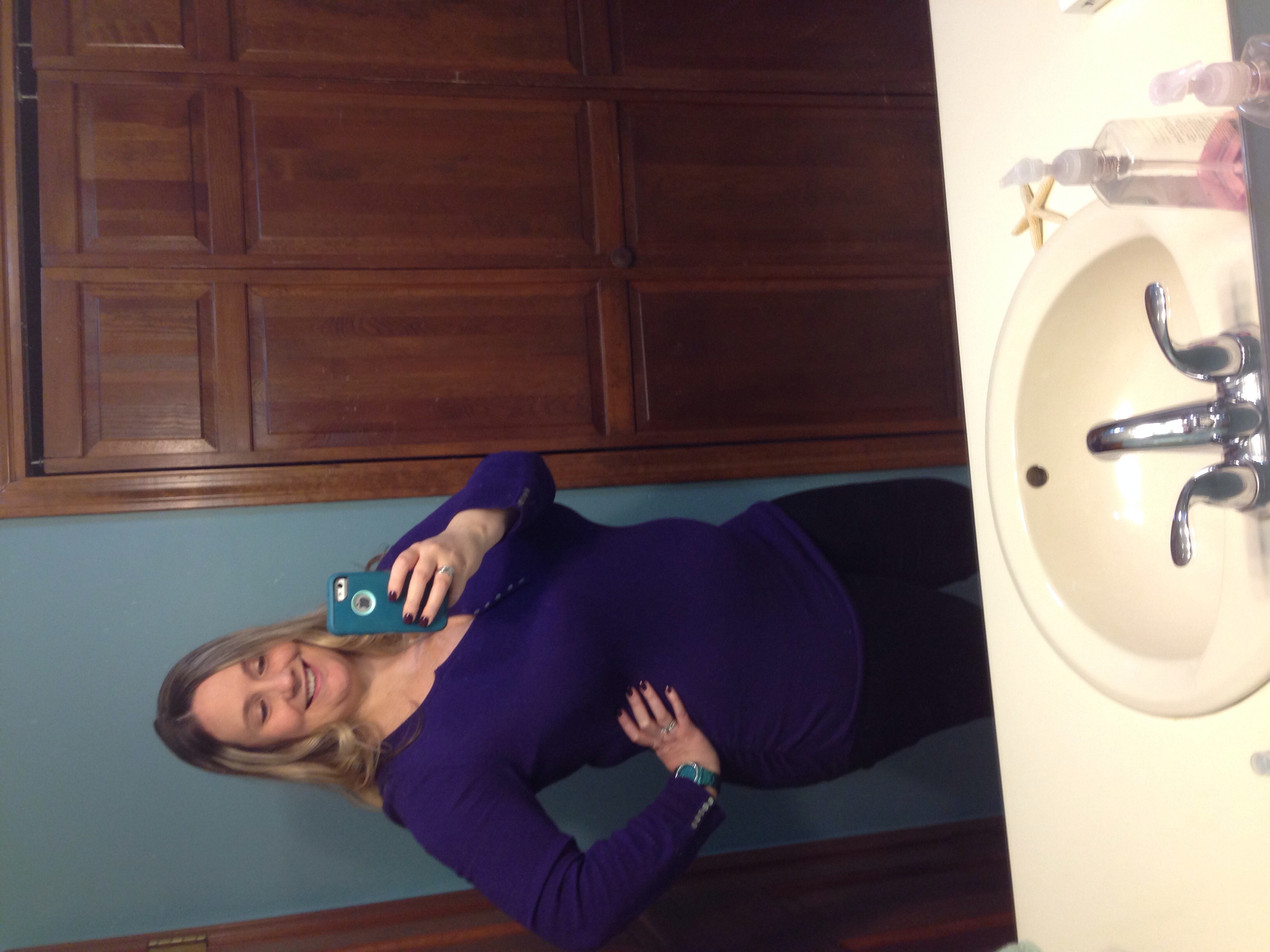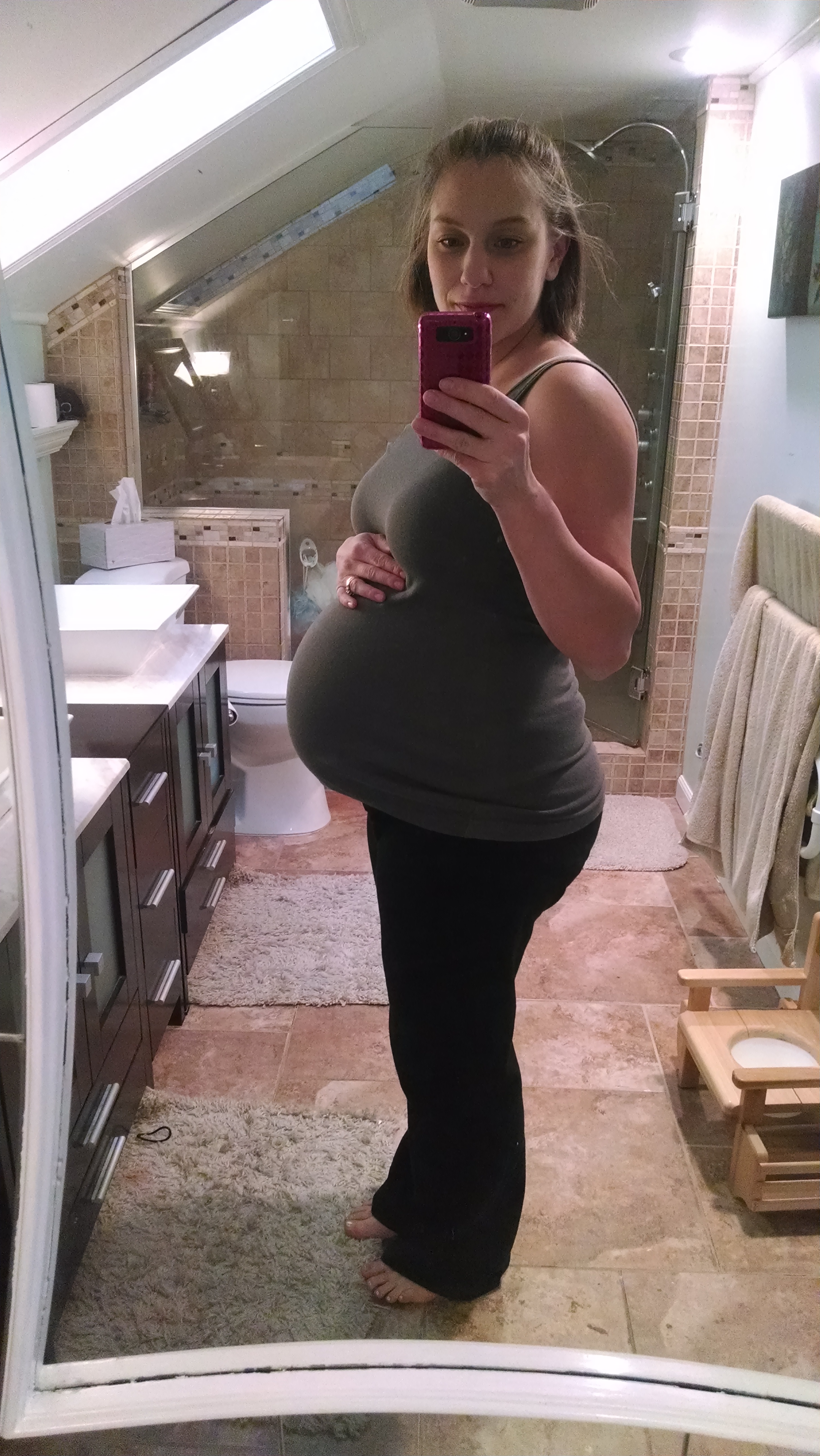 Ahhh those classy work bathroom shots. 33 weeks. I normally wear a D cup so it's fun to see a bump well exceed beyond the boobs, making the boobs appear smaller. Relativity! Everyone looks fantastic & healthy.