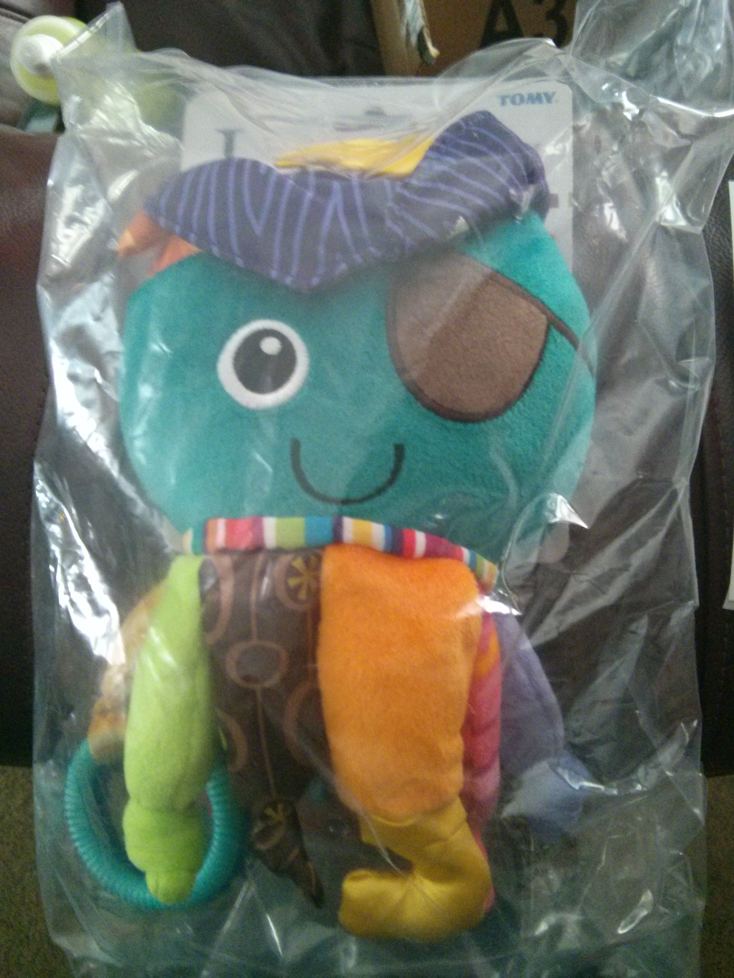 @lexilupin was visiting, N took a liking to one of Gus' toys, called Captain Calamari. Nora decided he was pirate octopus instead. I just opened my door to go work out, and I find a package in the mail. N received her own pirate octopus!!