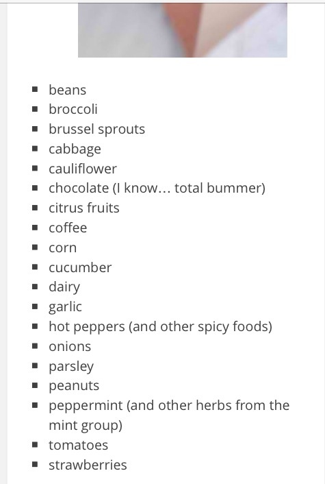 WHAT??? I ate all those things when DD was nursing. We never had any issues with gas or colic. I did try to drink decaf instead of regular coffee and limit to one a day, but that's it.