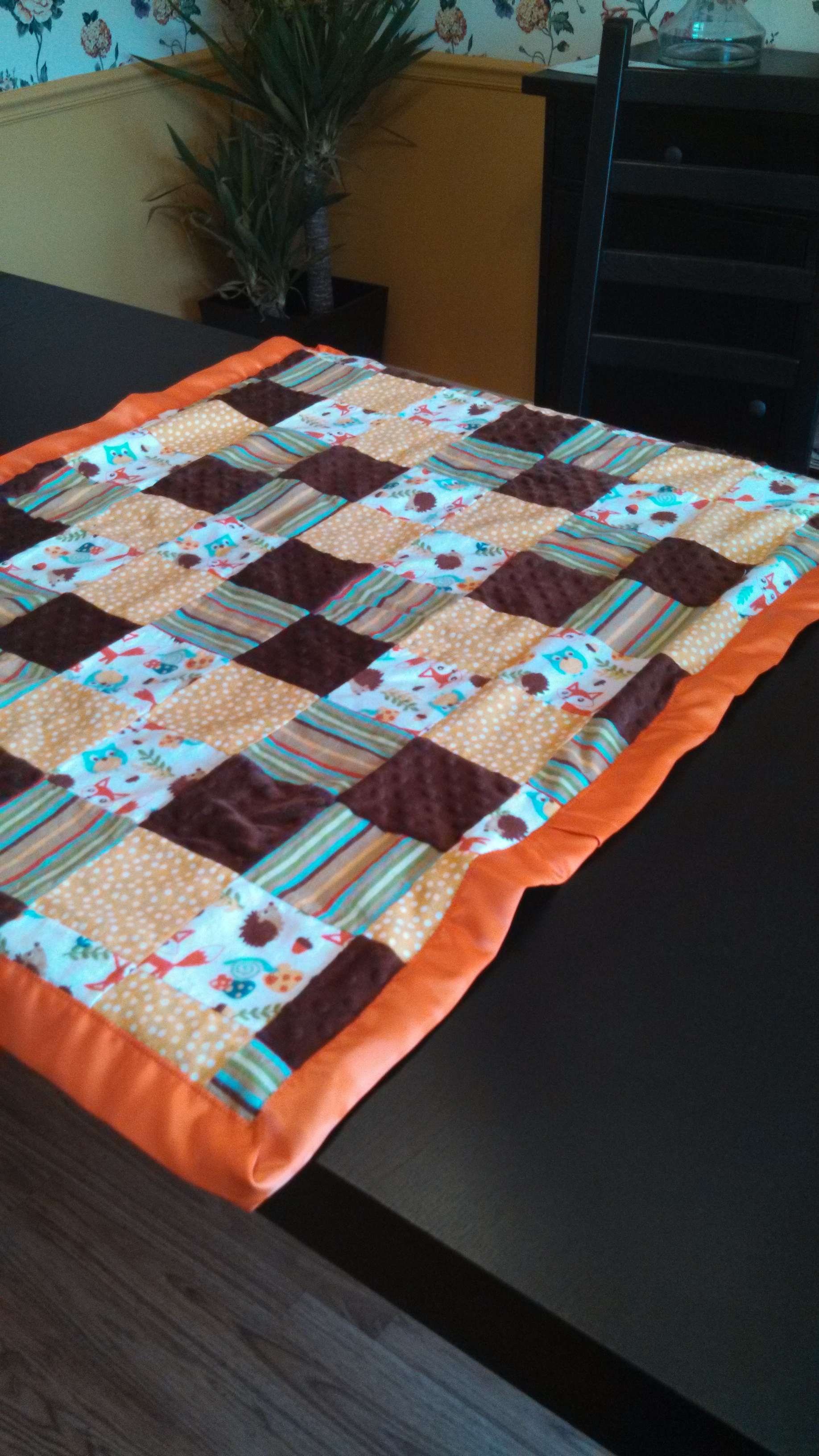 The blanket is made from Mr Fox & friends patchwork fabric and brown minky. Its super soft!