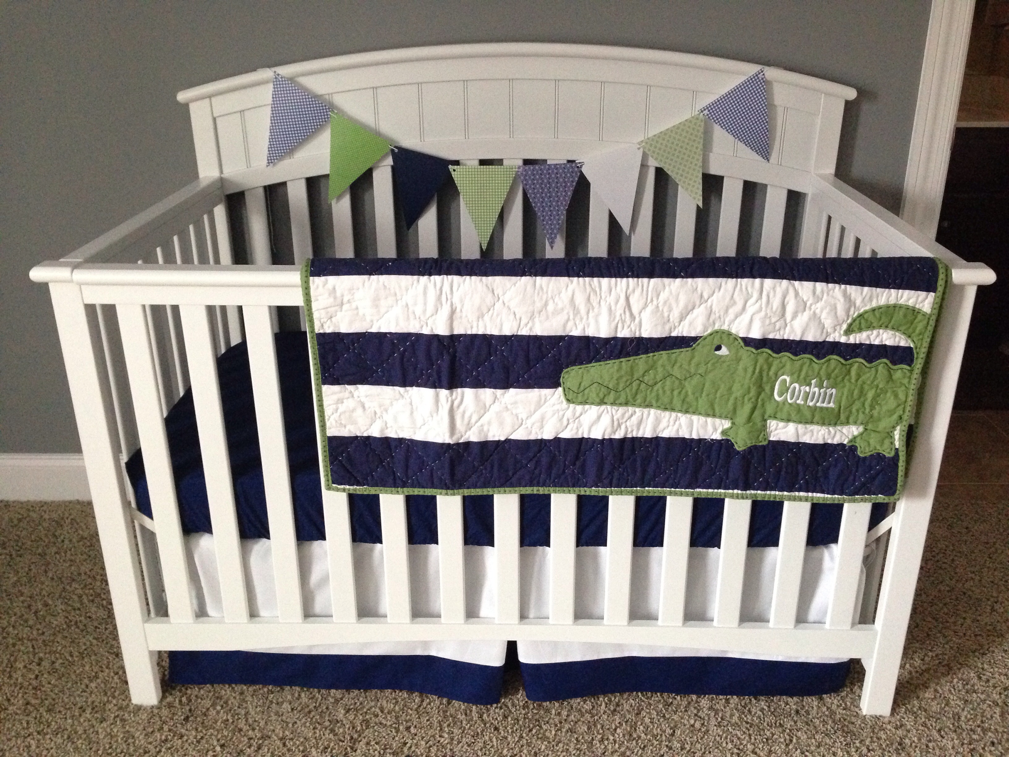 Finally figured out what I wanted to do for bedding. Solid navy crib sheets & a skirt from Target. Cheap and hopefully "boyish" enough for our little guy. We're gonna hang the banner above his crib at some point as well.
