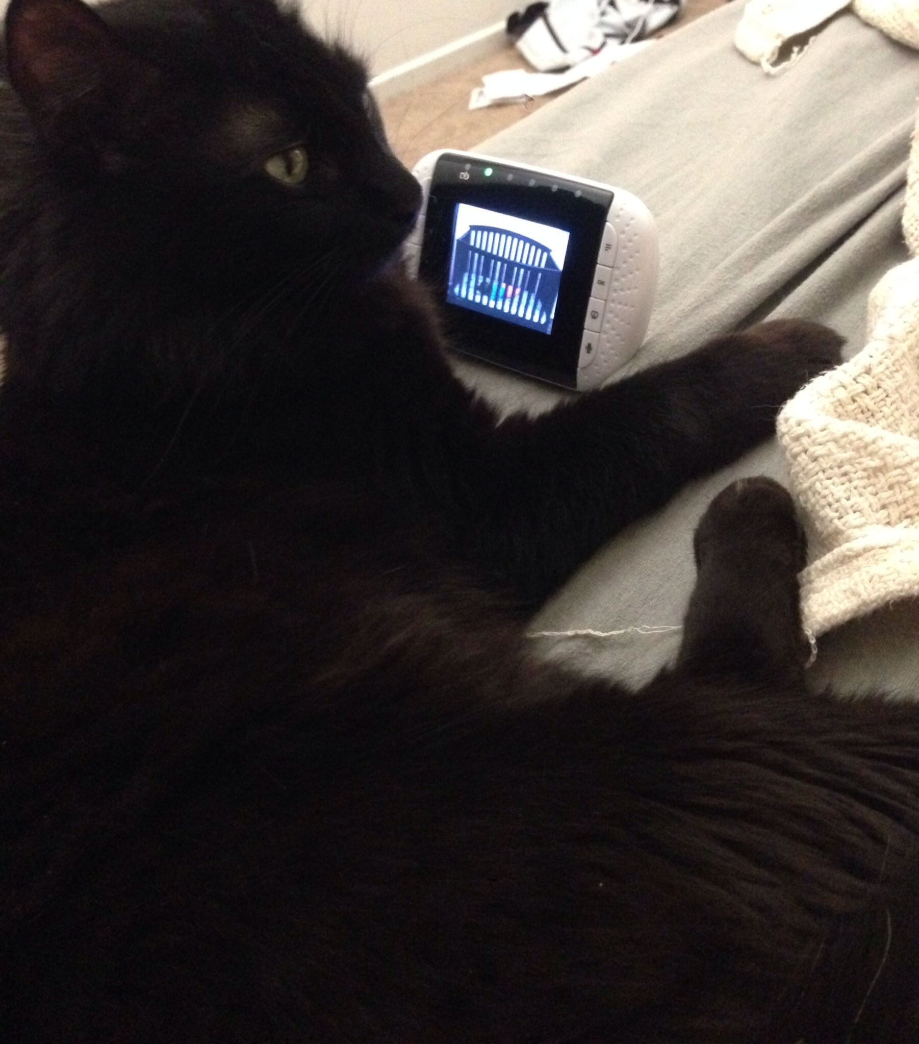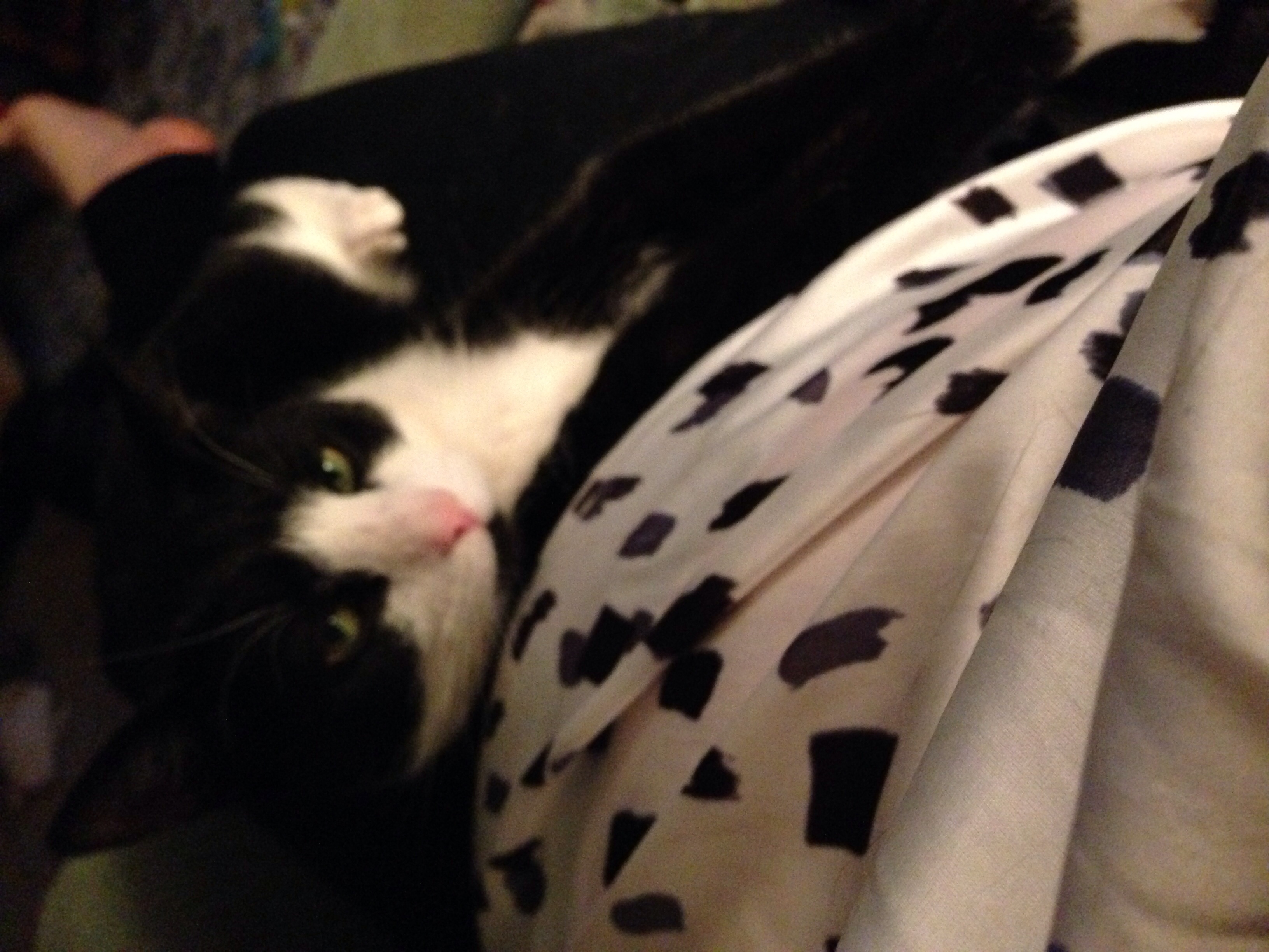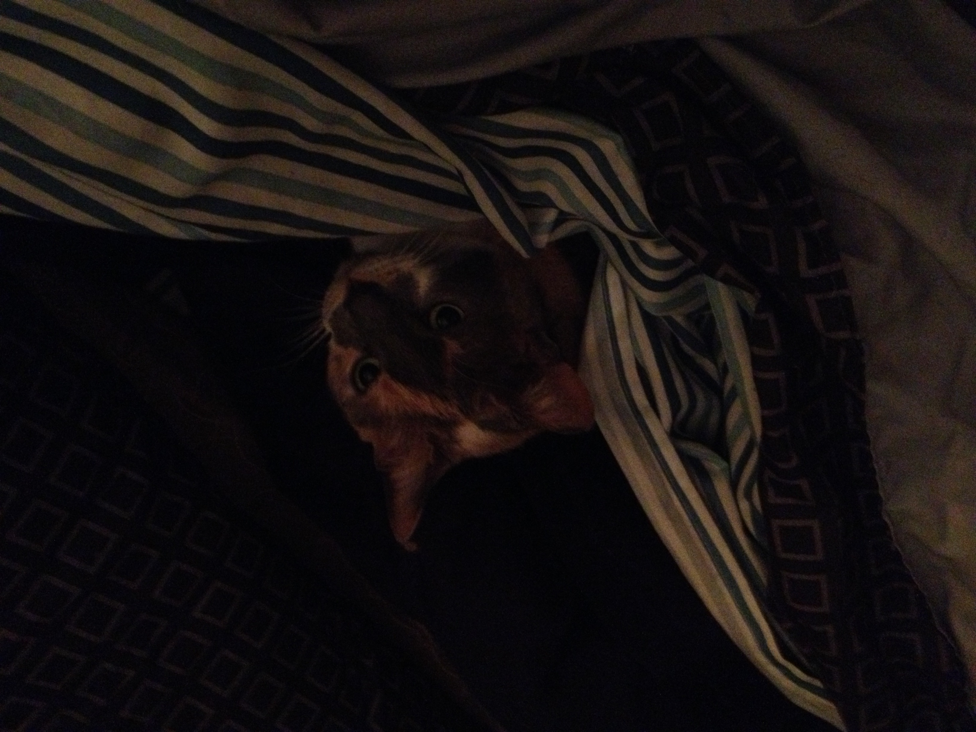 Here is a pic of my cat Ice Cream. Every morning she goes under the covers between my pregnancy pillow. Too cute!!