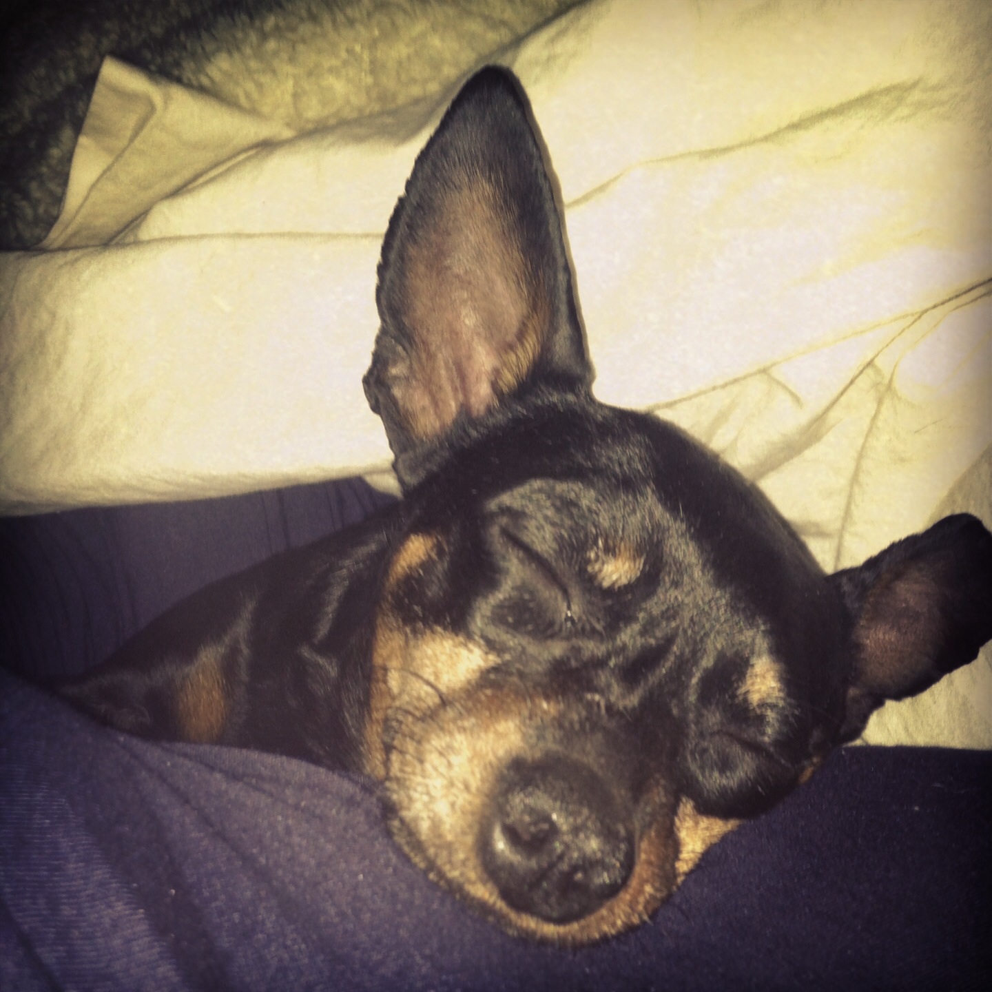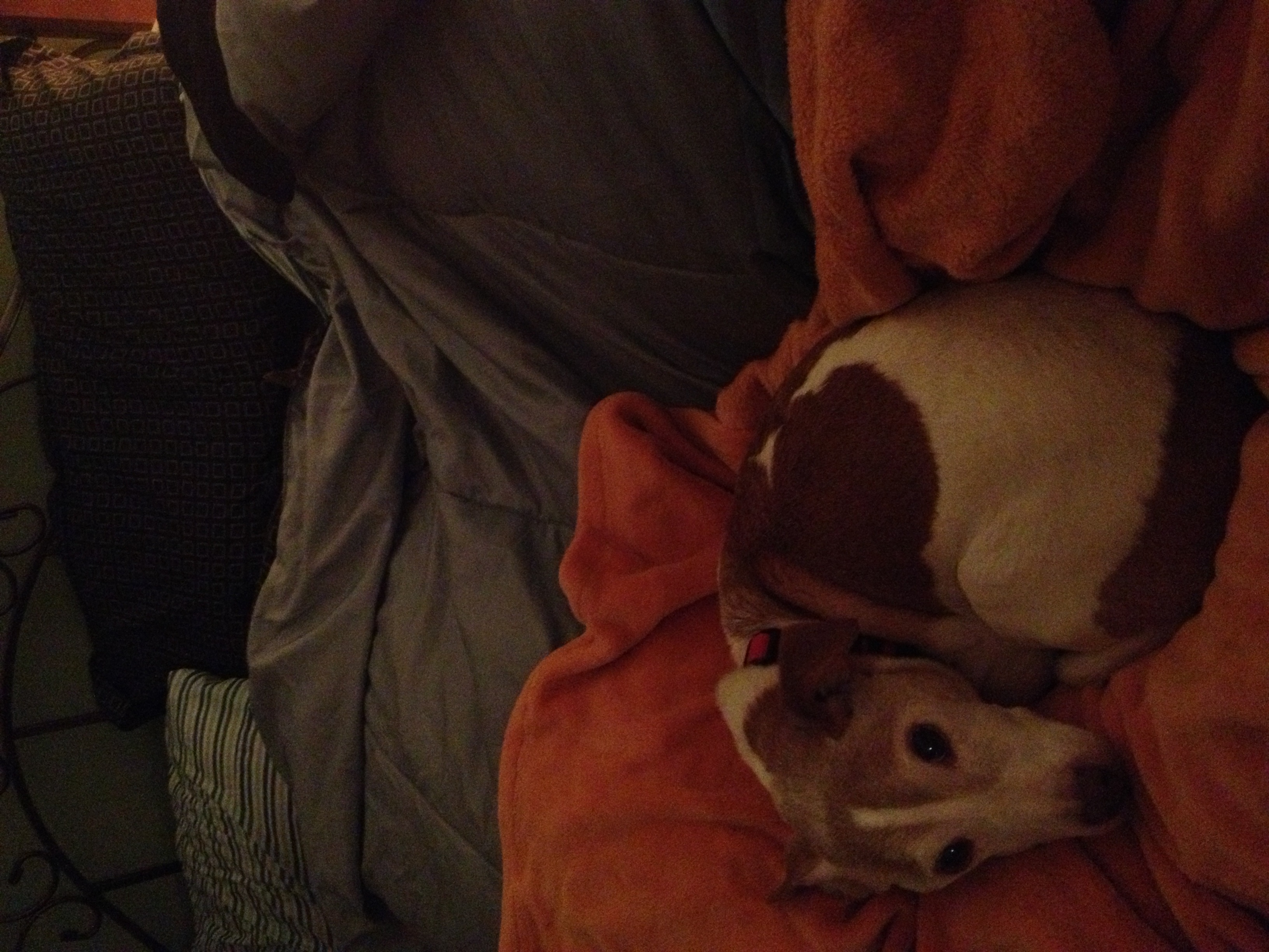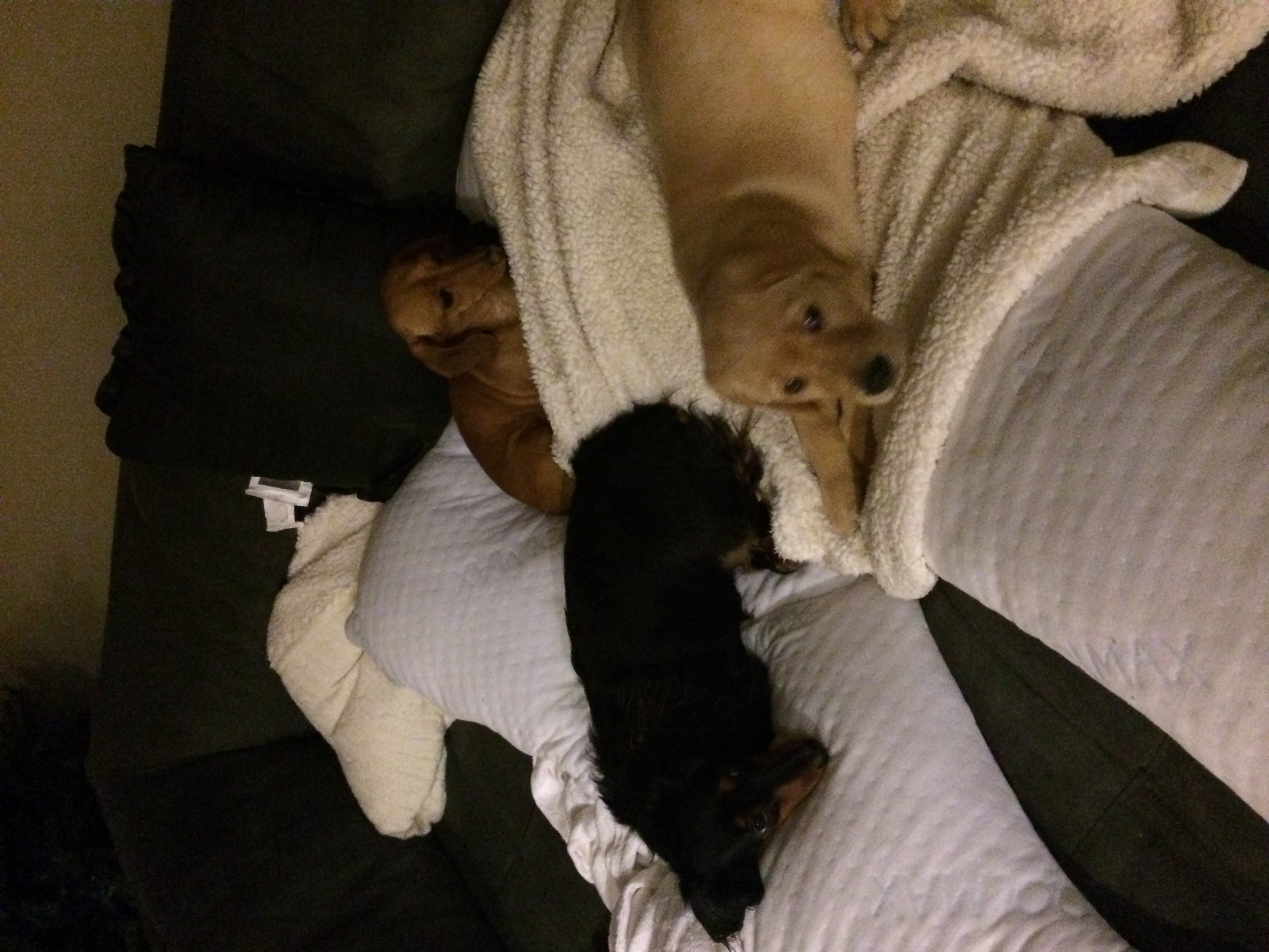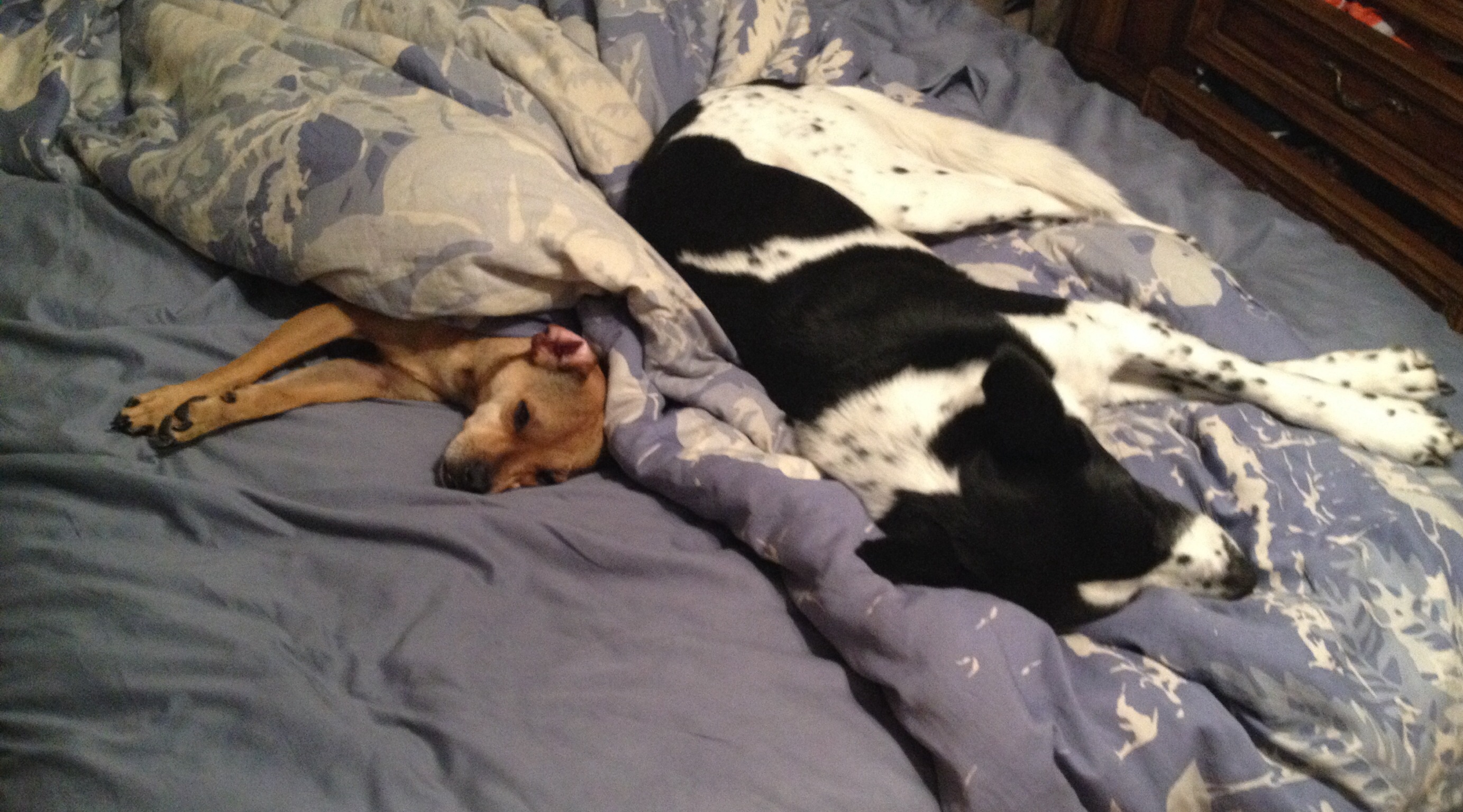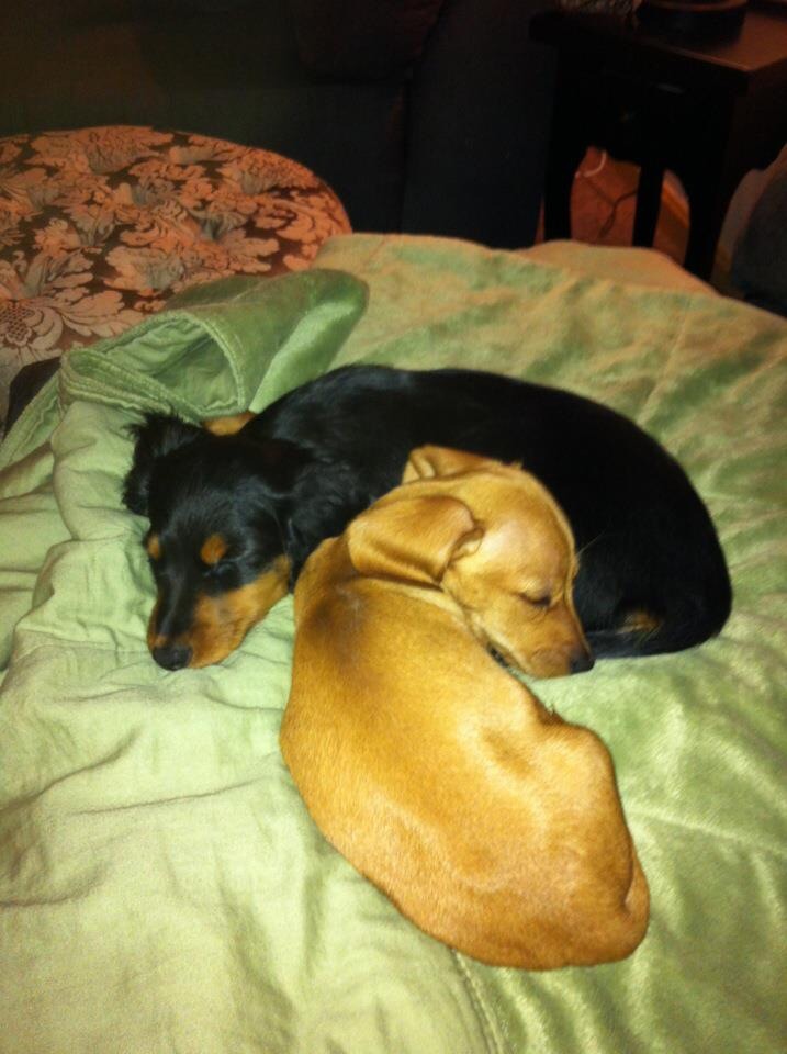 Here's my 2 pups. One is always hot and one is always cold, but they still like to snuggle like this most nights.