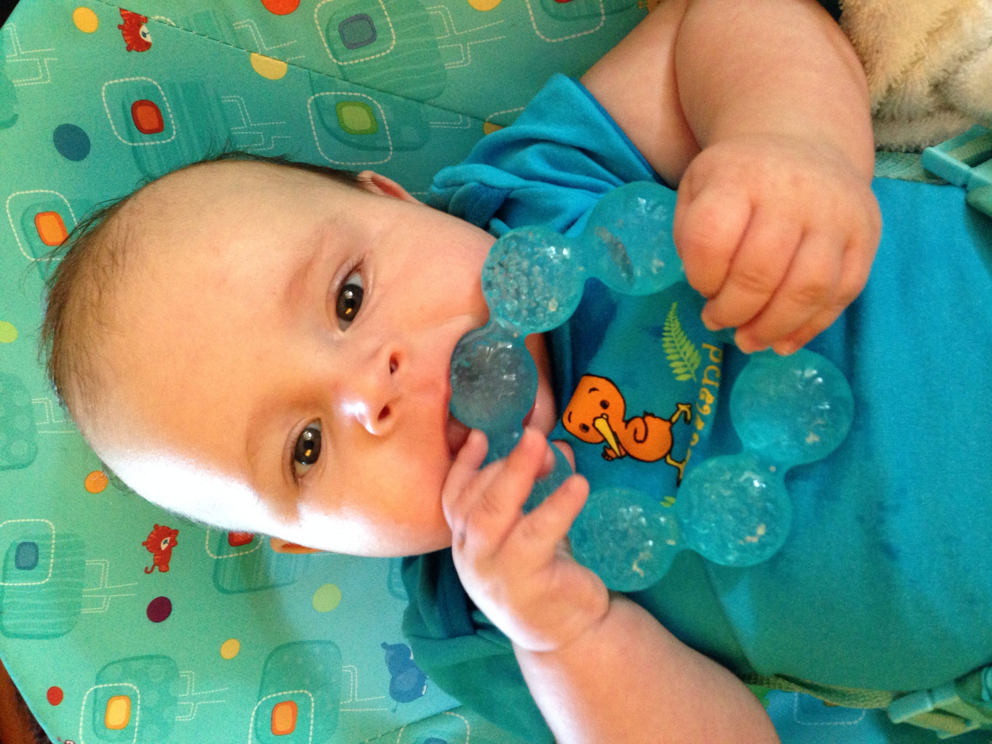 We also got him the grape fabric teether. Same concept as the washcloth but we haven't frozen it yet.