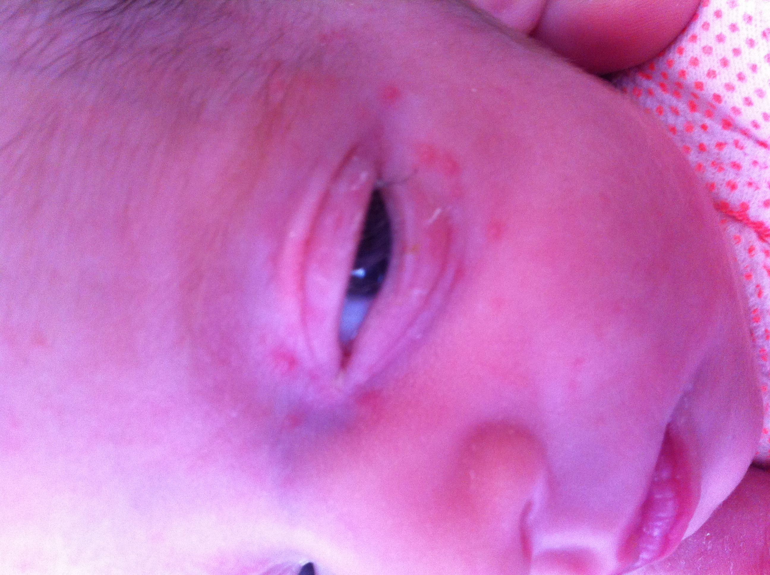 LO is scratching her eye and it got all junky like with the blocked tear duct, but now it has swollen a little and there are little red bumps. Is this baby acne? I've bathed it in warm water like the tear duct issue. I will call pediatrician, but wondered if you'd experienced this?