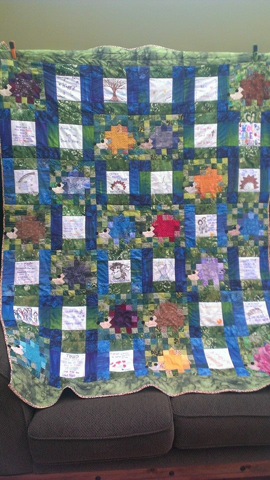 My friend had a quilt making party for her second ds. I couldn't go because of work :( but I guess it was a lot of fun. She had blank quilt squares and fabric markers. Everyone decorated a square and her mom put it together. It turned out super cute, and was a great excuse to get everyone together.