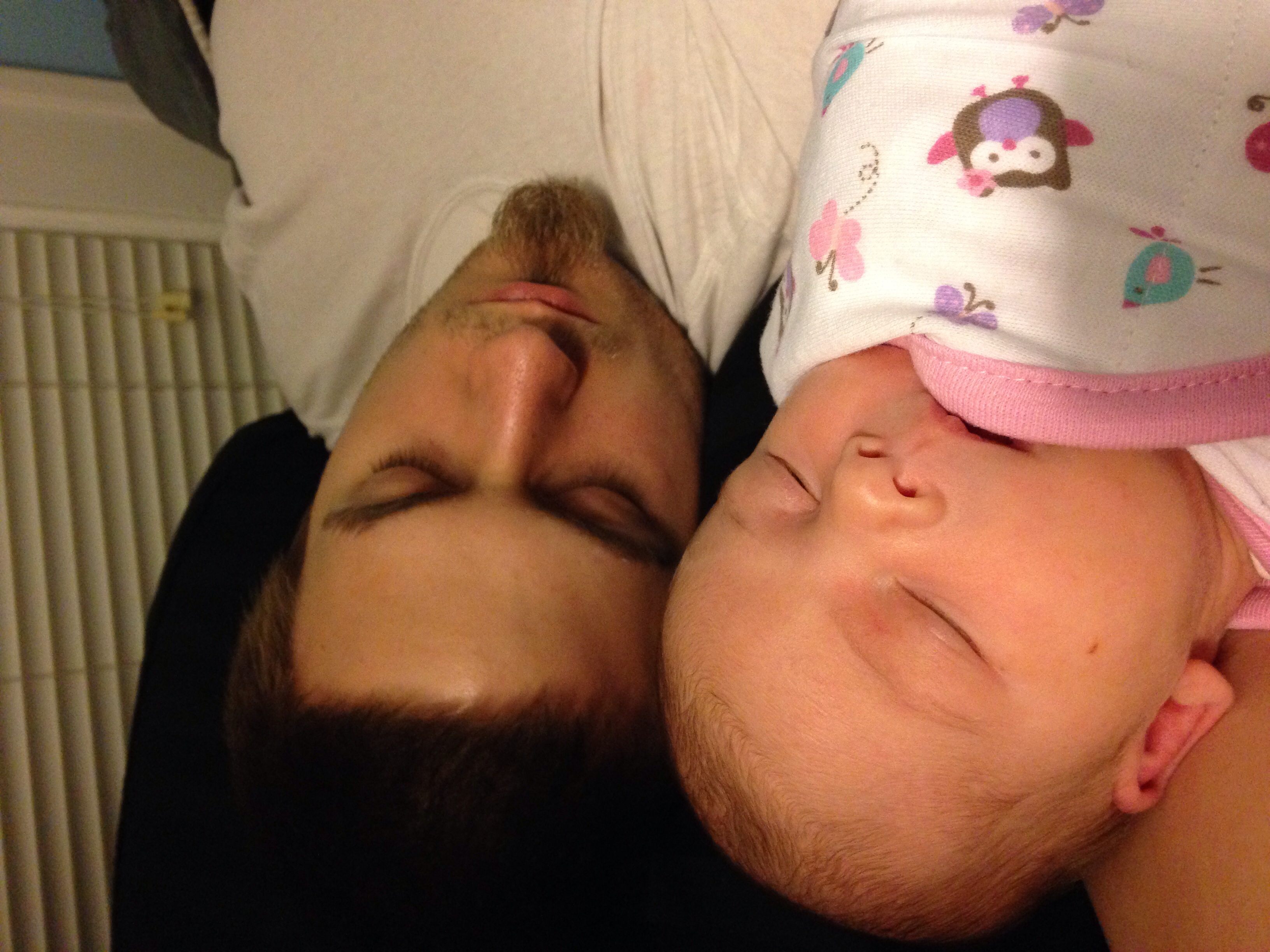 I posted that pic of DH and Mia sleeping on FB, shortly after sharing that article "9 Things to Never Say to Parents of a Newborn". What does my cousin's aunt do? "Best advice anyone will give you: sleep when she sleeps."