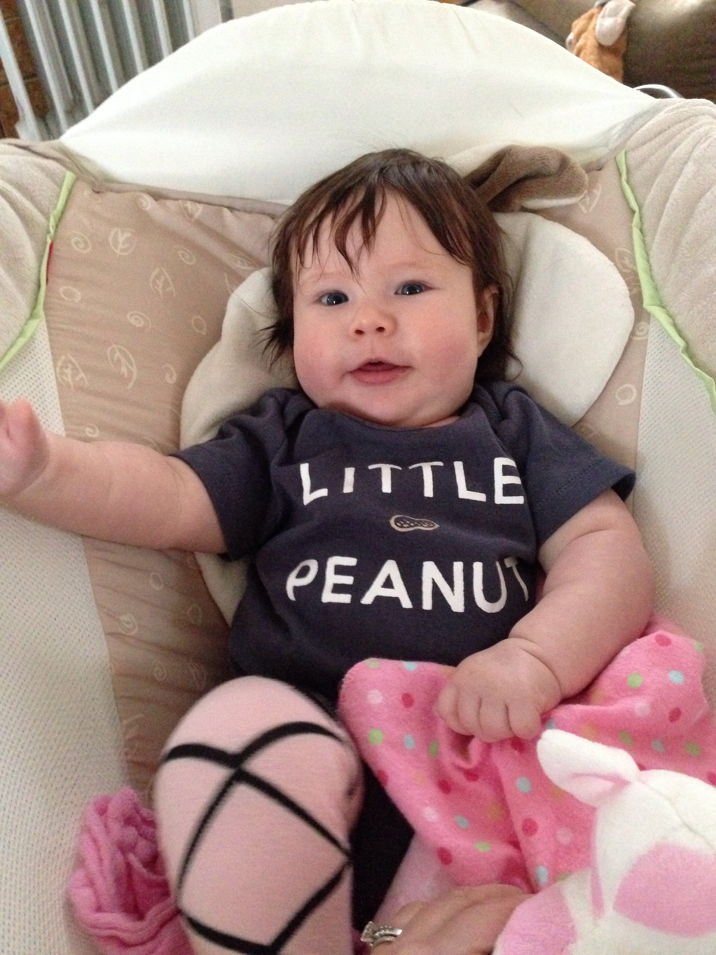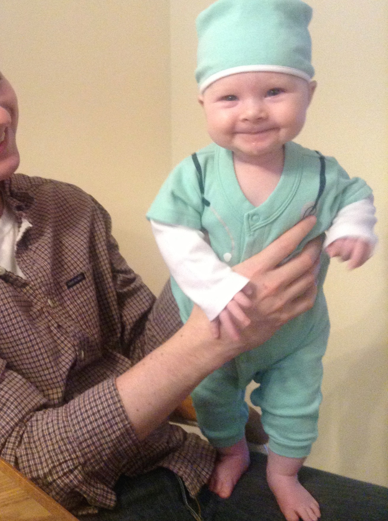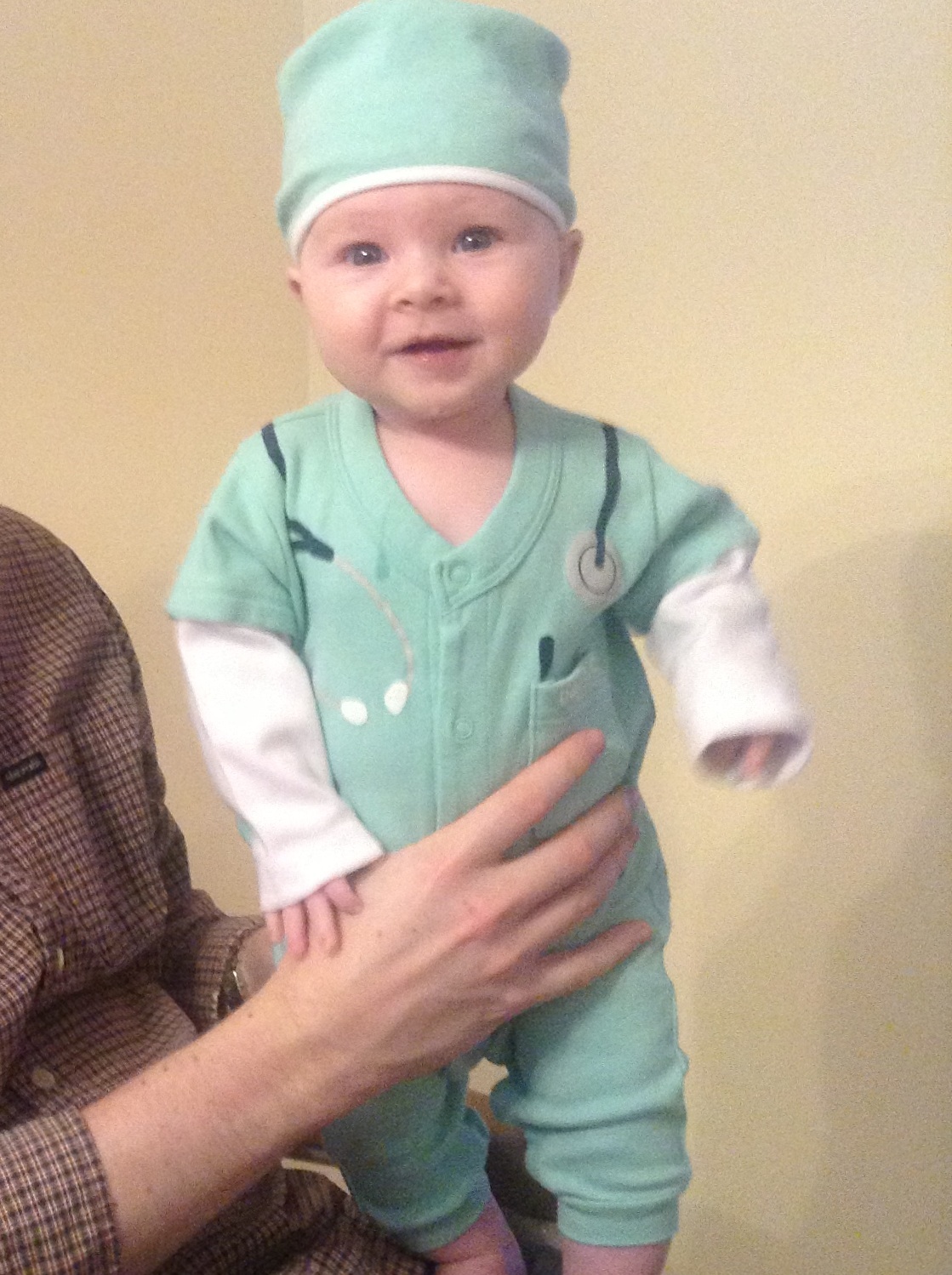 Here's a couple of pumpkin in her funny scrubs outfit and @ 5 mo!