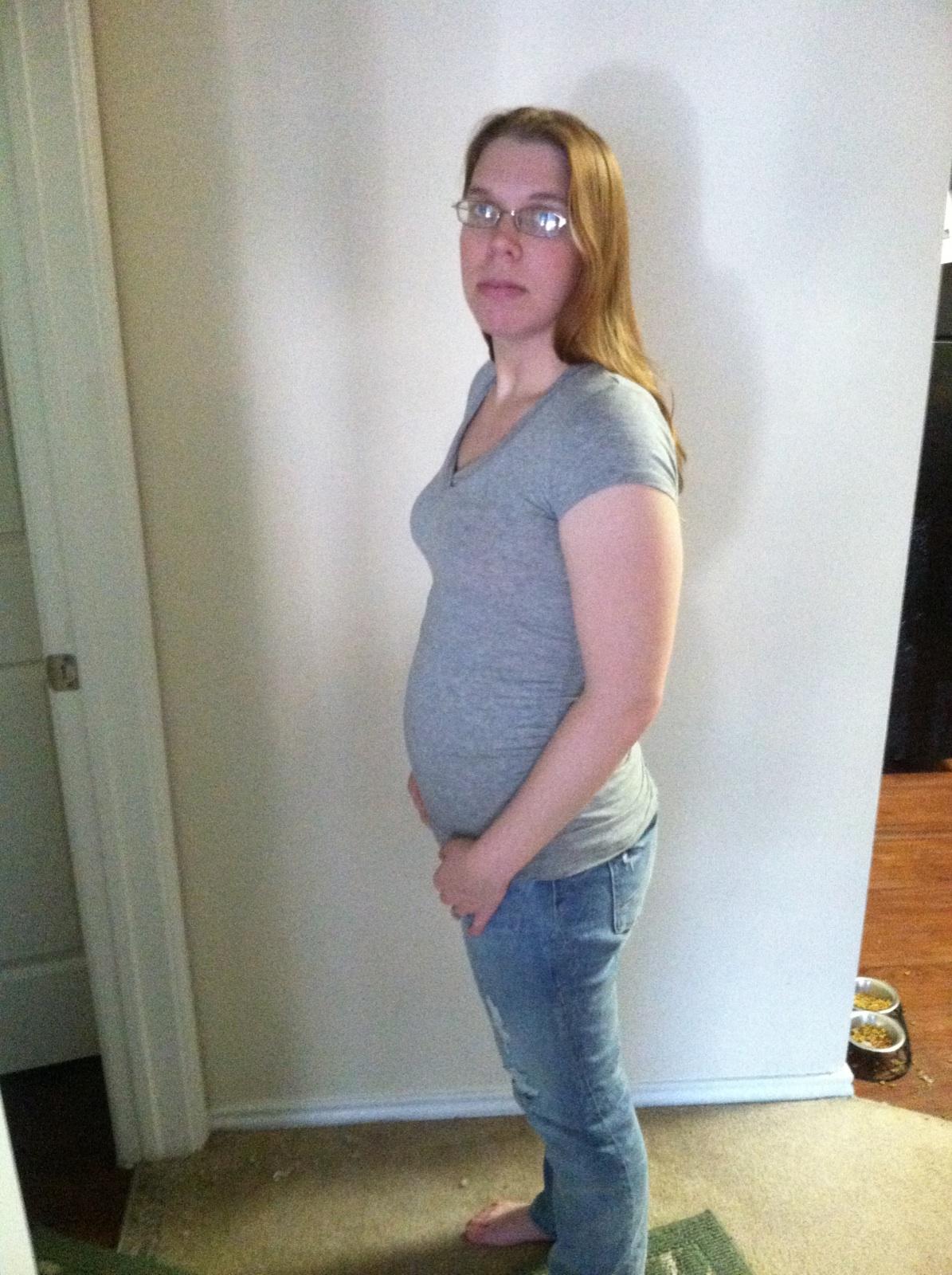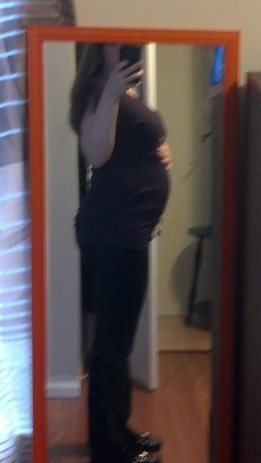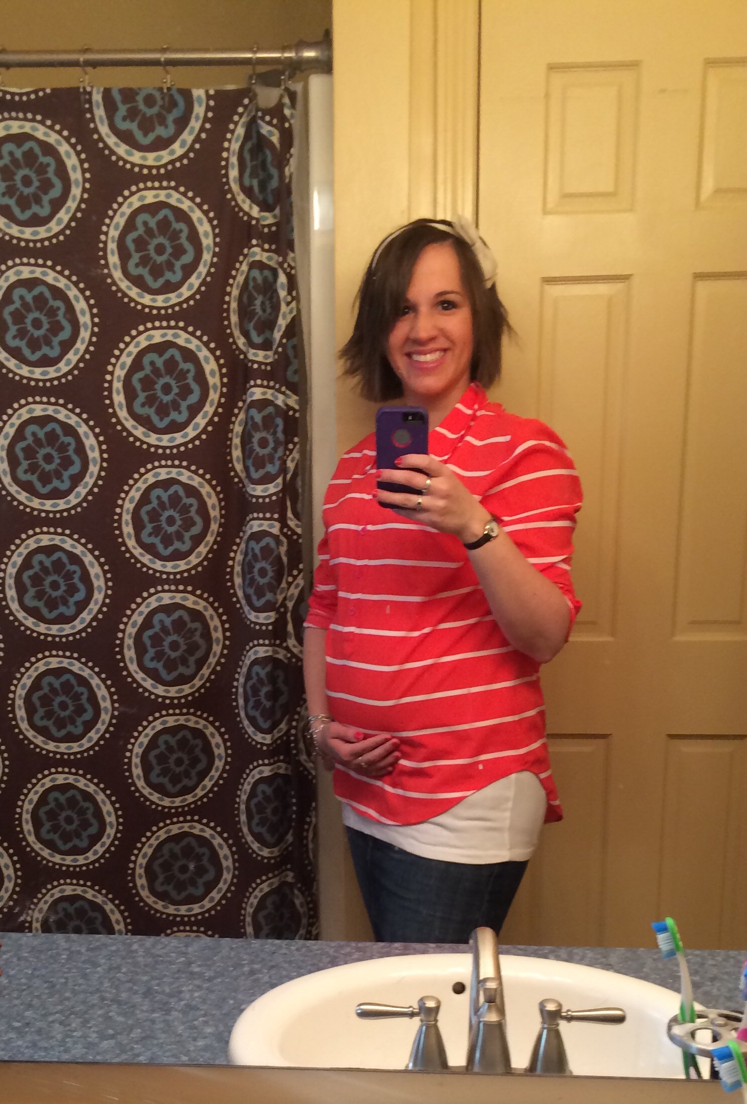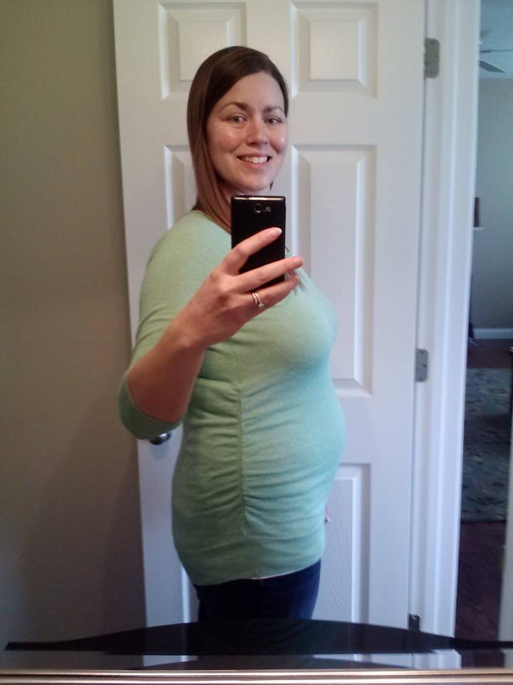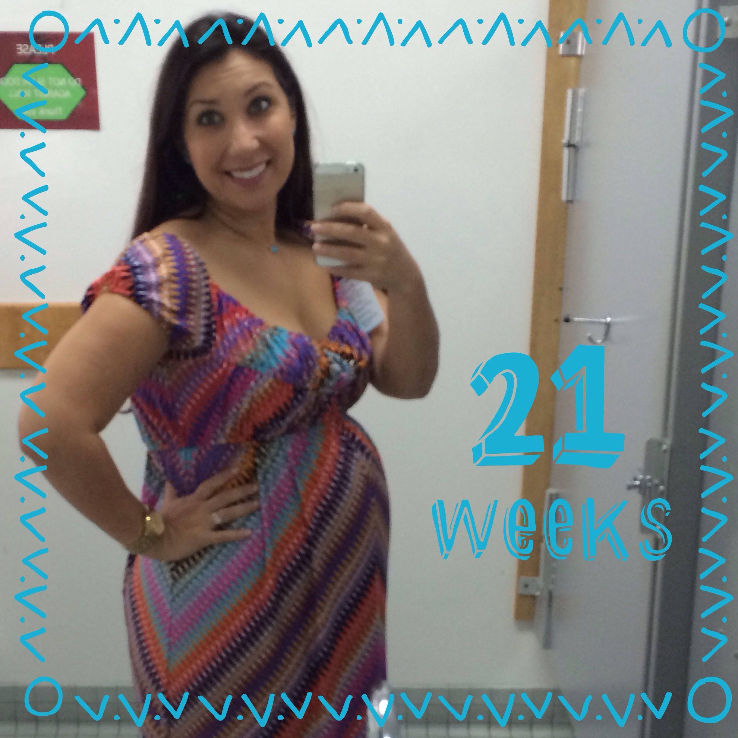 21 weeks, last Friday. Wanting it to round out a bit so I can actually look definitively pregnant and not "Is she pregnant, or is she fat?"