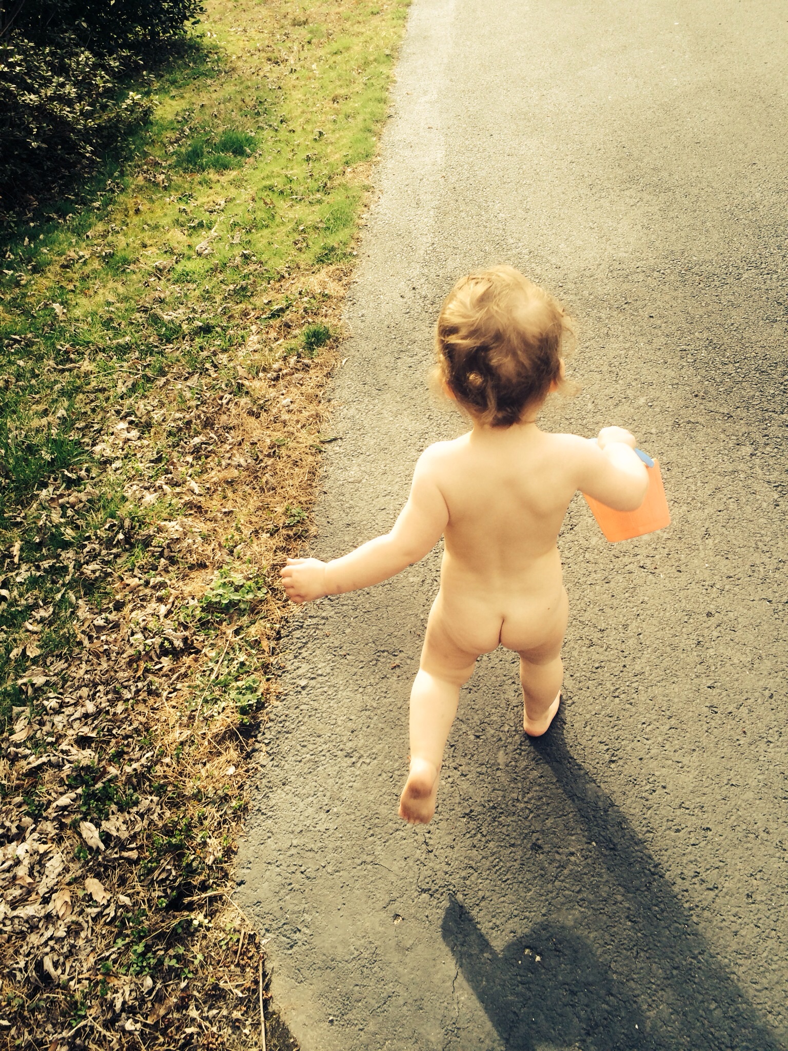 Made her wear clothes outside...inconceivable! Ten minute tantrum before we finally made it outdoors. Twenty seconds later this happened. The cranky old neighbors were scandalized.