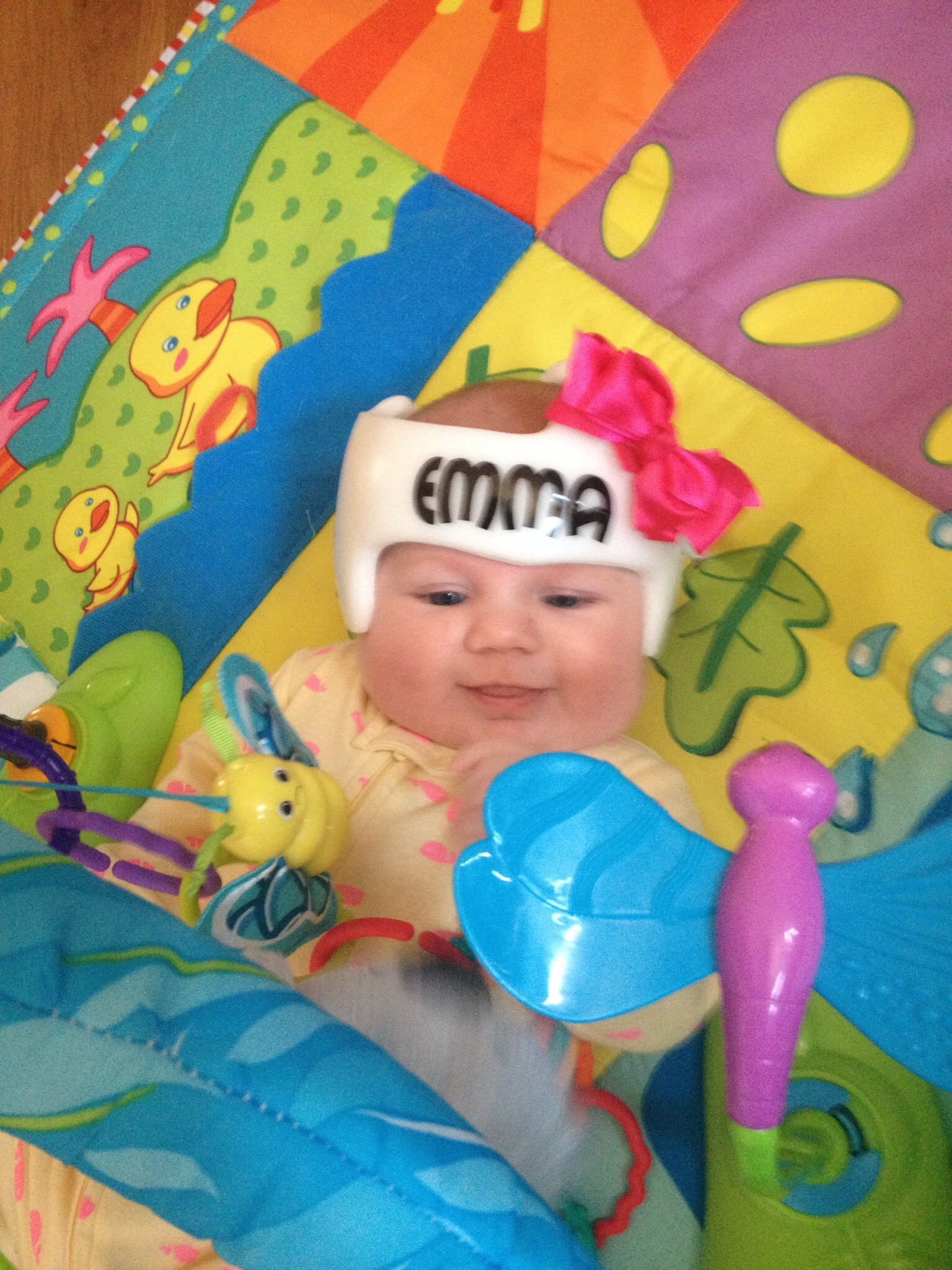 She is doing really well. The first day she was fussing like crazy because she was sweating because the first three days their bodies are adjusting to the helmet keeping heat in. Once we let her be naked she was all smiles. We decided just to go with the helmet at two months so it would be off by summer in about 4-6 weeks. She got the helmet about three weeks ago and it is way easier than trying to constantly position her She actually started rolling a week after she got it and I don't feel like she's limited at all.