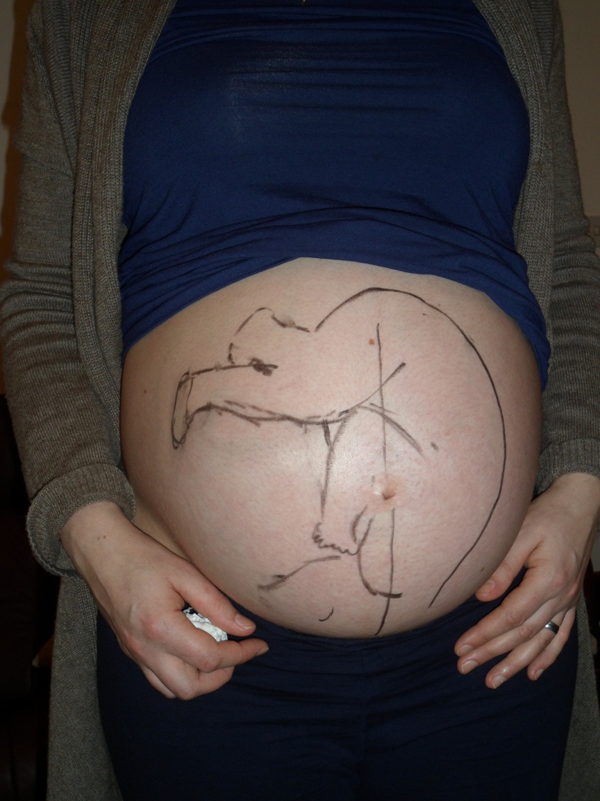 Anyone familiar with "baby mapping" where they basically draw on your belly (or just tell you) what position LO is in? I've been feeling what must be either a butt or a head in the upper left quadrant that keeps trying to burrow its way out and it's driving me nuts not knowing which one it is. It's huge, so you can definiltey feel it with your hands, so I don't think LO being too small would be a problem. Anyone had this done? Anyone given any info from your provider about this stuff? Here's a pic of what I'm talking about: <img src="