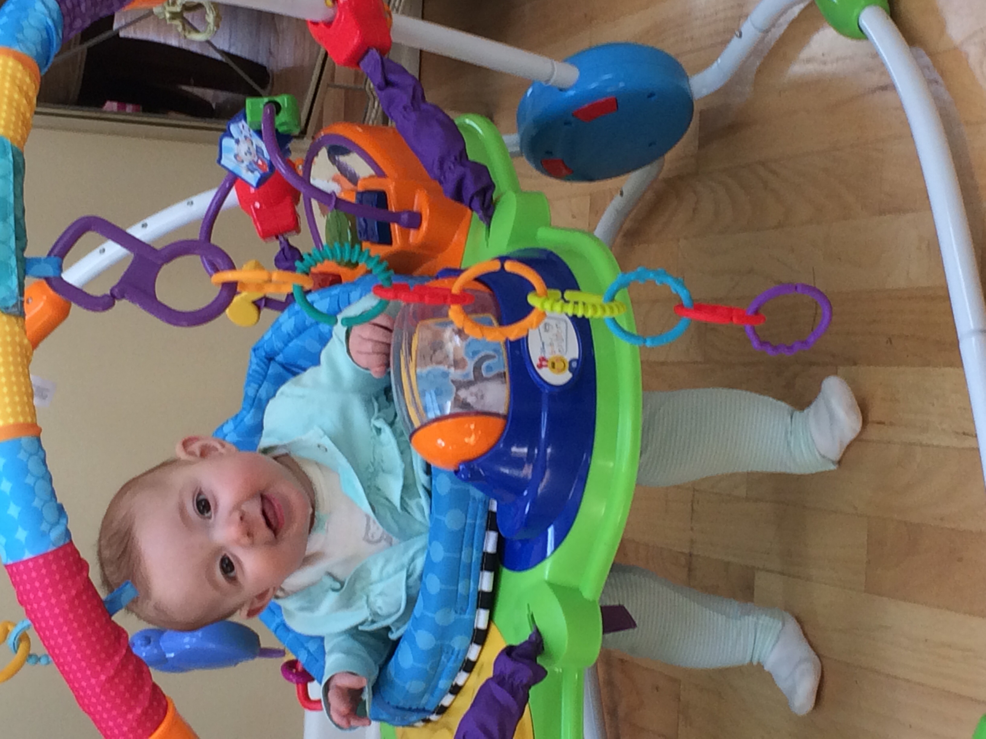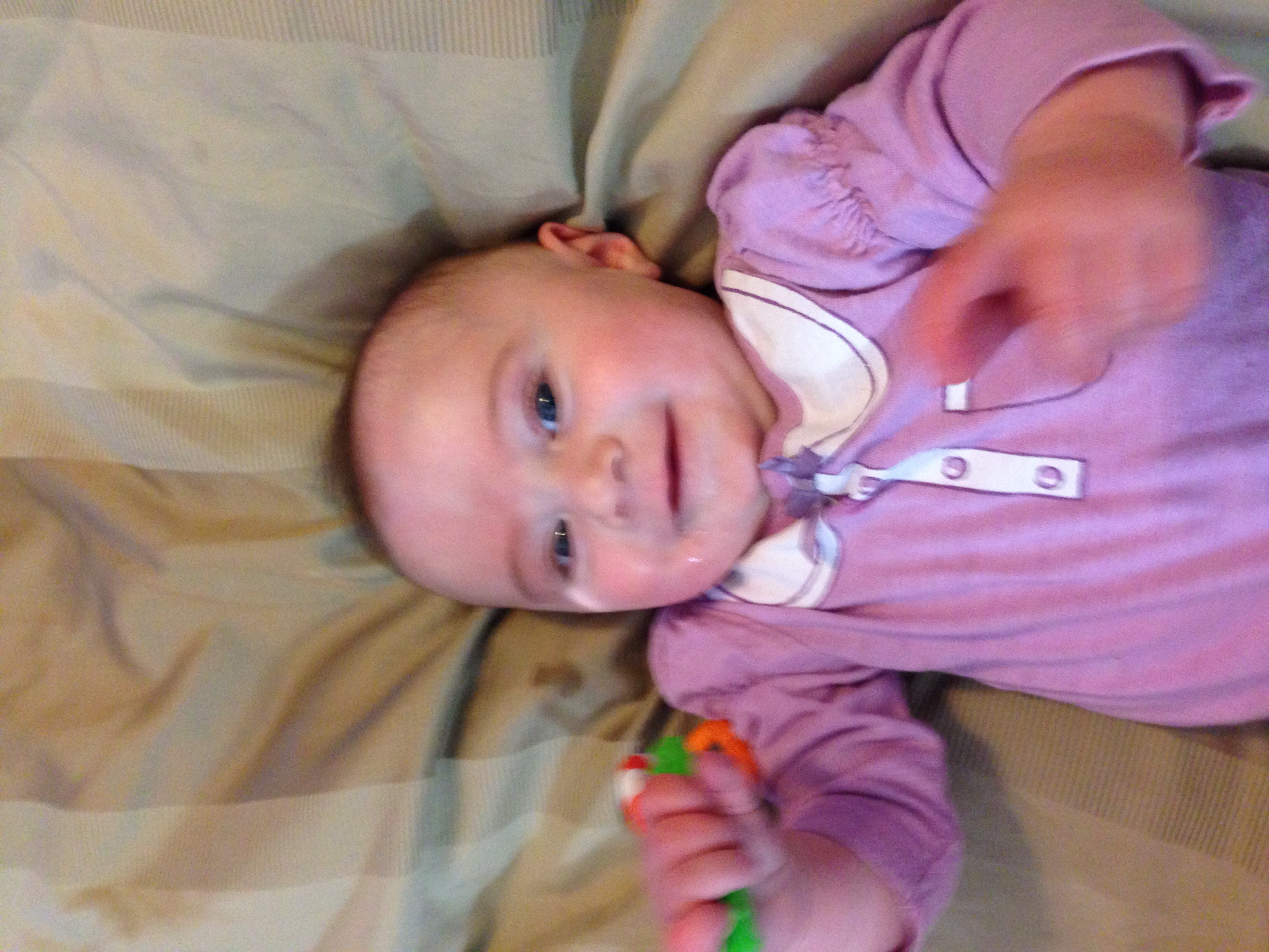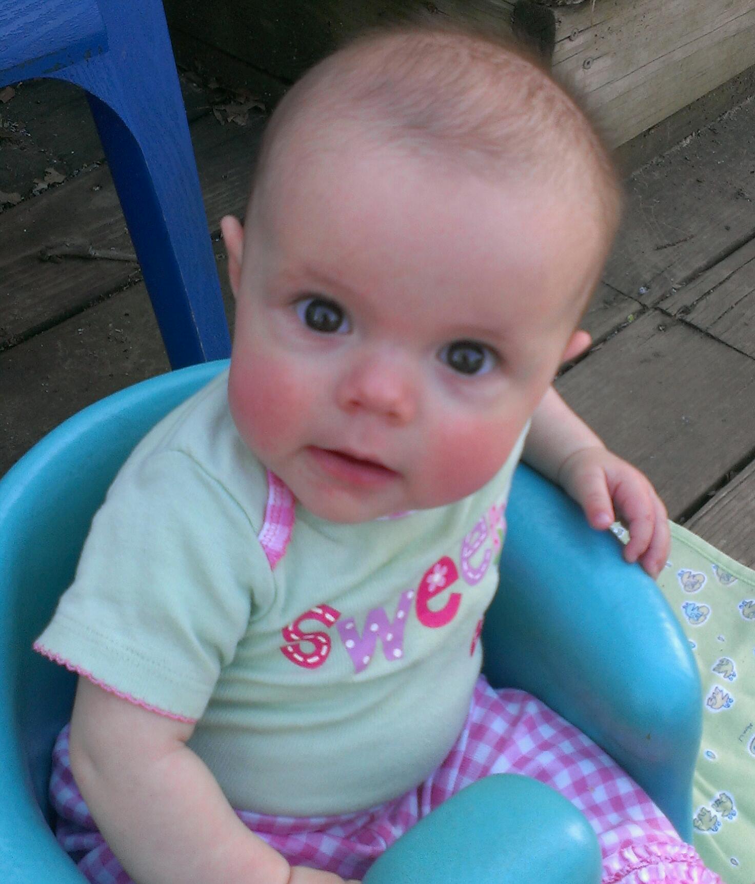 L is now 4 1/2 months old. The picture is from right now, she's hanging out chatting away while I eat breakfast. We are going to go be "supervisors" for my brother's Eagle Scout project this morning (they have to have an adult over 21 there).