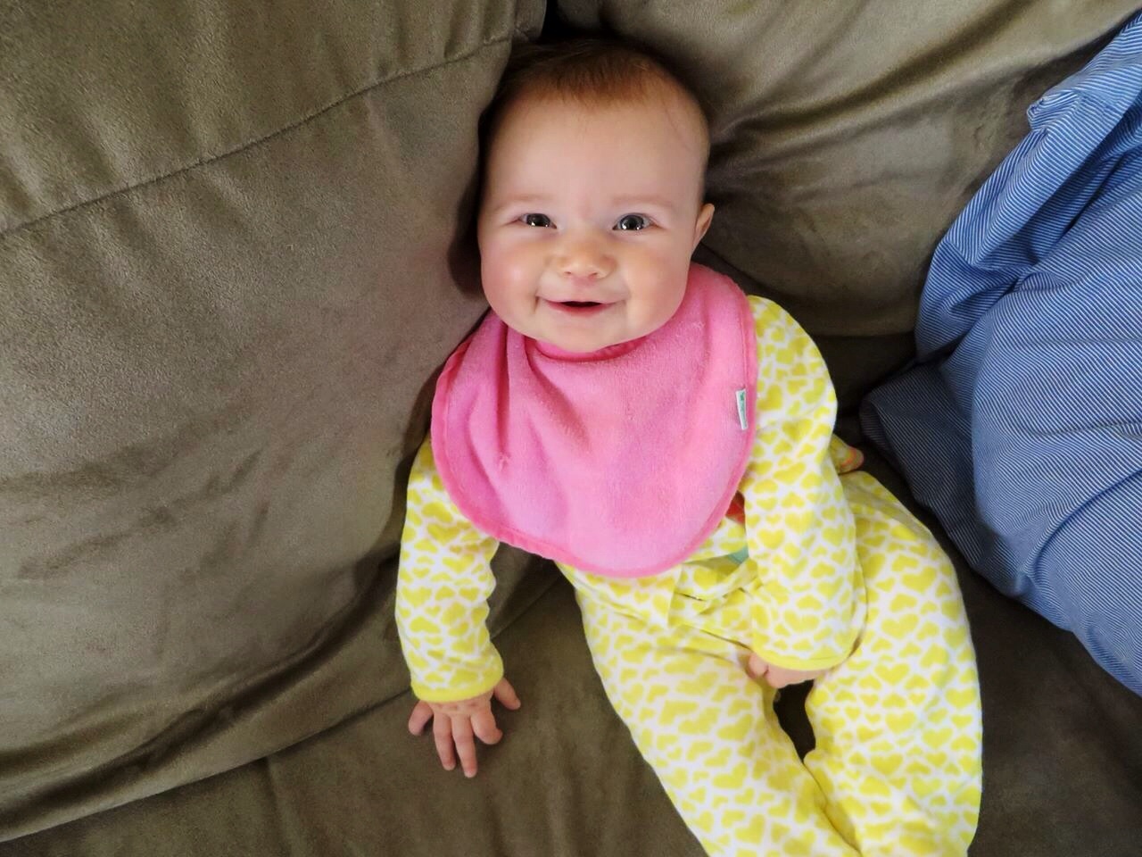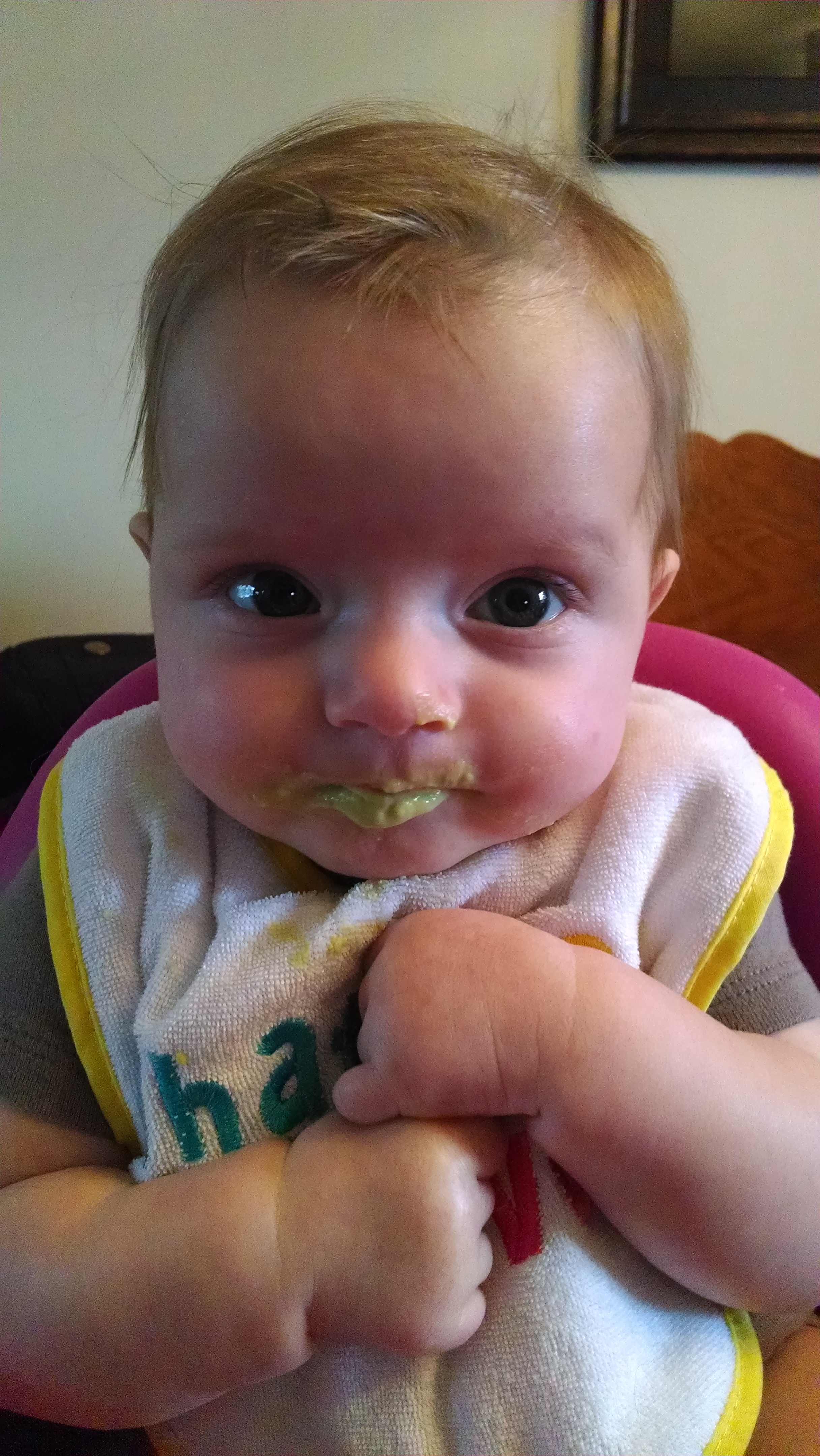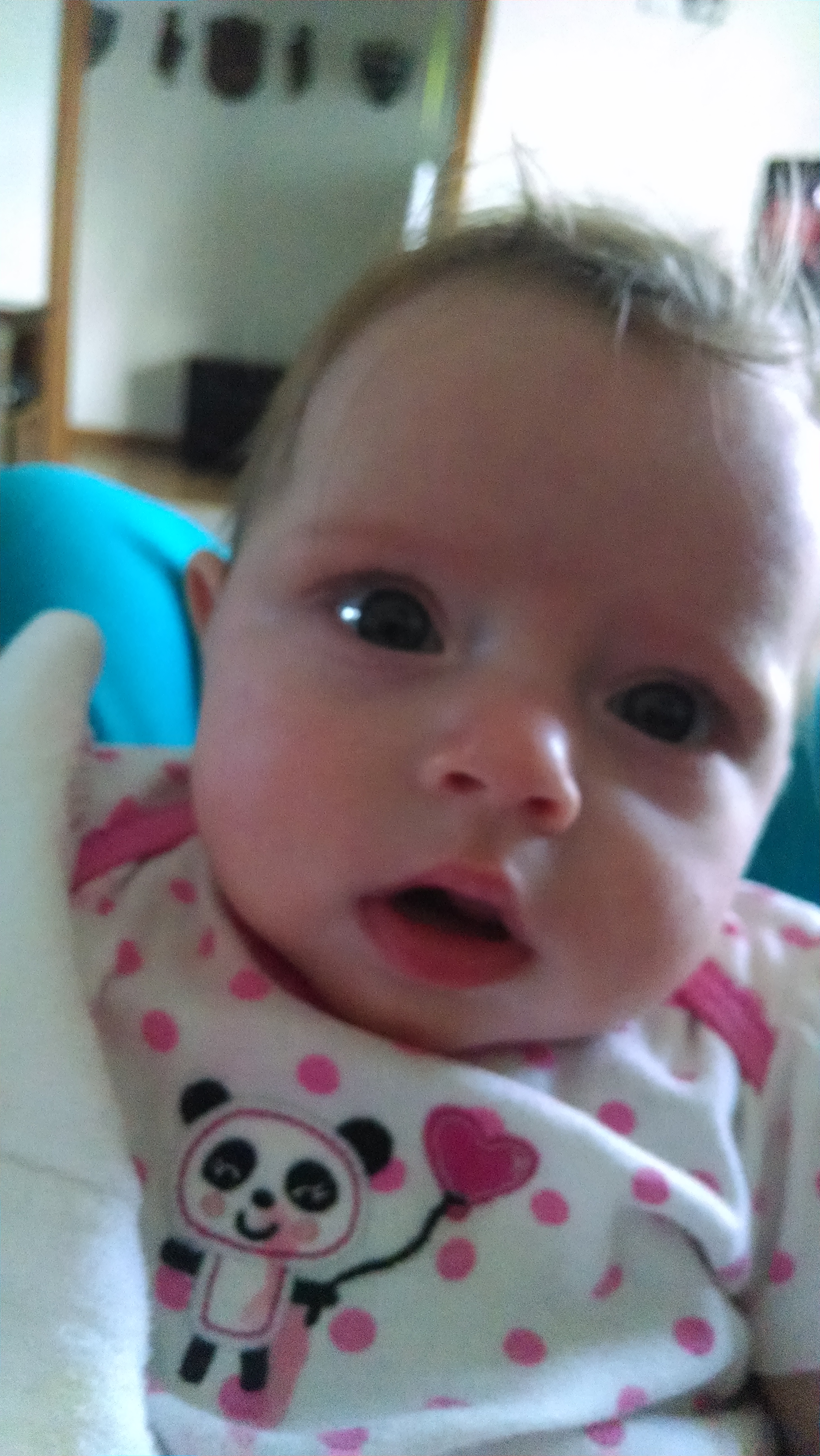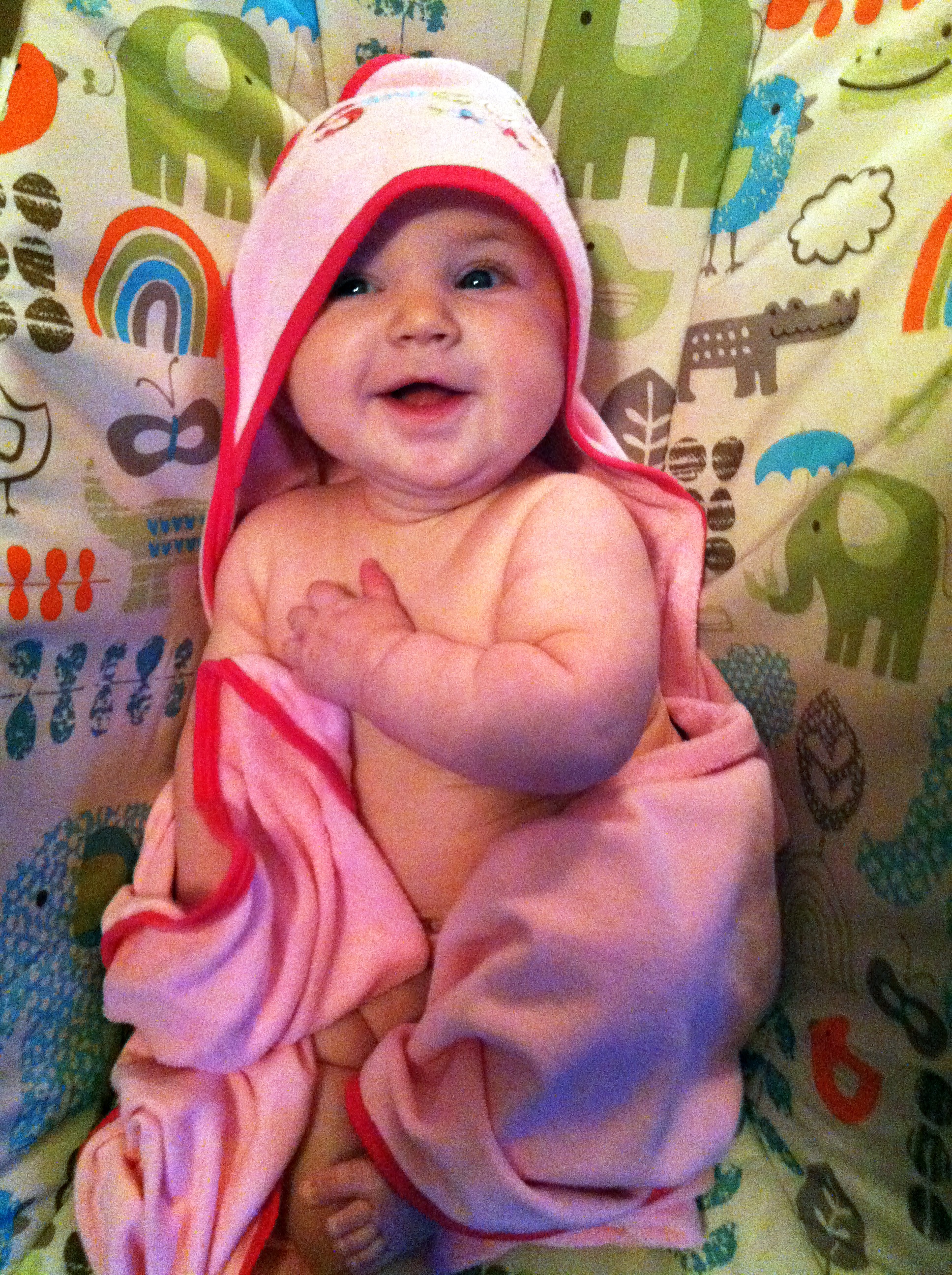 L is now 4 1/2 months old. The picture is from right now, she's hanging out chatting away while I eat breakfast. We are going to go be "supervisors" for my brother's Eagle Scout project this morning (they have to have an adult over 21 there).