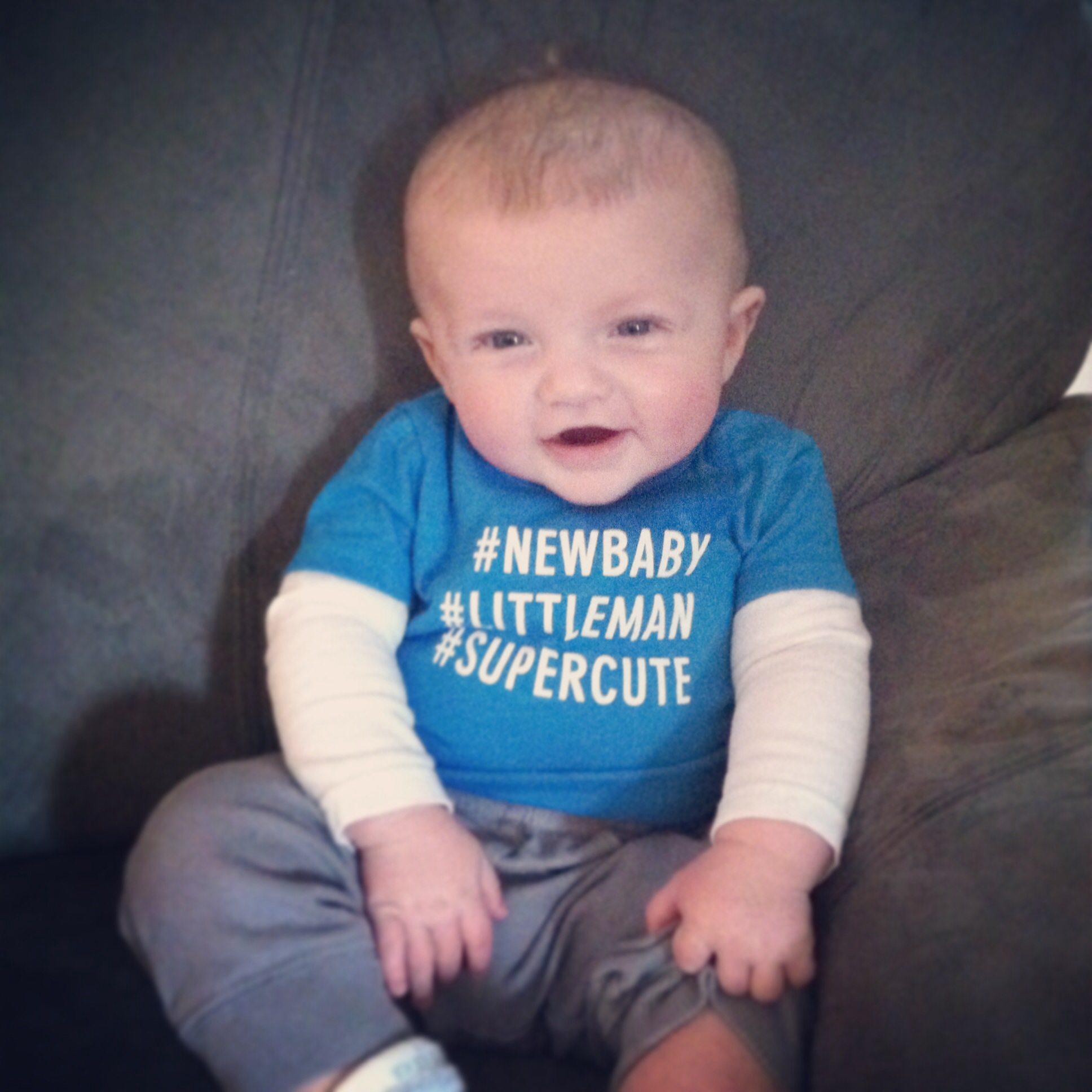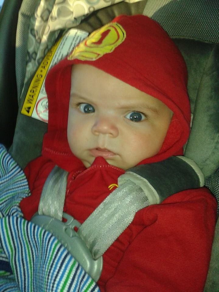 Here's Little Man B sporting his mom, please stop taking pictures look...but he was a firefighter! What's a mom to do? Had his 4 month b-day on Monday!