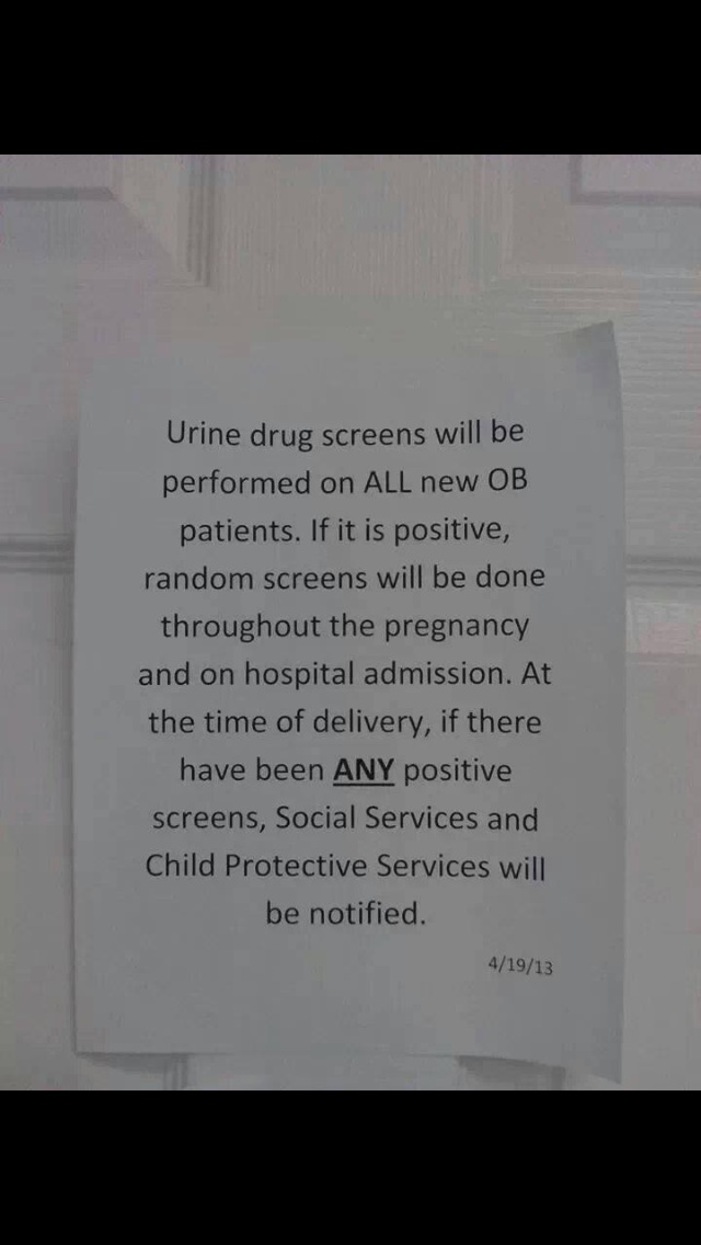 i have no problem with this sign except it might scare away women who use drugs from getting proper pre natal care. it might help scare straight some women who use recreational drugs but for hard core drug users hopefully this will get them the help they need as opposed to going to another office. maybe this policy should be discussed with the patients instead of putting a sign on the door…kind of tacky.