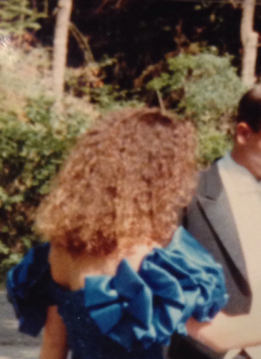 This is an old pic but it's of the back of my head. My hair is this curly but now comes down to prob where my dress would be in this pic.