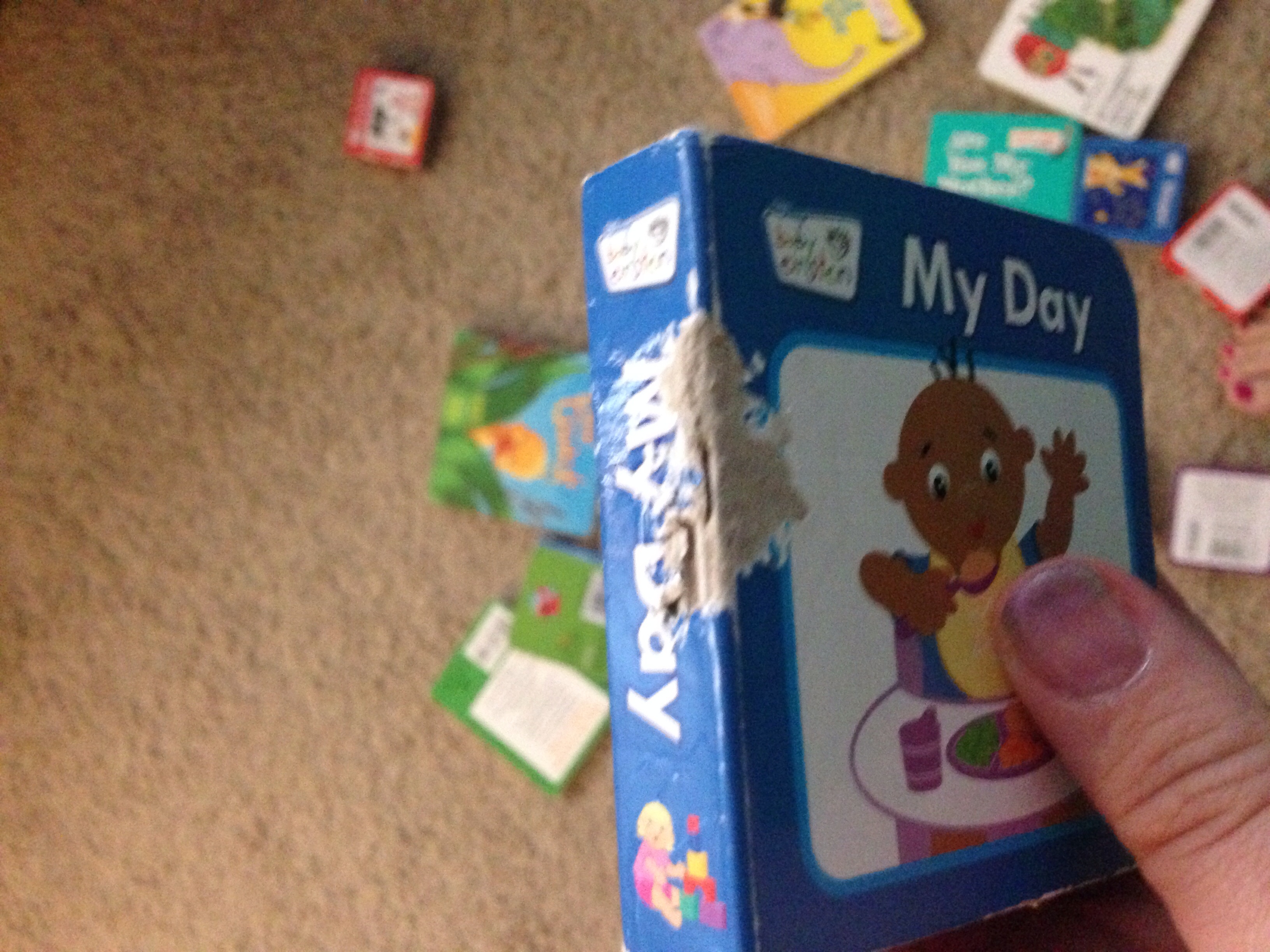 DD has about 20-30 little board books that we have had out with her toys since she was about 6 months old. She will grab them and bring them to us to read them to her. And we read them many times in a row. However, in the last 2 months they have become more of a teething toy than anything. So we have had to take them away. But it try to grab a few everyday and read them to her. I also love Dr Suess books and will read the nonboard ones to her. Here is what one looks like after she starts on it.