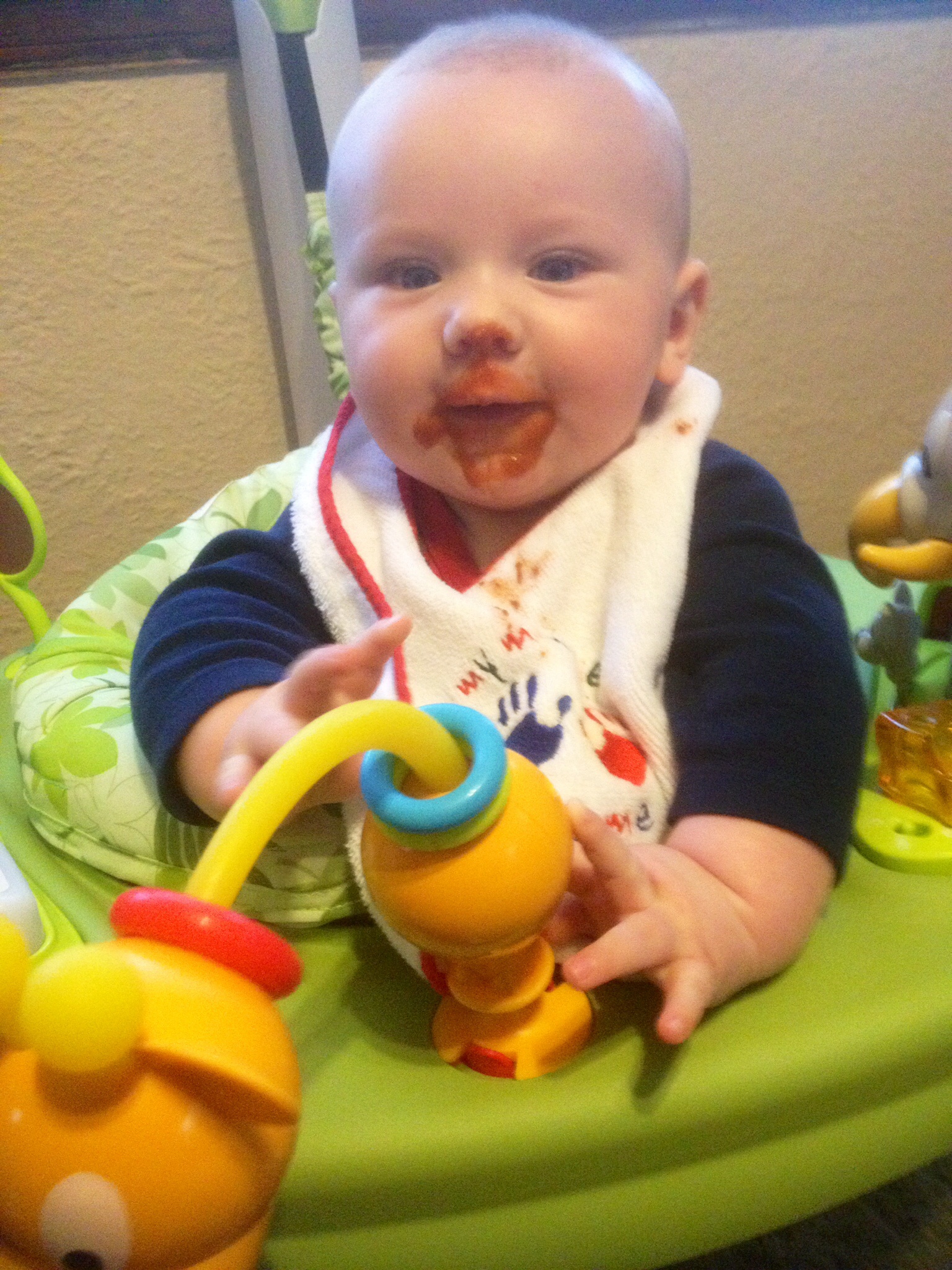 I thought about giving him water this weekend, but didn't happen. Ah, well. I've been reading more from the BLW book. So weird to me to think about him starting solids in just 5 weeks or so. I have a feeling he will do more playing/exploring with food than eating for a month or two after we offer, which I know is normal. It will definitely change our well-established evening/morning routine during the week, which I'm a little anxious about, but I know we'll adjust again.