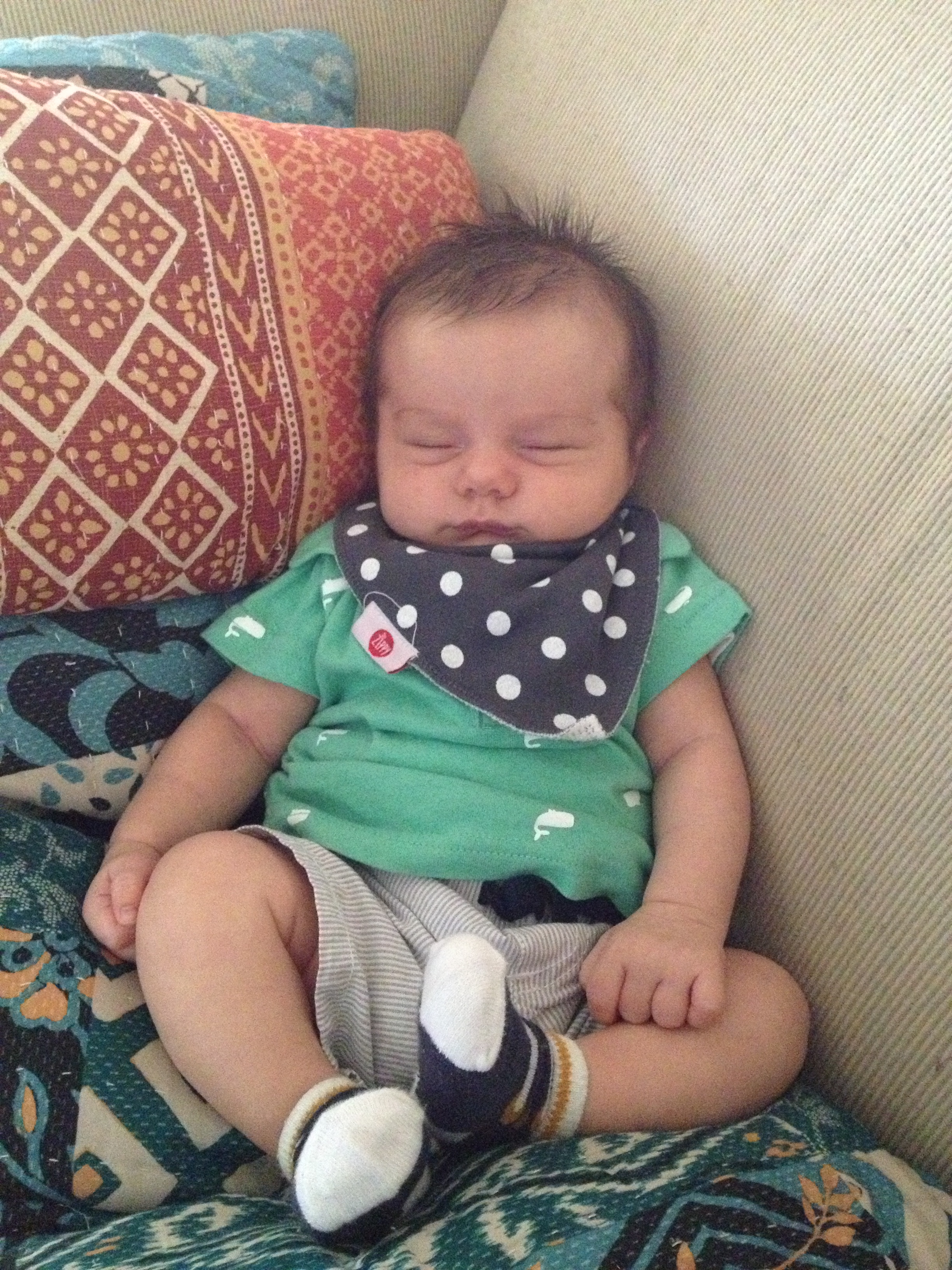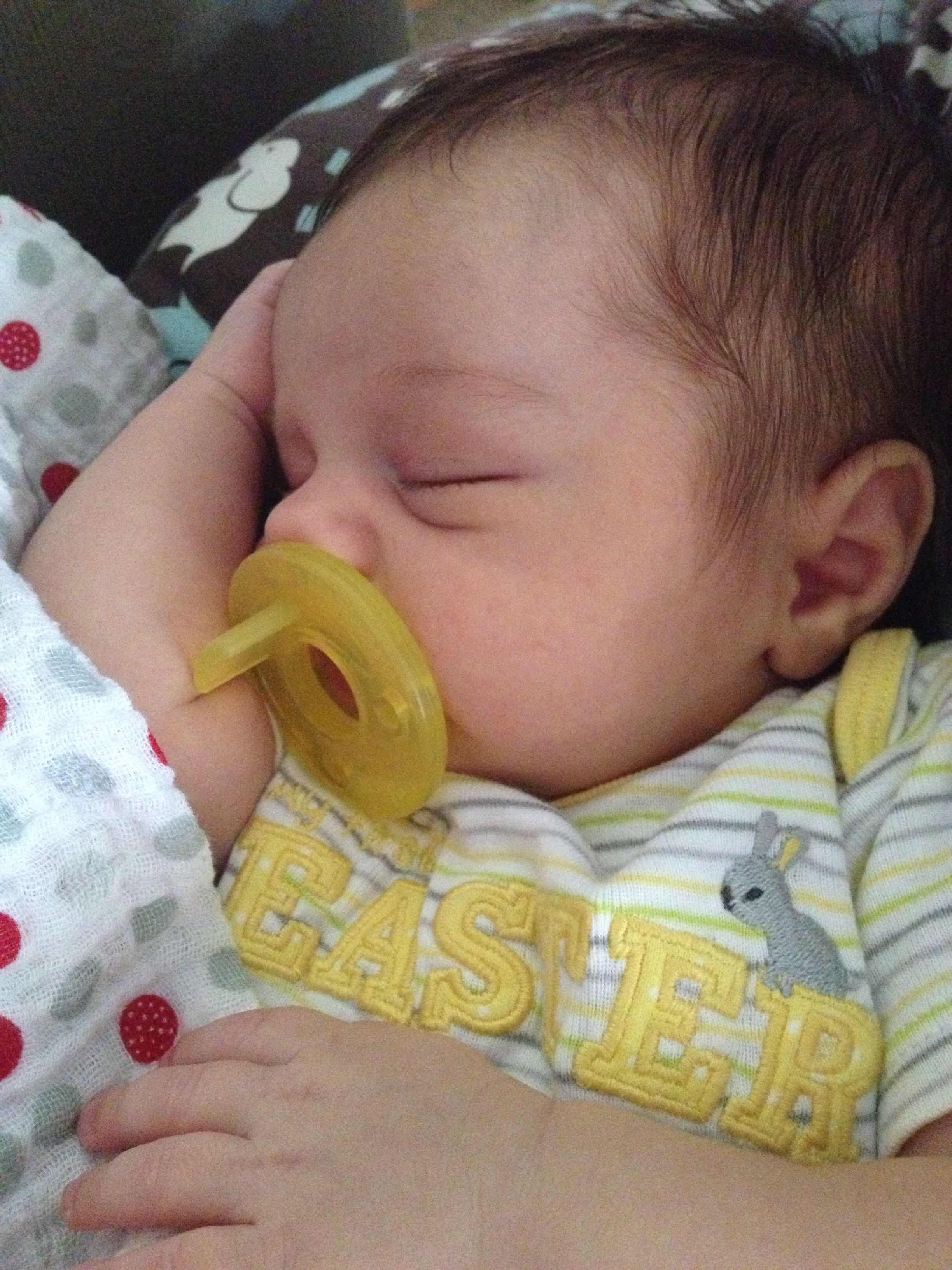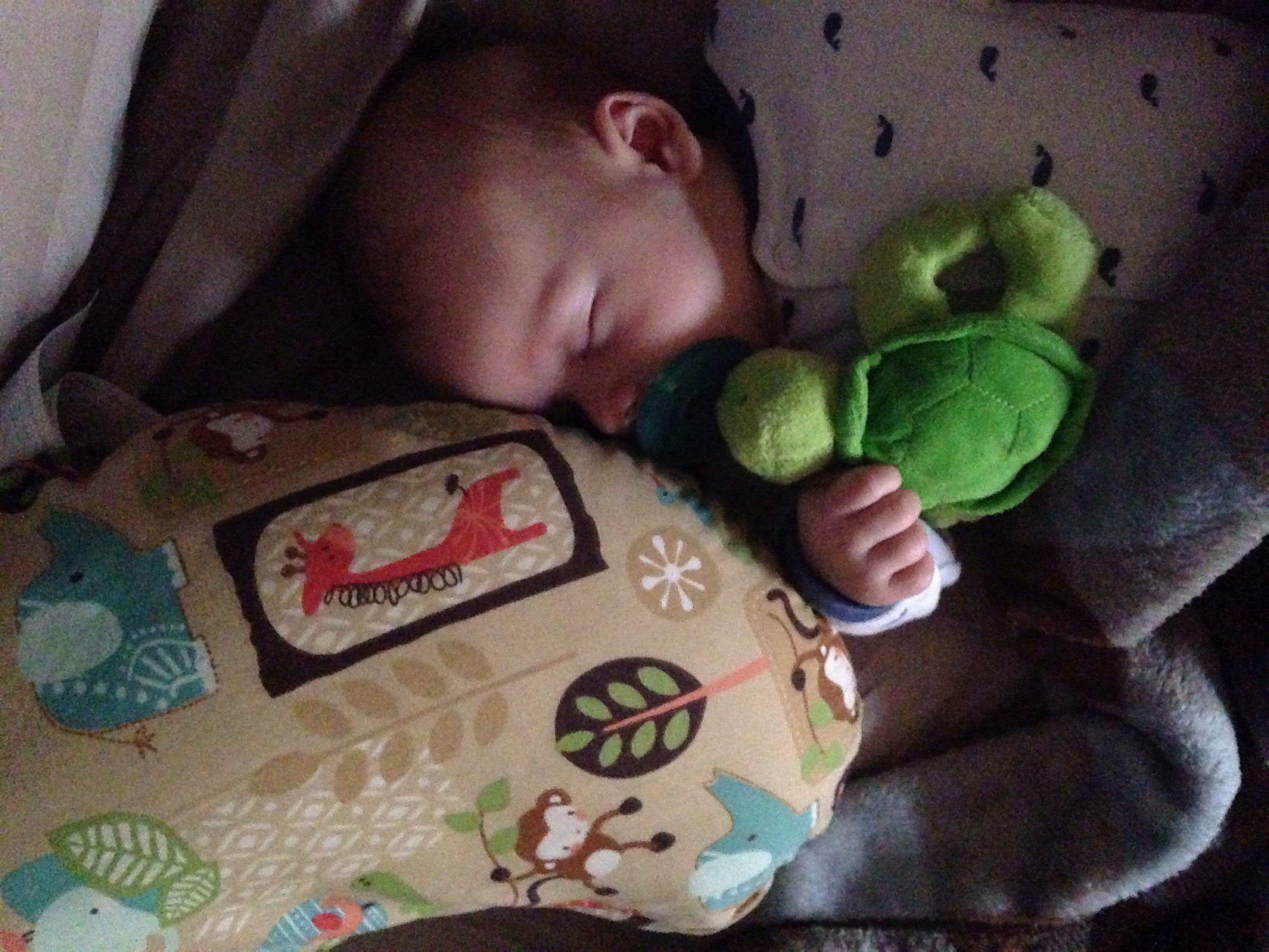 First one is whole mommy and daddy ate dinner. I love how he holds onto his wunnanub! Second is this morning. I laid him in the middle of the bed and went out to get my pumping stuff. When I came back he was snuggled against the boppy lol