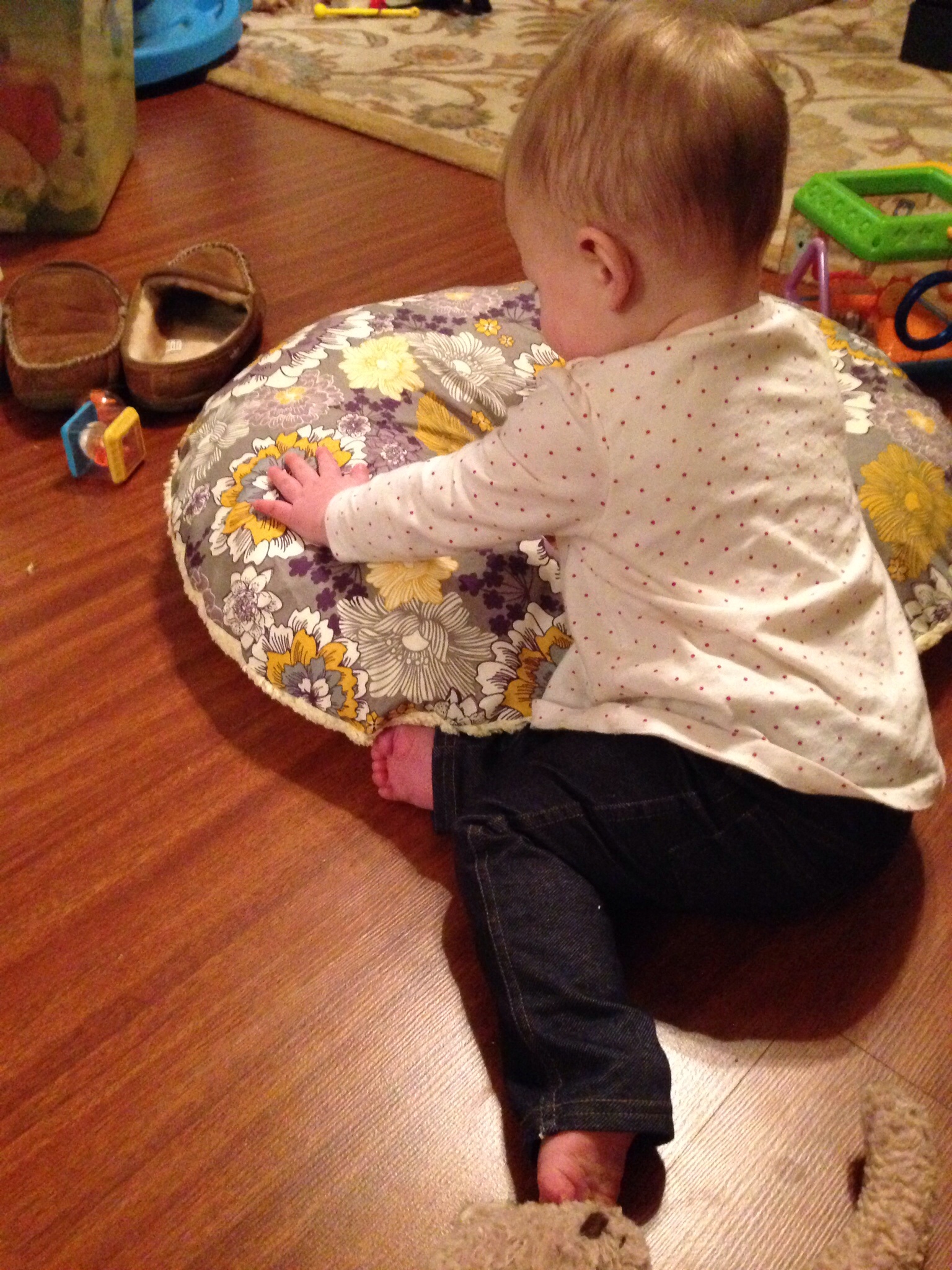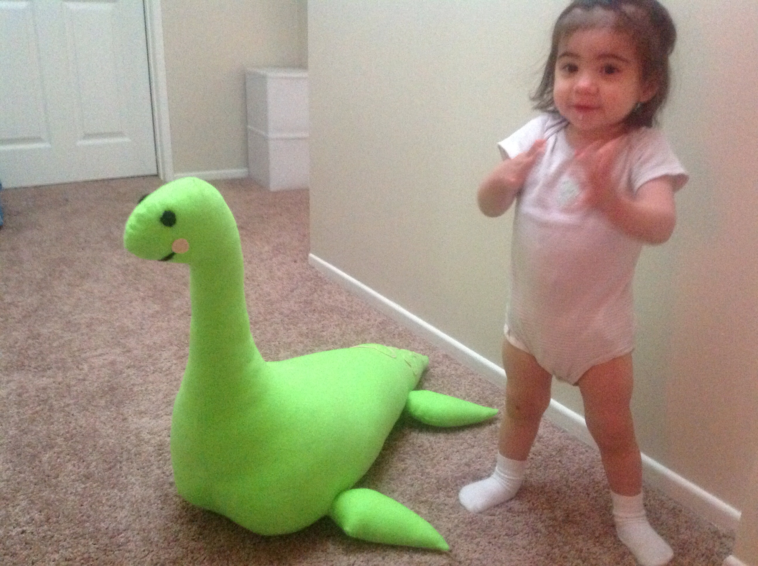 I found instructions for a stuffed Loch Ness monster and I thought it looked fun! It was a little challenging attaching the flippers, but O seems to enjoy her "Britta" or "Reggie" .. I'm not sure what she's been calling it.