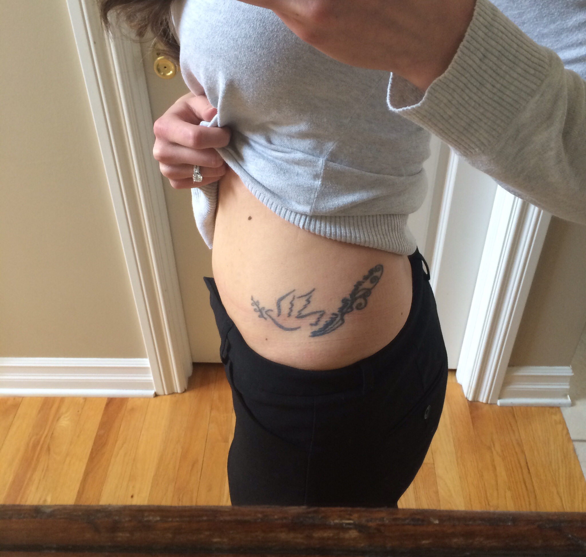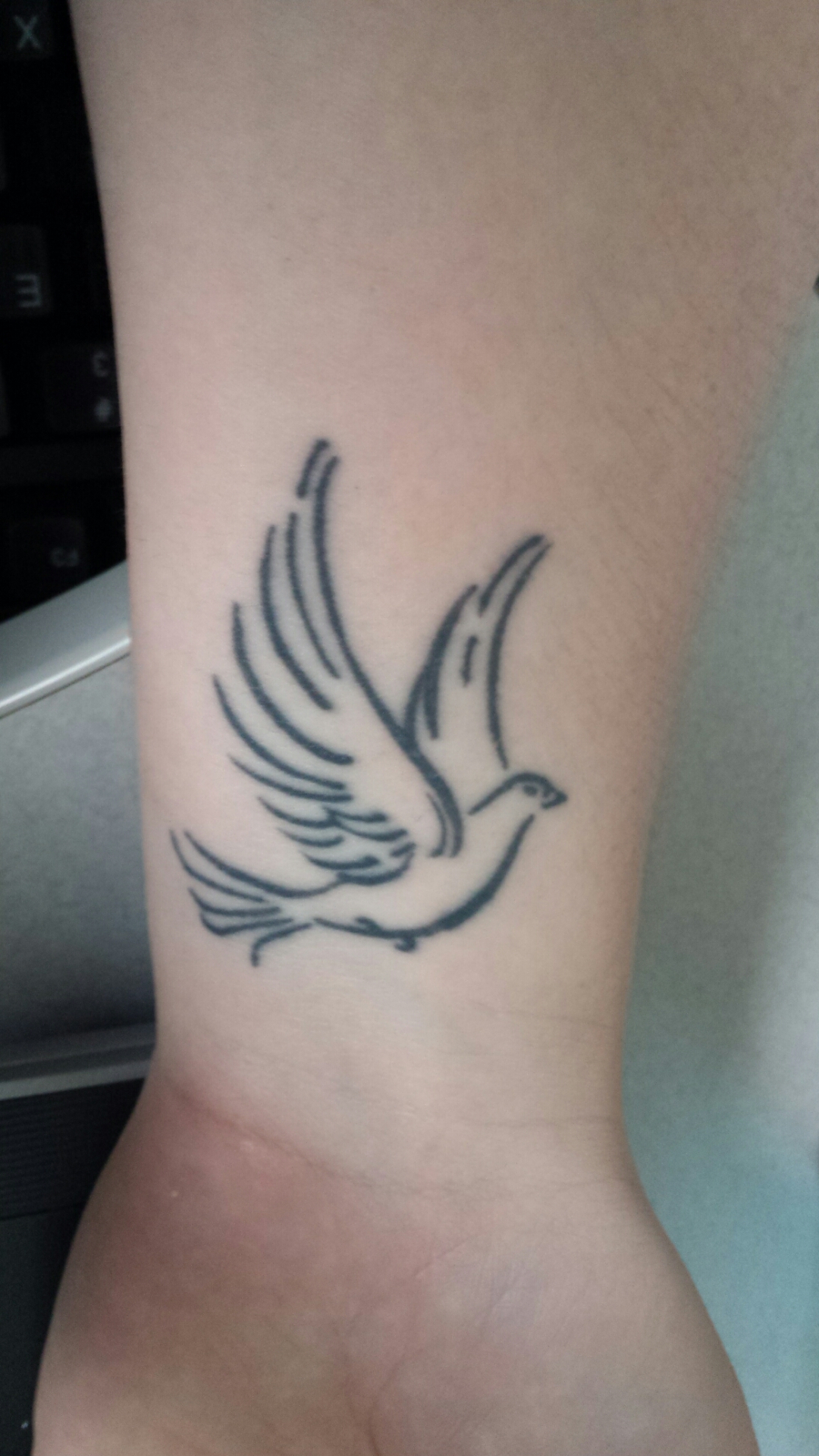 @bcogil86‌ Here's my dove! I got it because of the peace symbolism too. There's Latin script behind the dove's tail that says "pacis mens, pacis universum". It means peace of mind, peace in the universe. I was in my third year of college, majoring in psychology, and very into meditation and mindfulness.