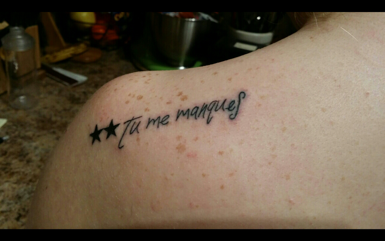 • My newest ink - my memorial tat. I have 4 tattoos total, but this is the only one I have a photo of on my computer right now.  It says "You are missing from me" in French, and the two stars are for the twins I lost in December.