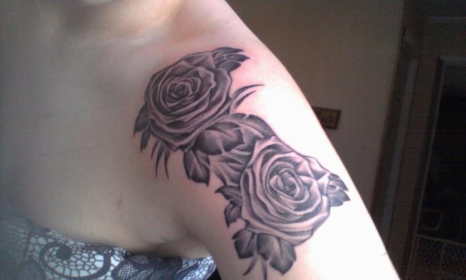 This was taken after the whole thing was completed, you'll see the right side is darker than the rest but that's because the rest had been done in separate sessions so those were more healed.  It's all gray/blacks except for just the flower pedals are a light pink for a hint of color.